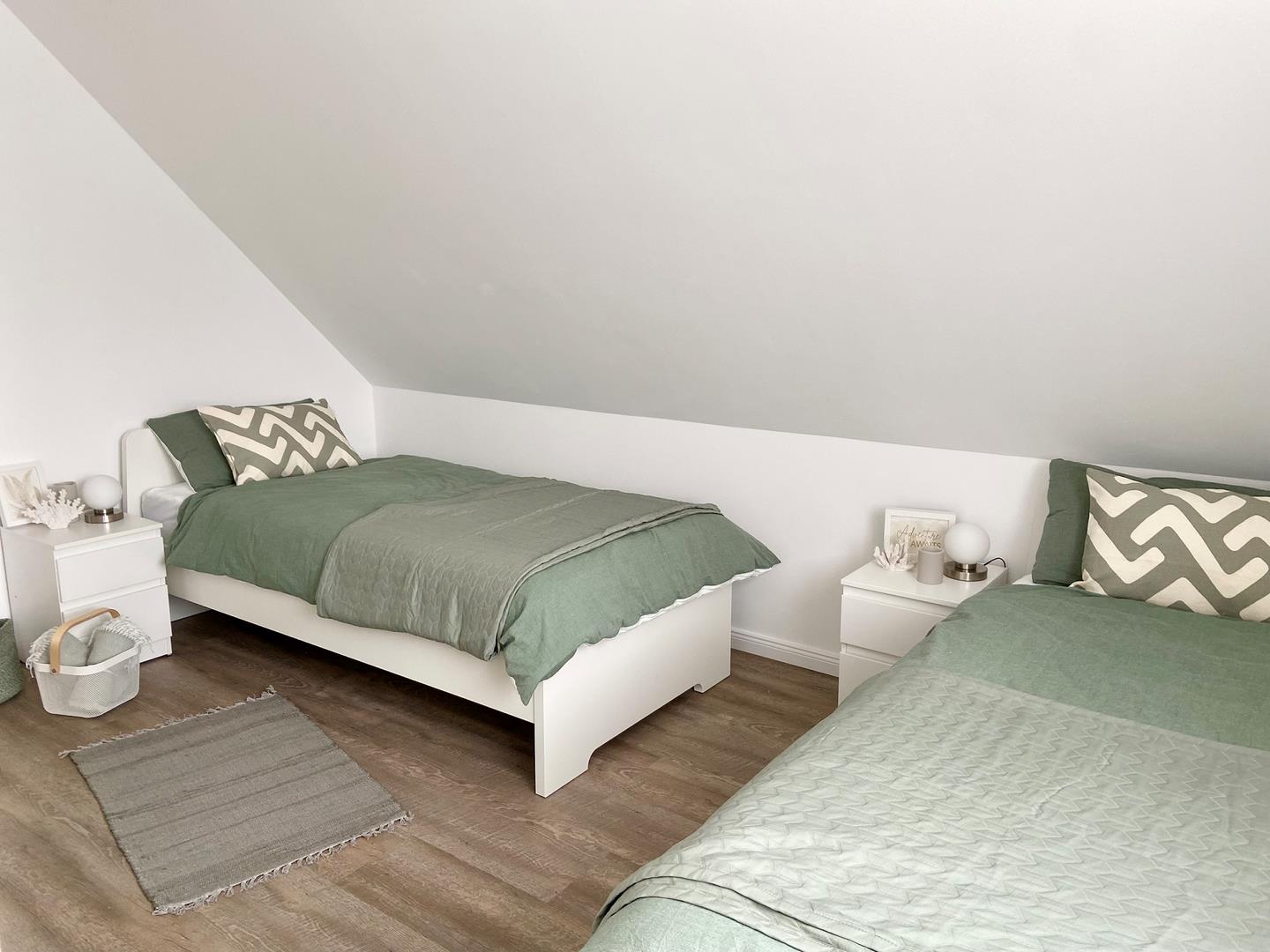 Über eine offene Holztreppe gelangen Sie ins Obergeschoss. Hier finden Sie drei Schlafzimmer, zwei davon mit Doppelbetten und eines mit zwei Einzelbetten ausgestattet. Das größte der drei Schlafzimmer verfügt zudem über einen Schreibtisch mit LAN-Anschluss, falls doch einmal eine Arbeitssitzung eingelegt werden muss.