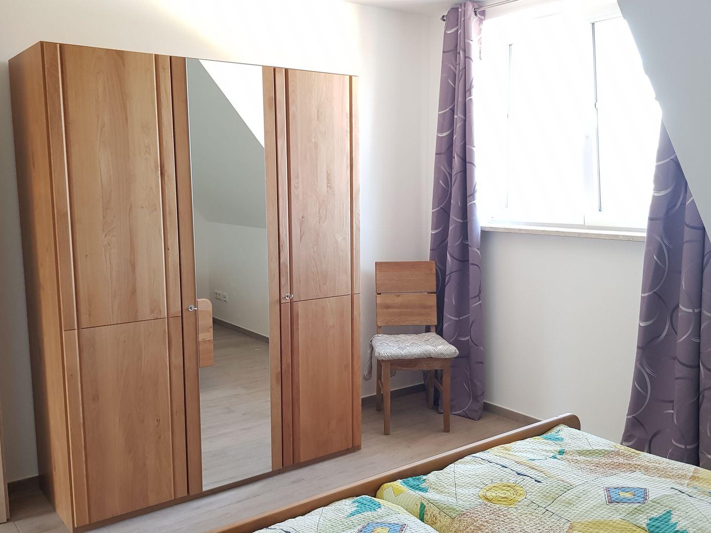 Schlafzimmer mit Doppelbett (180 cm), Kleiderschrank, Tresor