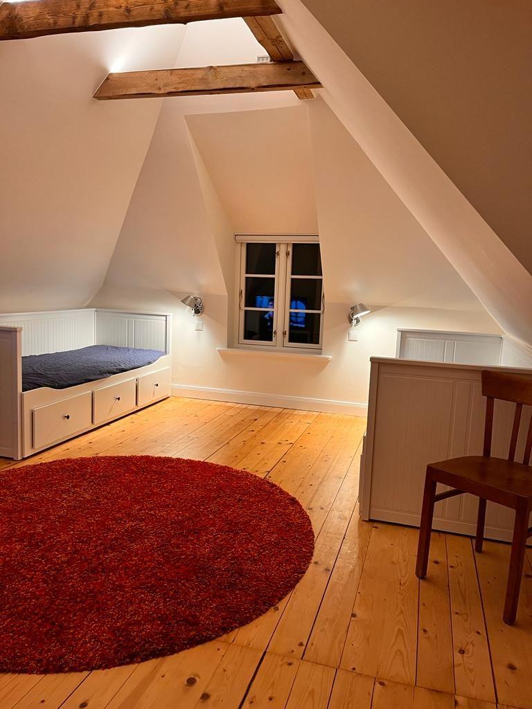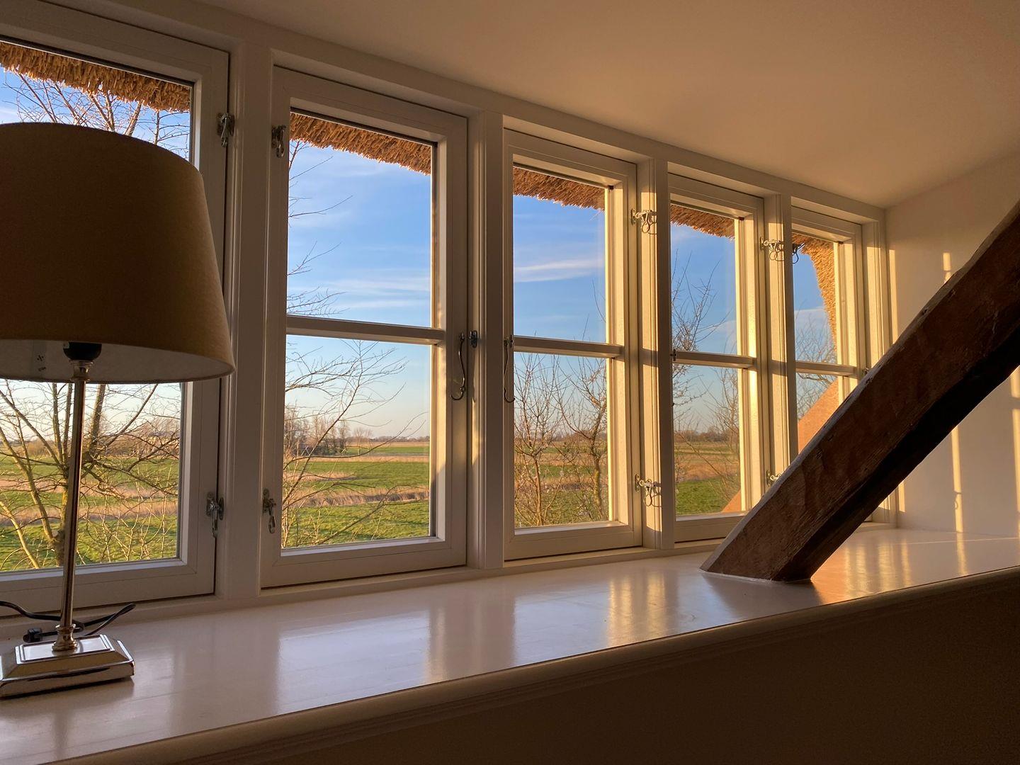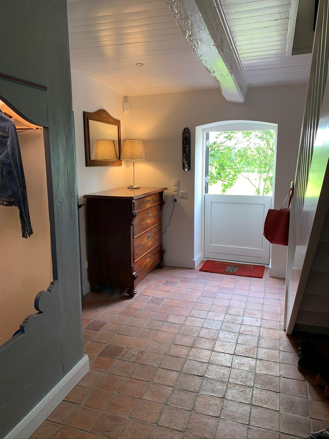 Bis zu 3 Familien passen im großen Wohn-Esszimmer an die lange Tafel. Gemütliche Sofas vor dem großen Kaminofen laden ein zum Gespräch, ein Buch zu lesen oder ins Kaminfeuer zu schauen. Behaglichkeit pur! Ein Blick aus den dänischen Holzfenstern auf die umliegende Landschaft mit Kühen, Schafen und Lämmern lässt die Seele einen Gang runter schalten. In den Wohn- und Schlafzimmern wurde klassischer Dielenboden verlegt. Die Küche lässt das Herz eines Hobby-Kochs höher schlagen und ist mit einem extragroßen Herd, Spülmaschine und vielen Utensilien ausgestattet.