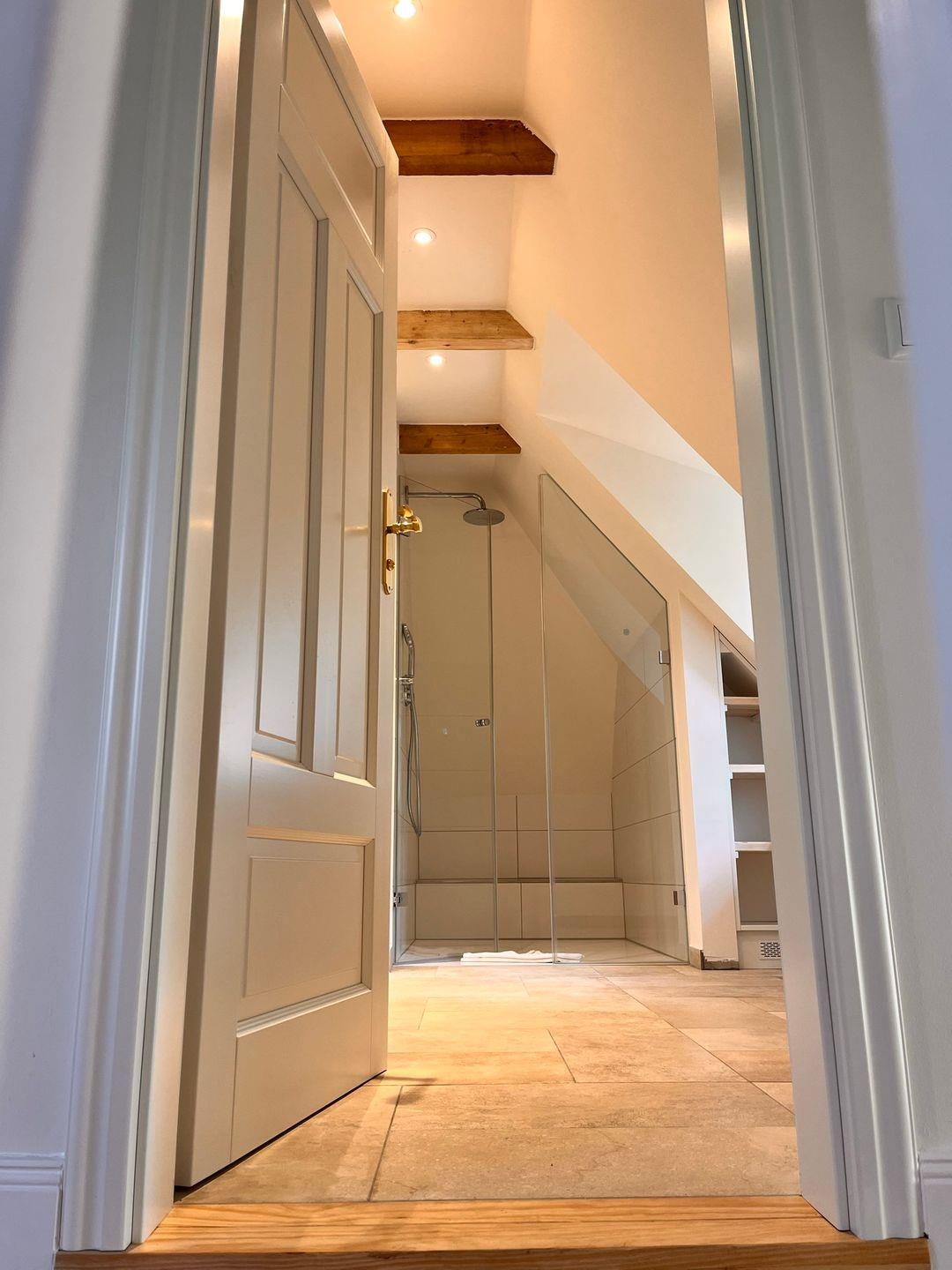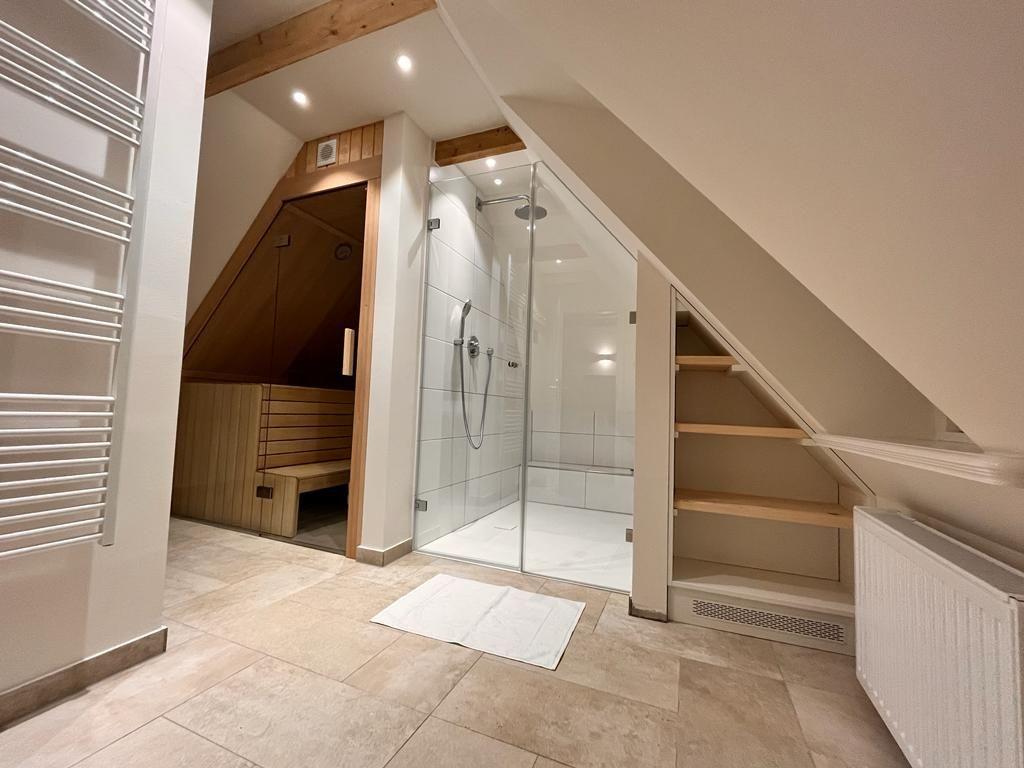 Insgesamt verfügt das Haus über vier Doppelschlafzimmer und ein großes Kinderschlaf- und Spielzimmer mit zwei Kojenbetten. Das Bad im Erdgeschoss verfügt über eine bodentiefe Dusche und 2 Waschbecken. Das WC ist separat. Im Obergeschoss befindet sich ein weiteres Badezimmer mit einer bodentiefen Dusche und einer Sauna. Das WC im Obergeschoss ist ebenfalls separat.