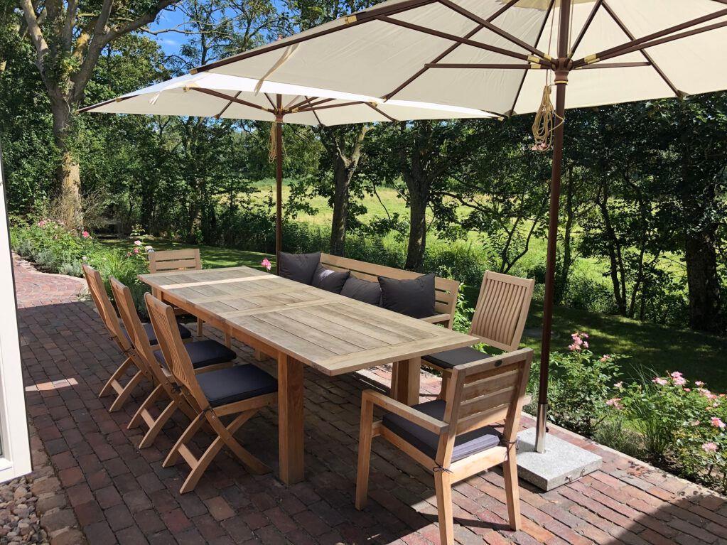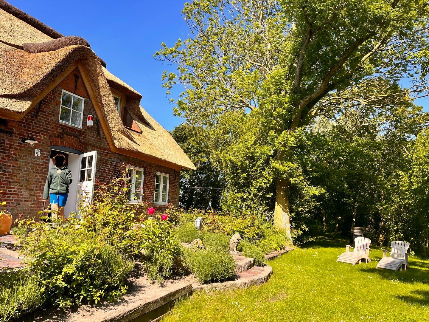 Die Reetdachkate steht längsseitig auf einem kleinen Deich. Den Haupteingang erreicht man rückseitig durch den Garten, welcher an einen wasserführenden Graben grenzt. Der Graben ist frei zugänglich und nicht gesichert. Die großzügige Terrasse ist windgeschützt gelegen. Auf hochwertigen Teak-Möbeln sitzend überblickt man den terrassierten Garten und die angrenzende Rasenfläche. Ein alter Baumbestand sorgt für Schatten und schafft eine zauberhafte Atmosphäre. Adirondack Chairs, Liegestühle und Hängematten runden die Gartennutzung ab.