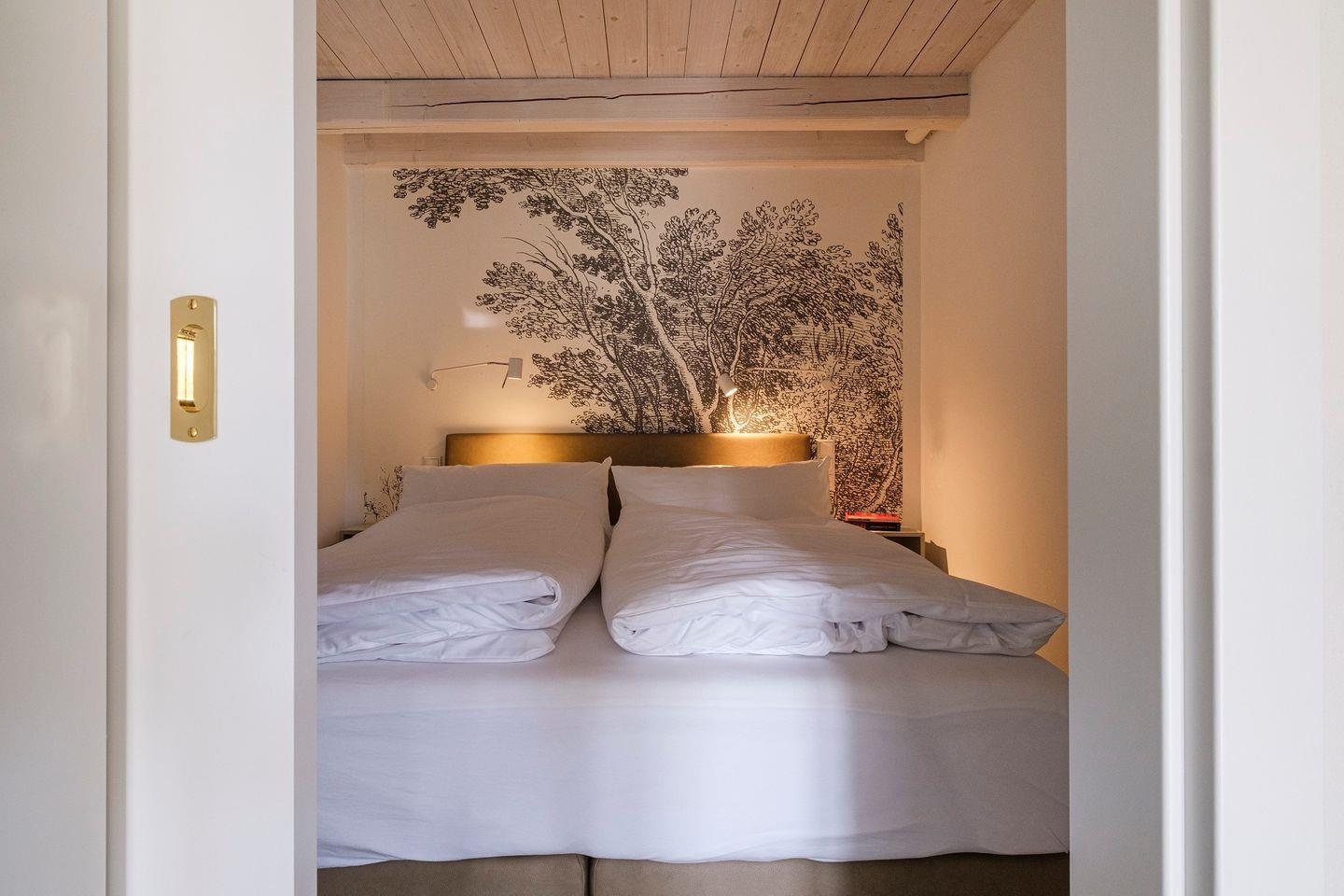 Behagliches Schlafzimmer, Boxspringbett in exklusiver Hotelqualität für hohen Schlafkomfort (160 cm x 200cm), Fenster mit Insektenschutz.