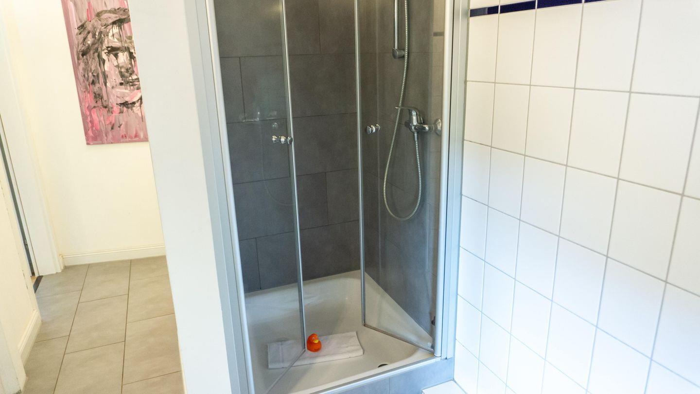 Das Badezimmer ist mit einer Dusche, einem WC, Waschbecken und einem Haartrockner ausgestattet. Ein Kosmetikspiegel rundet die Ausstattung ab.