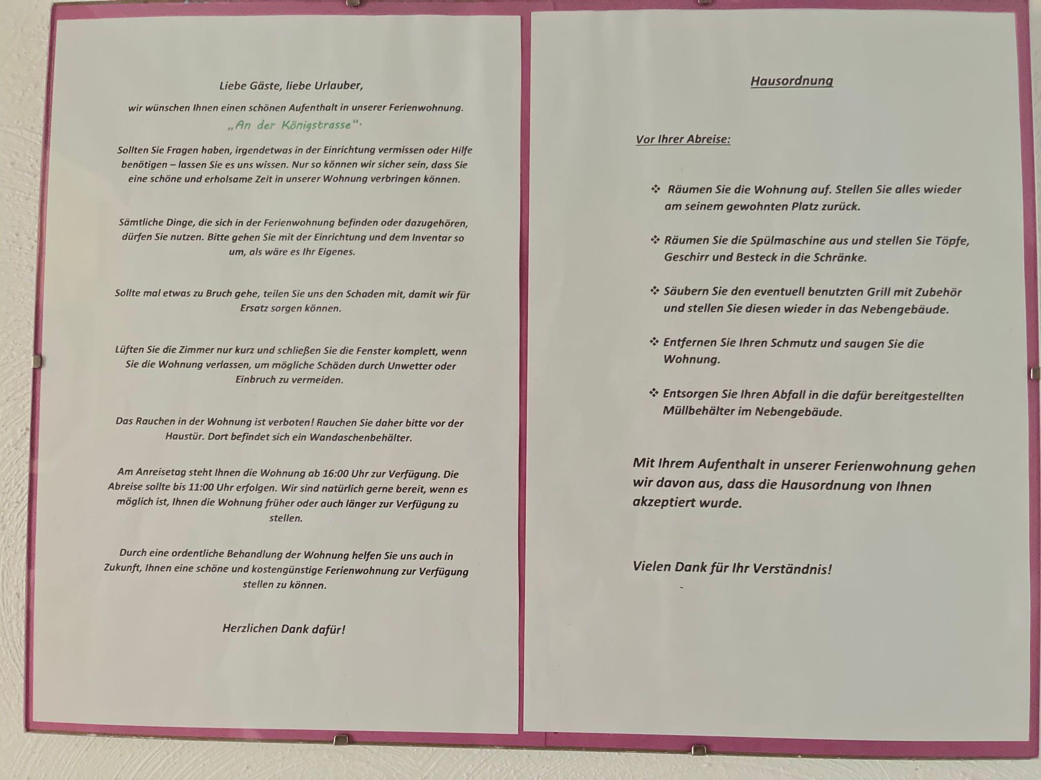 Please leave the flat as you found it. Please observe our house rules, which you will find in the photo and in the flat. Remove any soiling, as only then can the landlord permanently waive a cleaning fee. Fitters always pay a flat rate for cleaning on arrival. You can also order bread rolls from a bread delivery service. Since the landlord lives on the property, you have a direct contact person on site for questions or suggestions, and your arrival time is possible from 2.00 pm. The flat is available to you on the day of departure until 12.00. Since the front door is equipped with a code lock, please ask for the code shortly before your arrival if no information has been sent by the landlord by e-mail 2 days before arrival.