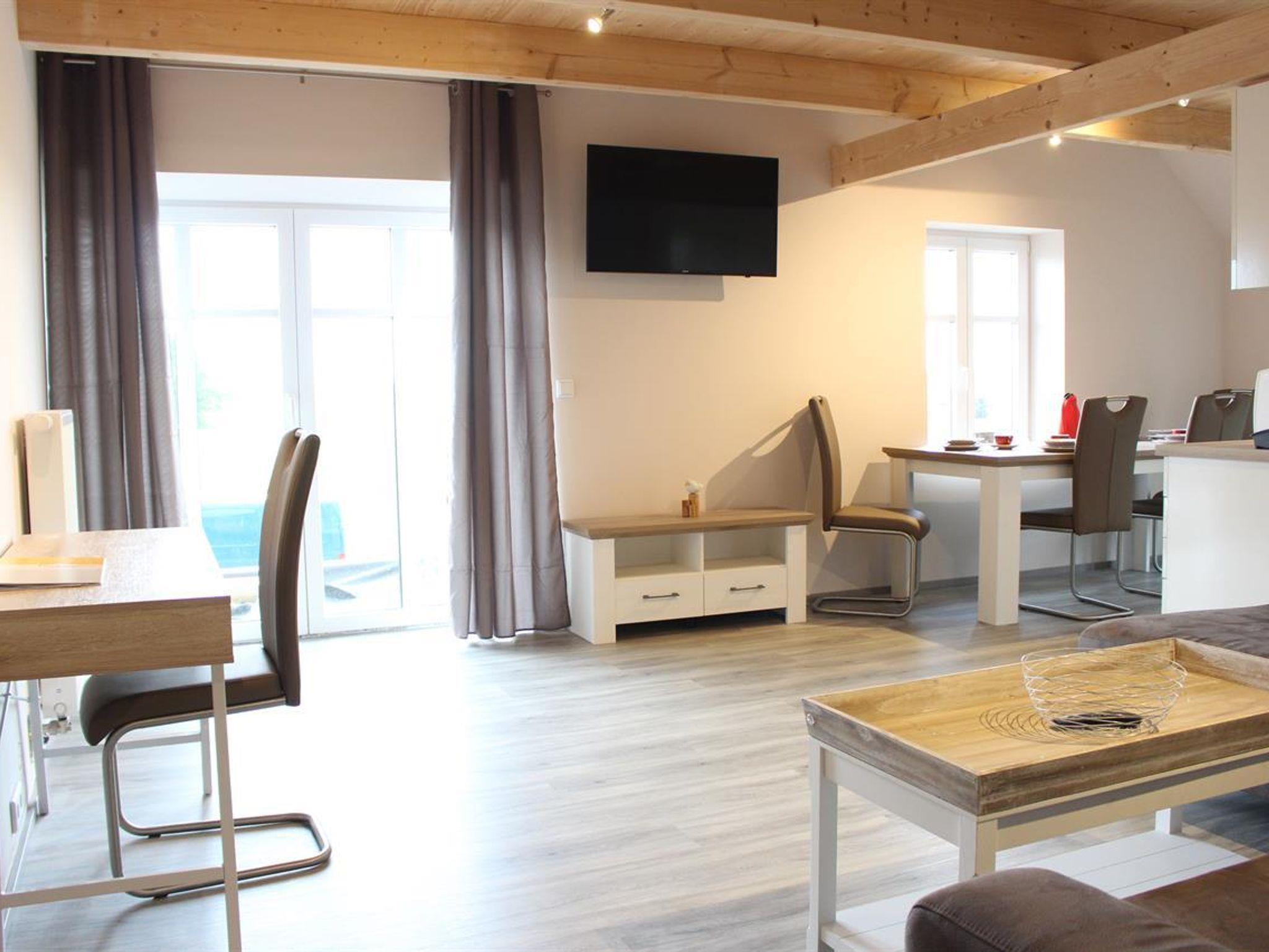 Großer Wohnbereich mit Couchlandschaft, SAT-TV, DVD-Player, einem kleinem Arbeitsbereich, Essgruppe und einer komplett ausgestatten Küche, inkl. Geschirrspüler.