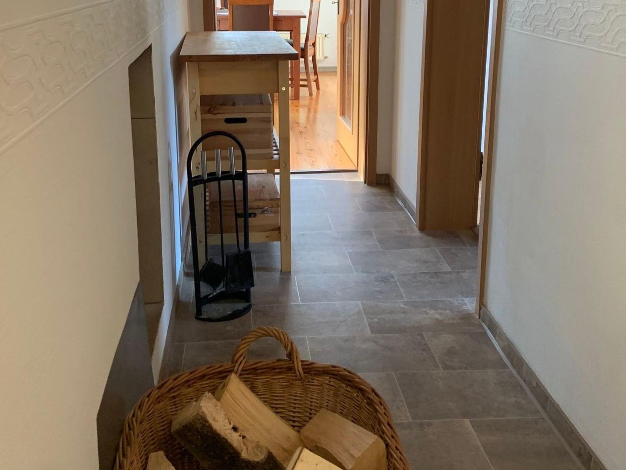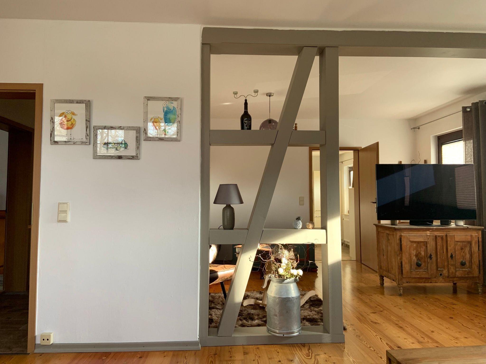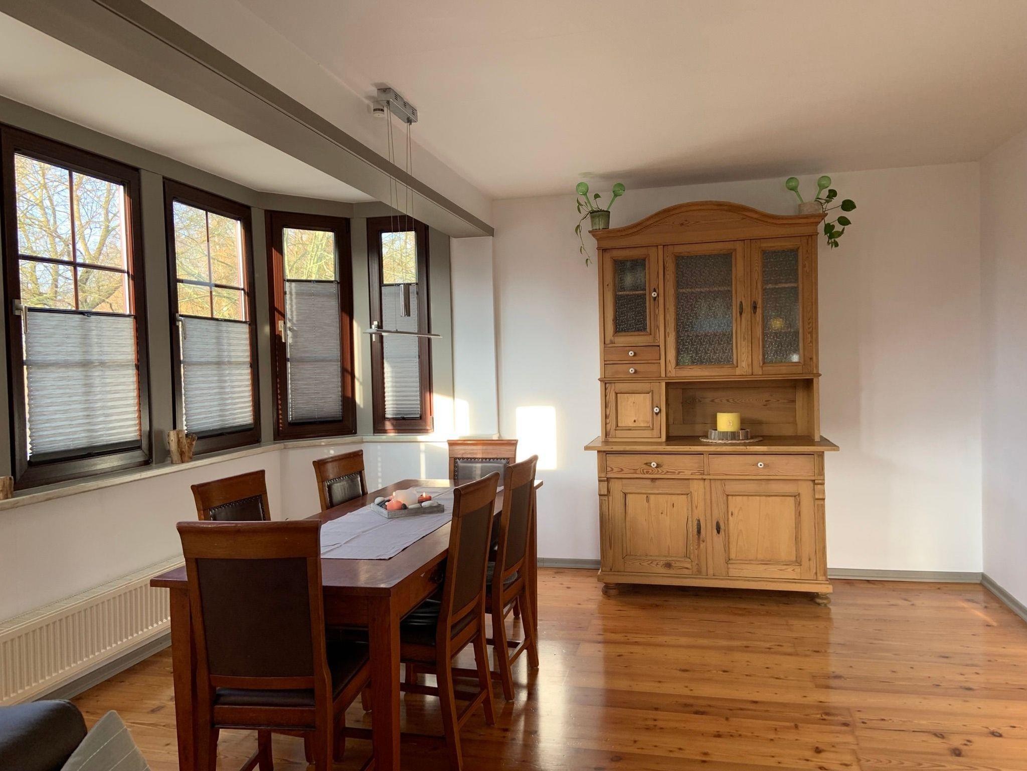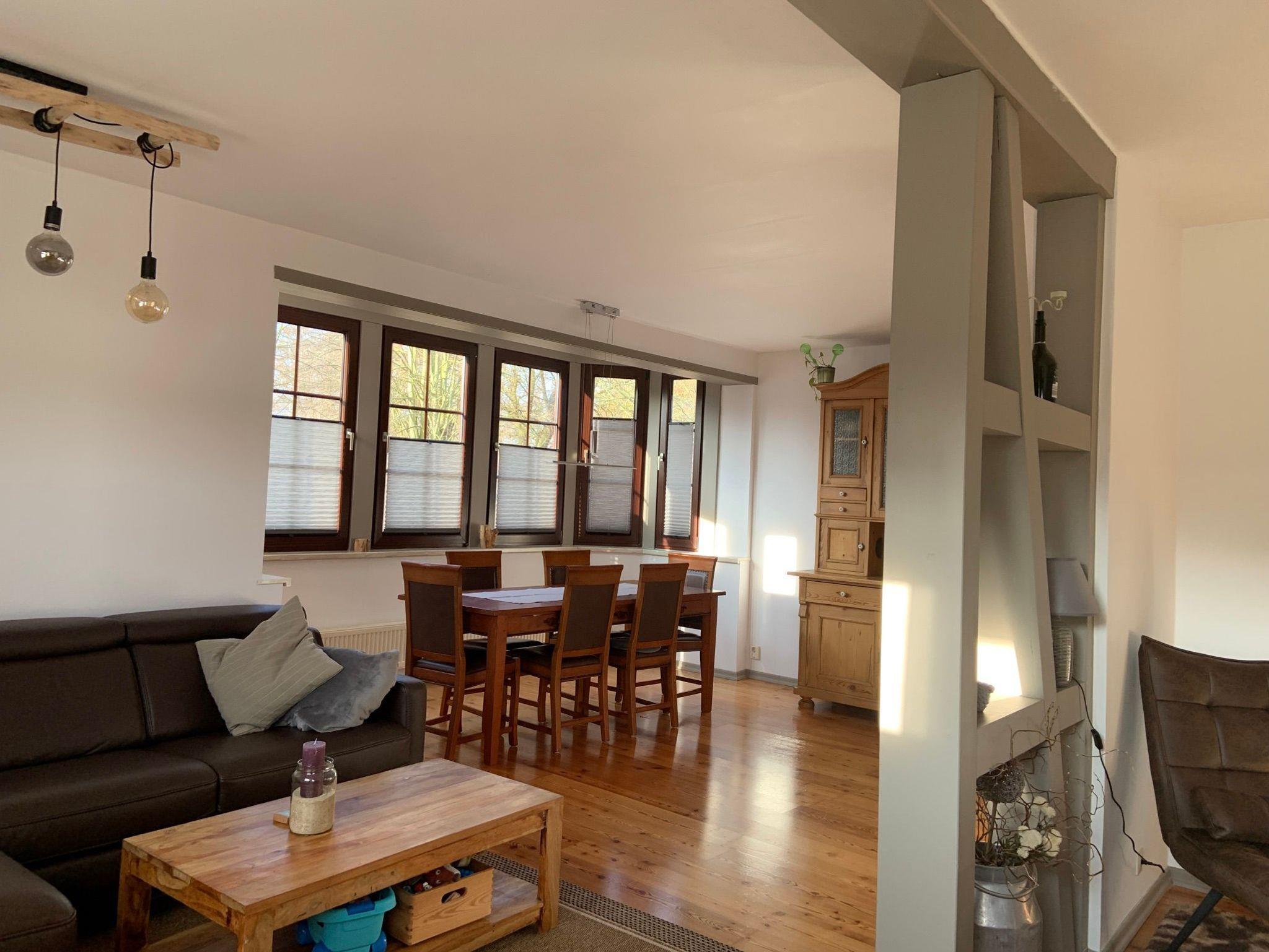 Das Ferienhaus verfügt insgesamt über drei Etagen. Im Erdgeschoss befindet sich der Eingangsbereich. Eine Treppe führt hinauf ins erste Obergeschoss. Hier erwartet die Gäste ein geräumiges Wohn-/Eßzimmer. Es bietet Ihnen eine gemütliche Ecke zum Verweilen am Kachelofen sowie eine geräumige Couch mit extrabreiter Ottomane. Ebenfalls ausgestattet ist das Zimmer mit einem Flachbild TV, schönen antiken Möbelstücken und einem Dielenfußboden. Am Esstisch ist ausreichend Platz für 6 Personen. Die Couch im Wohnzimmer bietet bei Bedarf einen zusätzlichen Schlafplatz (1,20 m breit).