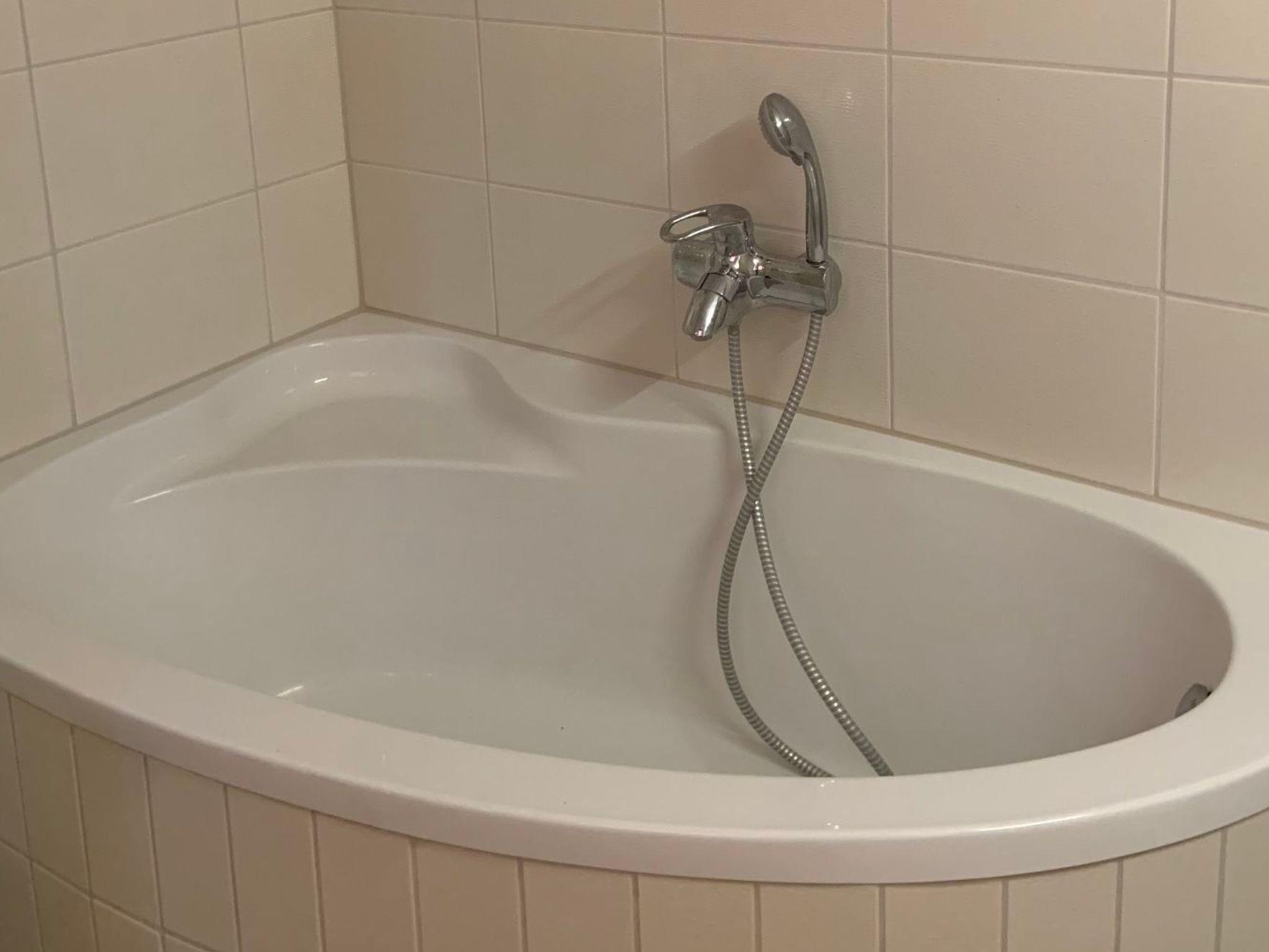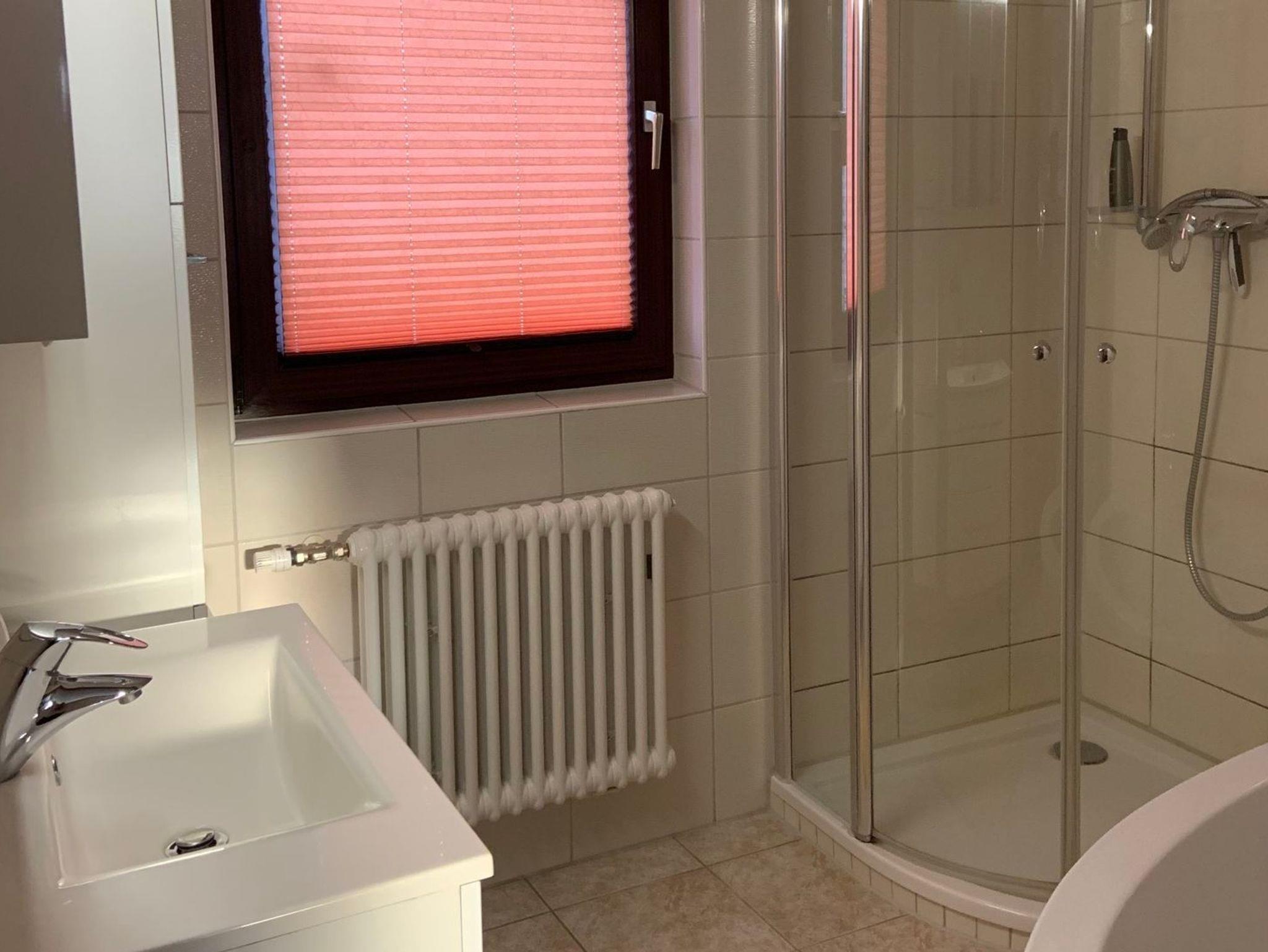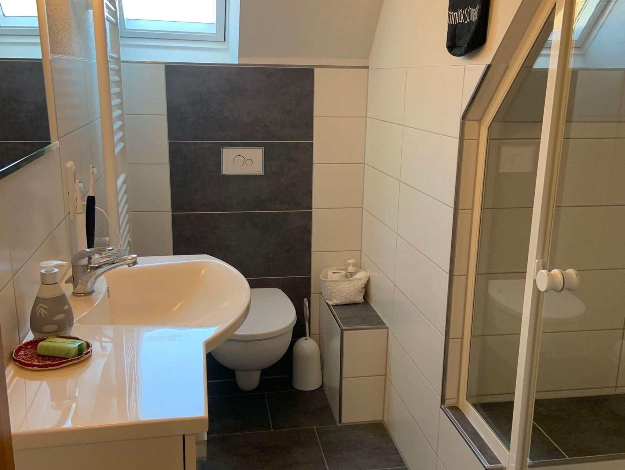 In der ersten Wohnetage befindet sich darüber hinaus ein Gästezimmer mit Dielenfußboden, ausgestattet mit einer Ausziehcouch mit Dauerschläfermatratze (Breite 140 cm). Auf dieser Etage gibt es ein Bad mit Badewanne und Dusche sowie ein separates WC.