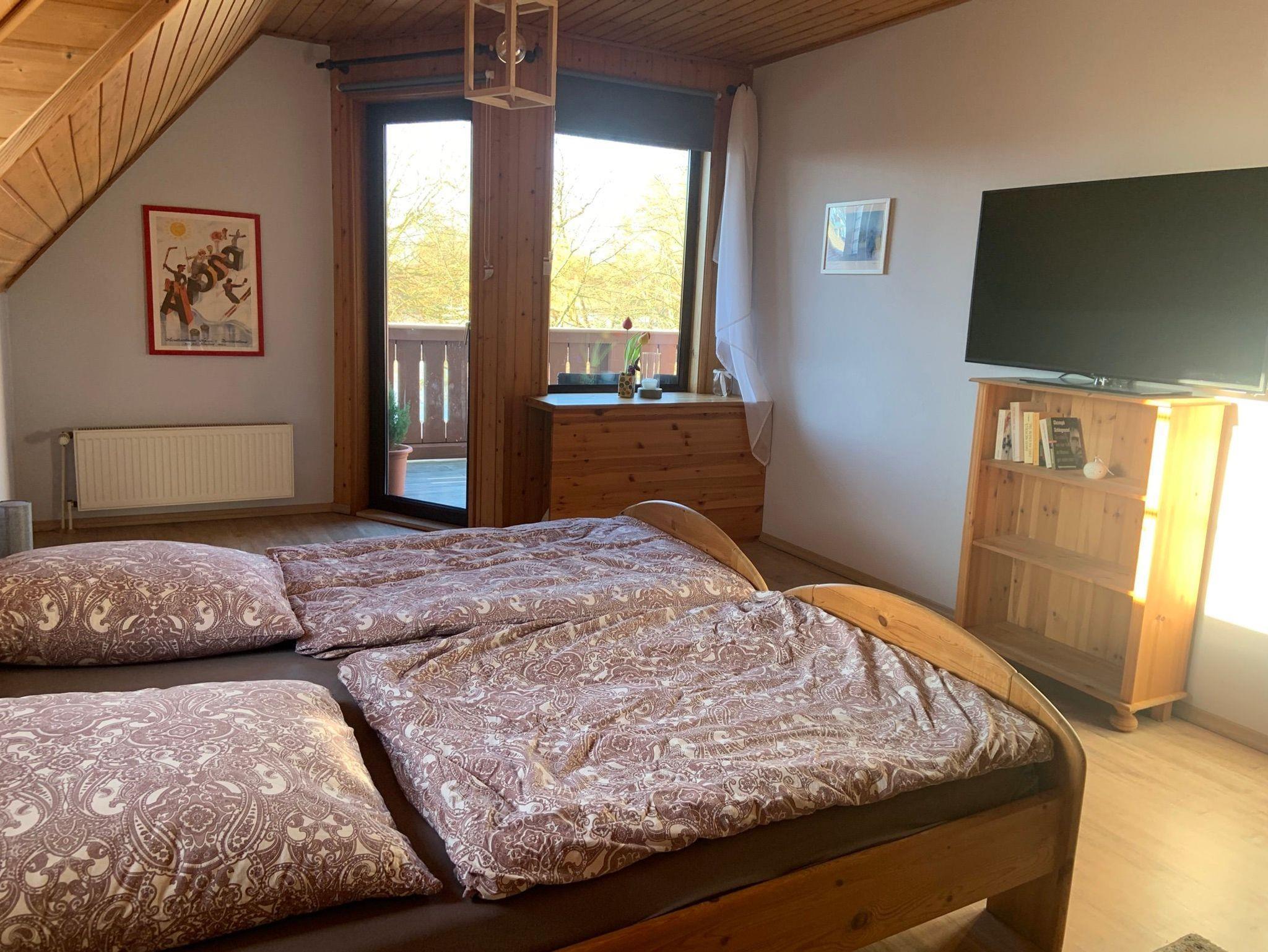 Ein weiteres Schlafzimmer befindet sich im zweiten Obergeschoss. Zur Ausstattung gehören zwei Einzelbetten 90x1,90 m, welche bei Bedarf getrennt oder zusammen stehen können sowie ein Flachbild TV. Vom Schlafzimmer aus gelangt man direkt auf einen geräumigen Balkon mit Blick über den Mühlenteich und in den Stadtpark. Das sich auf dieser Etage befindende Bad ist mit Dusche und WC ausgestattet.