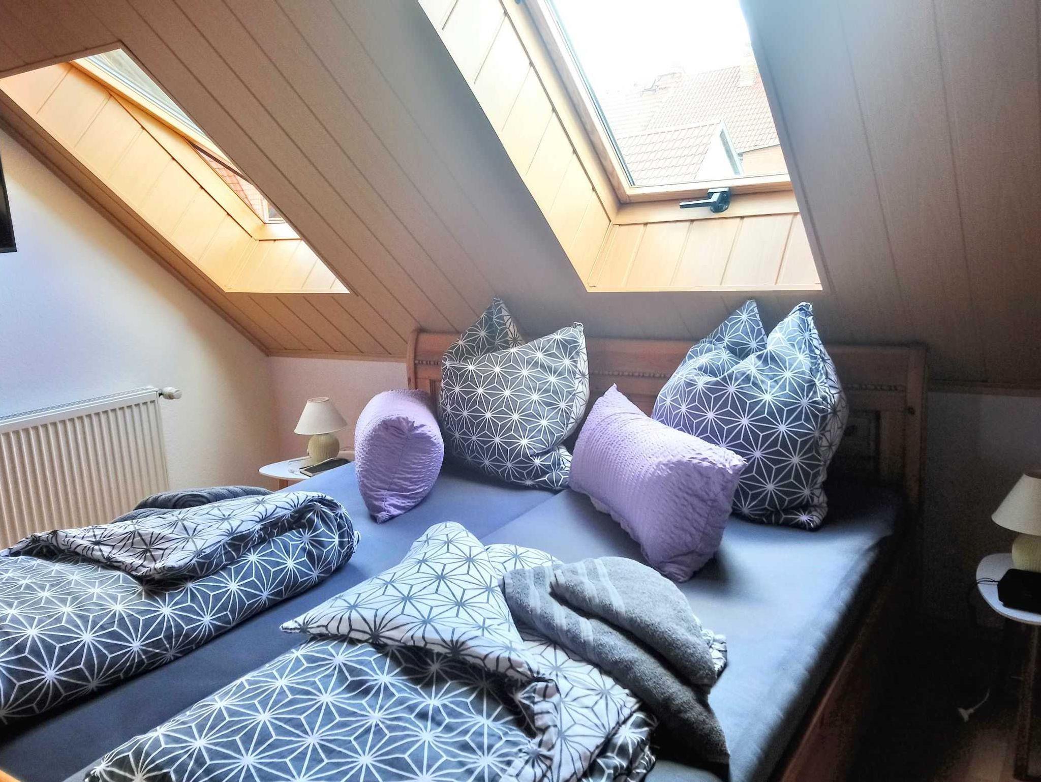 • ein Schlafzimmer mit Doppelbett (180 x 200) mit Flachbild-TV/Sat, Bügelbrett mit Bügeleisen