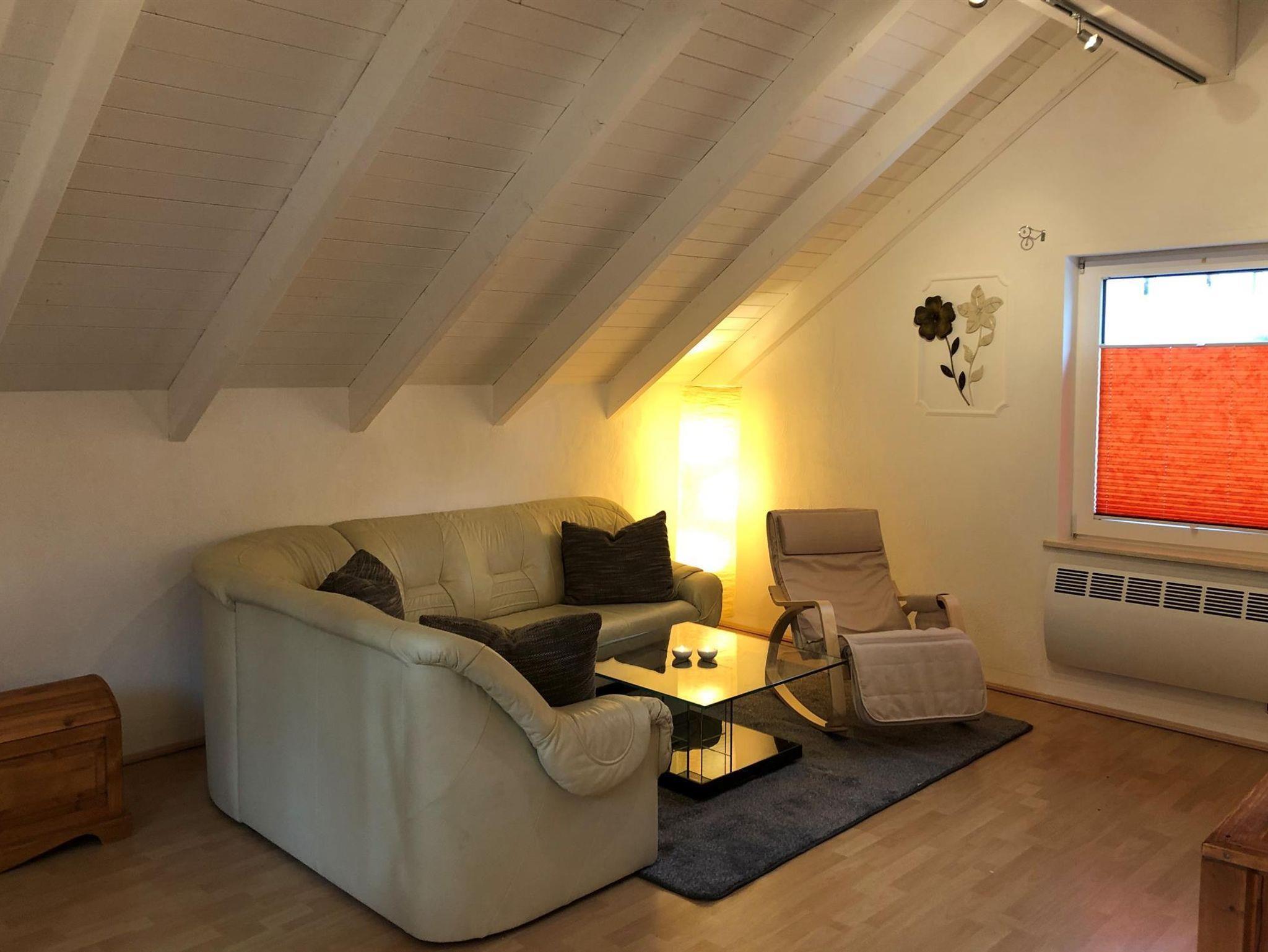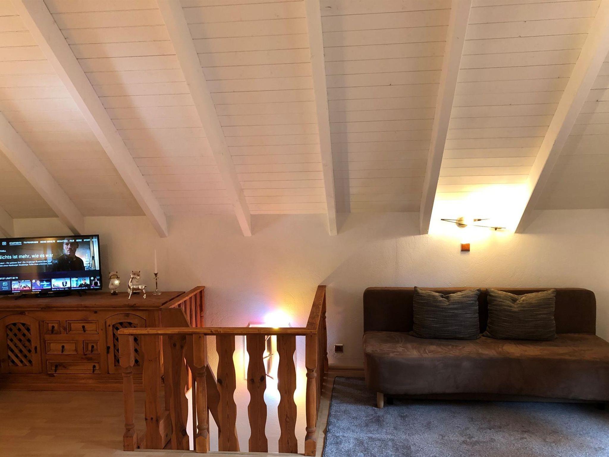 Vom Flur gelangt man über eine Holztreppe in die mit hochwertigen Holzmöbeln ausgestattete obere Etage. Wenn Sie nach einem langen Tag in der Natur ins Haus kommen, lädt das Wohnzimmer zum Ausruhen ein. Lassen Sie sich auf das gemütliche Sofa oder in den schaukelnden Stuhl fallen oder genießen Sie den Sonnenuntergang bei einem Glas Wein auf dem Balkon. Im Wohnbereich findet man eine Eckcouch sowie ein zusätzliches Schlafsofa, welches zwei weiteren Personen eine Übernachtungsmöglichkeit bietet.