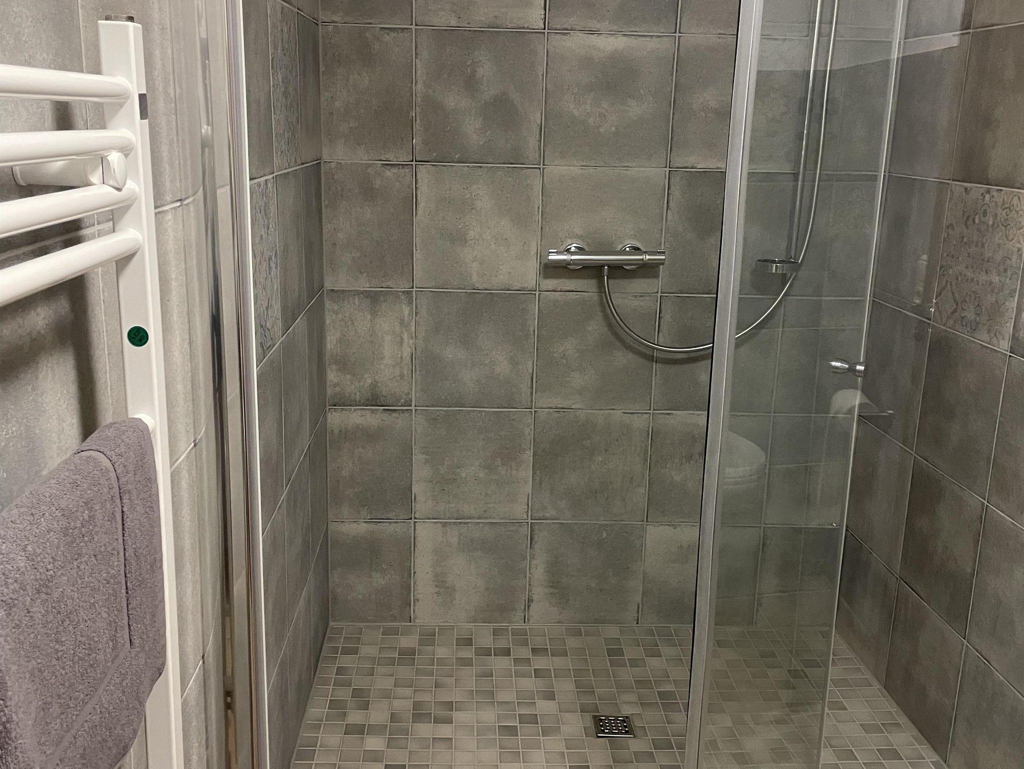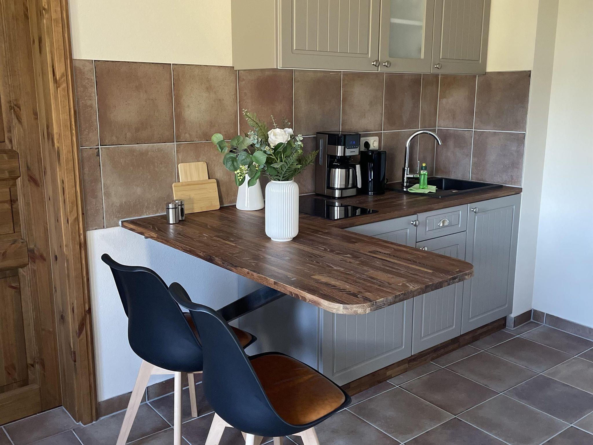 • Küche ausgestattet mit Kühlschrank, 2-Platten-Kochfeld, Kaffeemaschine, Wasserkocher