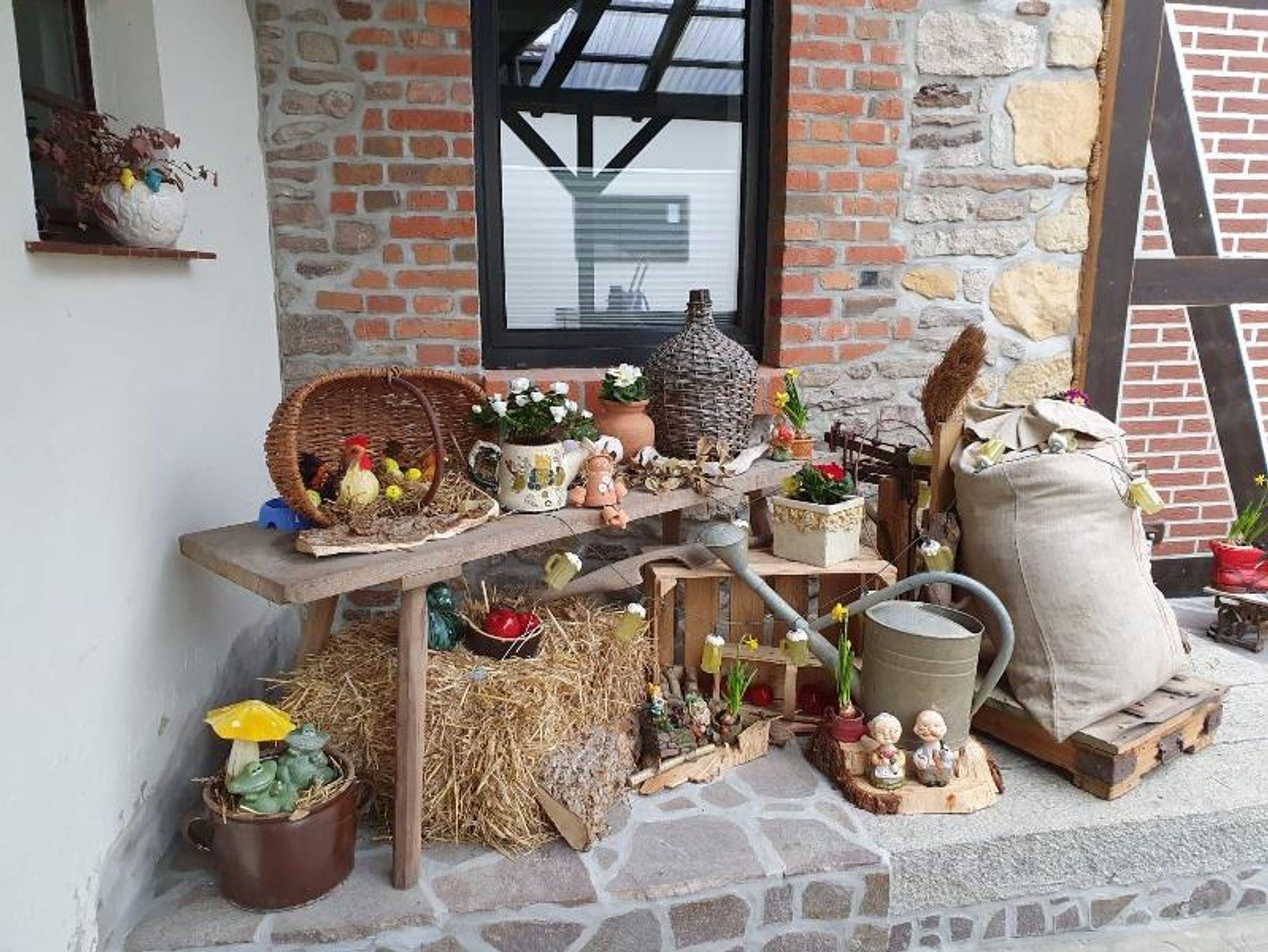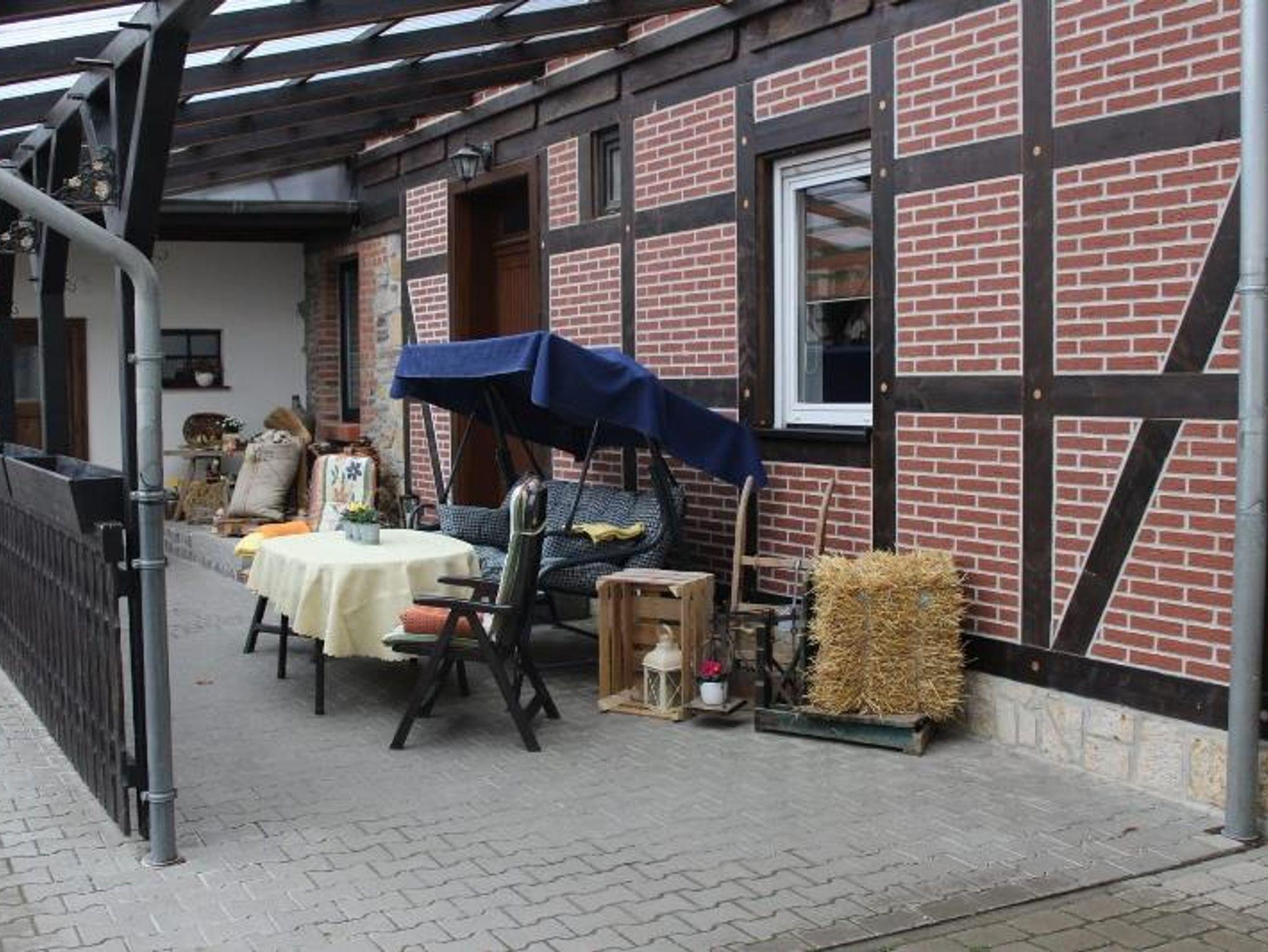 Ferienwohnungen im Fachwerkhaus mit Innenhof, Garten und Wiese mit Freisitz, Gartenmöbel und Grill. Tiere auf dem Hof - Kaninchen, Hühner, Tauben, Meerschweinchen und unser Hahn .