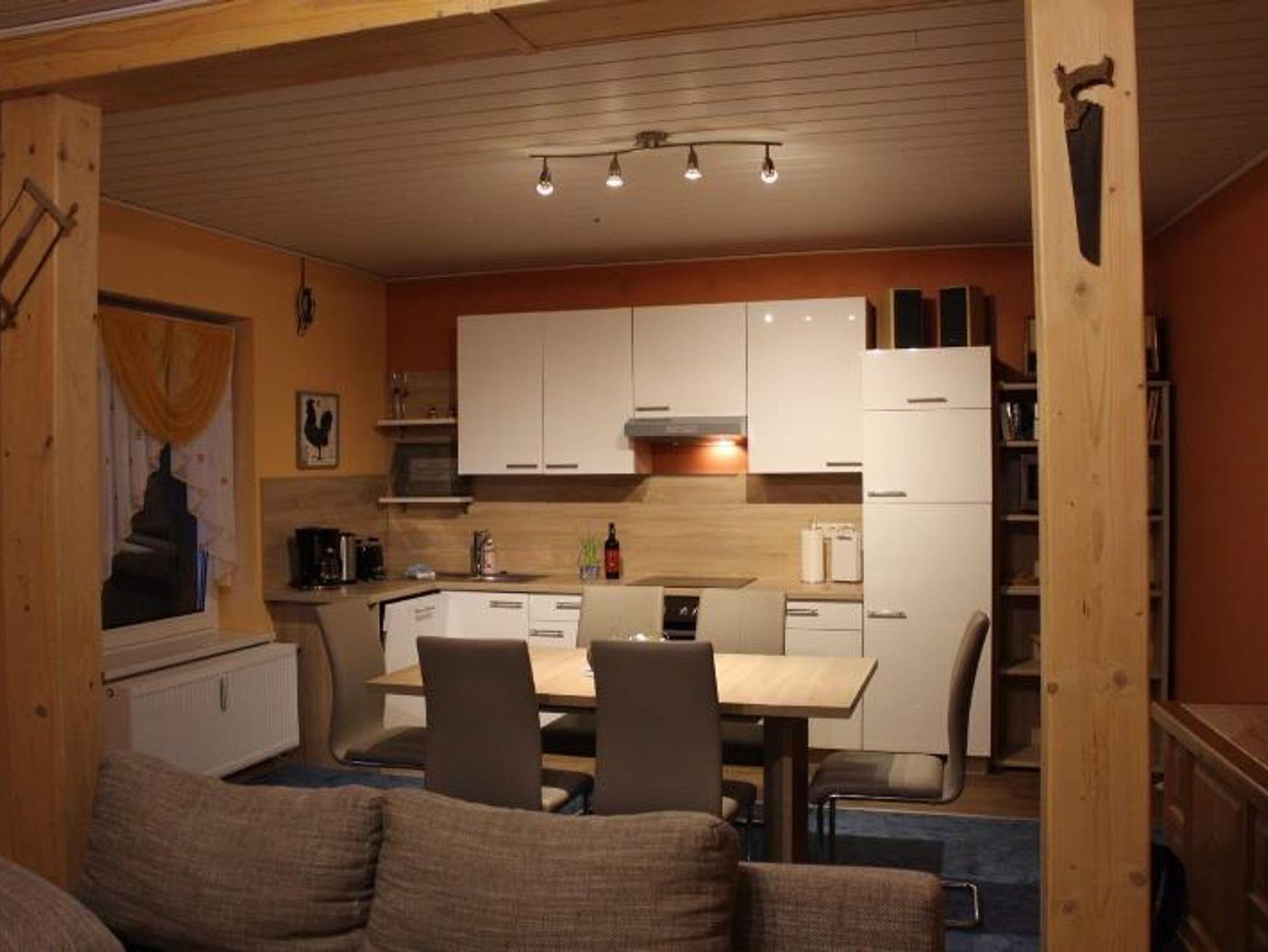 1. Obergeschoß: Offener Wohnküchenbereich. Wohnbereich mit Sitzgruppe, TV. Einbauküche mit Ceranfeld, Backofen, Mikrowelle, Küchlschrank, Geschirrspüler, Gefrierschrank, Kaffeemaschine, Toaster, Wasserkocher.