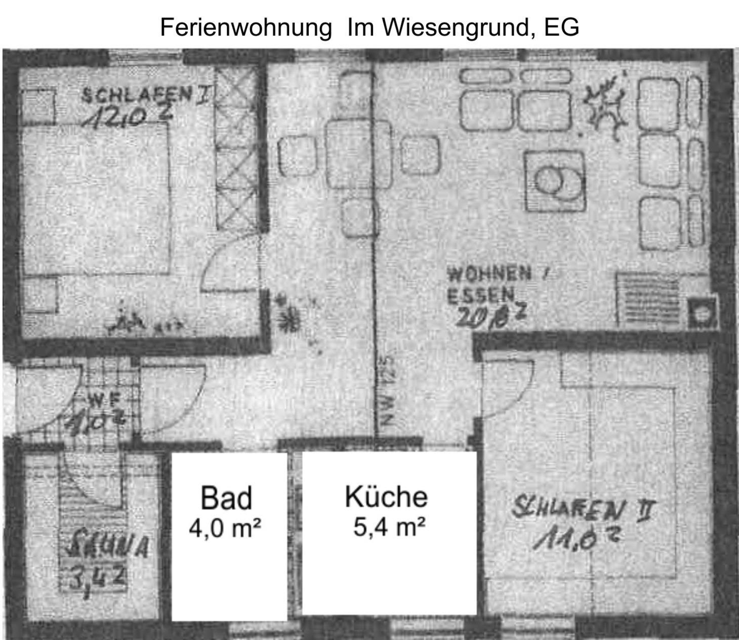 Willkommen in der großzügigen Ferienwohnung Im Wiesengrund 39/2 im Erdgeschoss! Auf ca. 65 m² Wohnfläche genießen bis zu 4 Personen höchsten Komfort und eine Ausstattung, die keine Wünsche offenlässt.Das helle Wohn- und Esszimmer mit offenem Kamin lädt zu entspannten Abenden ein. Satelliten-TV, Radio und kostenfreies WLAN sorgen für Unterhaltung und Information. Zwei gemütliche Schlafzimmer garantieren erholsame Nächte.Die komplett ausgestattete Küche mit Geschirrspüler, Kühlschrank und Kaffeemaschine bietet alles, was Sie für gemeinsame Mahlzeiten brauchen. Nach einem aktiven Urlaubstag erwartet Sie die private Sauna für wohltuende Entspannung.Das moderne Bad ist mit einer barrierefreien Dusche und WC ausgestattet. Waschmaschine und Trockner stehen Ihnen ebenfalls zur Verfügung.Zur Wohnung gehört eine überdachte Terrasse mit Grillplatz perfekt für laue Sommerabende. Dank Gaszentralheizung ist es auch in der kühleren Jahreszeit angenehm warm.Erleben Sie unvergessliche Tage in Thalfang und genießen Sie Komfort und Gemütlichkeit in Ihrem Feriendomizil.