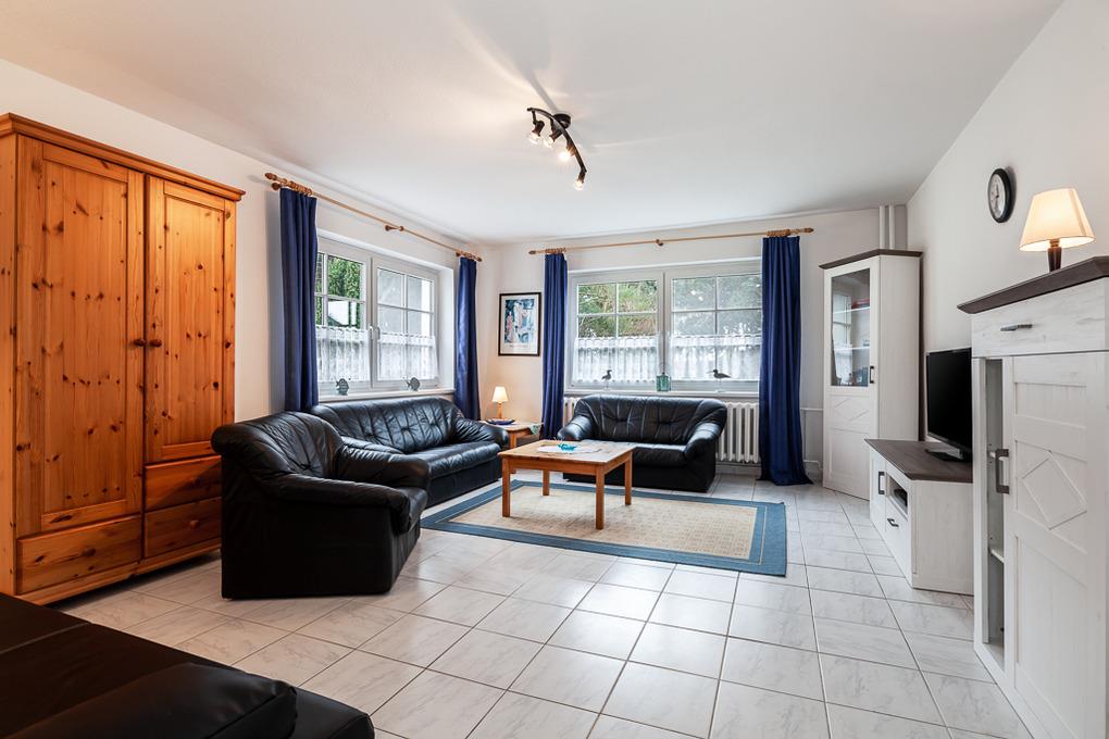 Das große lichtdurchflutete Wohnzimmer mit einer gemütlichen Couch bietet Ruhe und Entspannung. Ein TV-Flachbildschirm und eine Stereoanlage sorgen für die musikalische Unterhaltung.