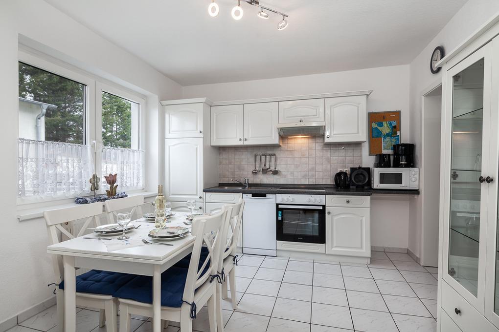 Eine separate Küche mit Esstisch ergänzen den Wohnbereich. Die Spülmaschine erledigt für Sie den Abwasch, während Sie am Strand den Sonnenuntergang genießen können.