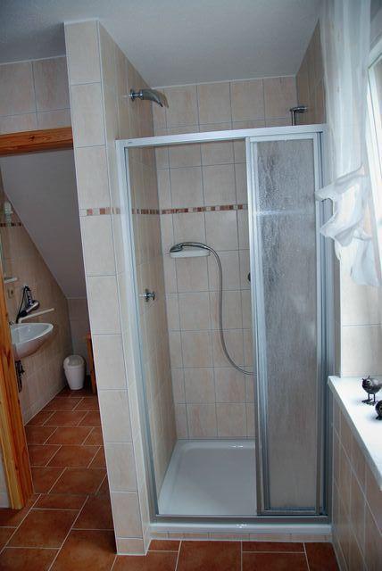 Das helle Tageslichtbadezimmer verfügt über eine Dusche, eine Sauna, einen Waschtisch und ein WC.