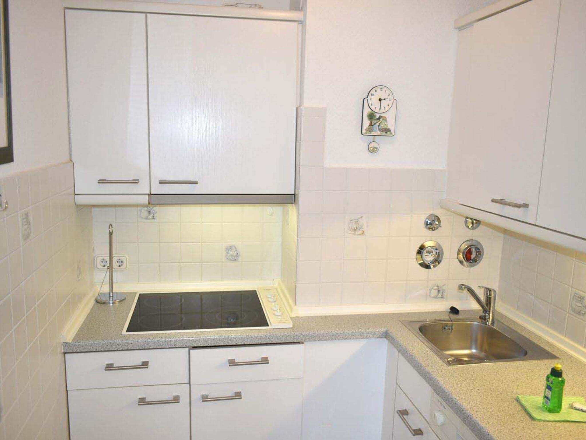 Küche: 4-Zonen-Cerankochfeld, Dunstabzugshaube, Einbauküche, Geschirr, Kaffeemaschine, Kochtöpfe, Kühlschrank mit Gefrierfach, Mikrowelle, Spülmaschine, Toaster, Wasserkocher
