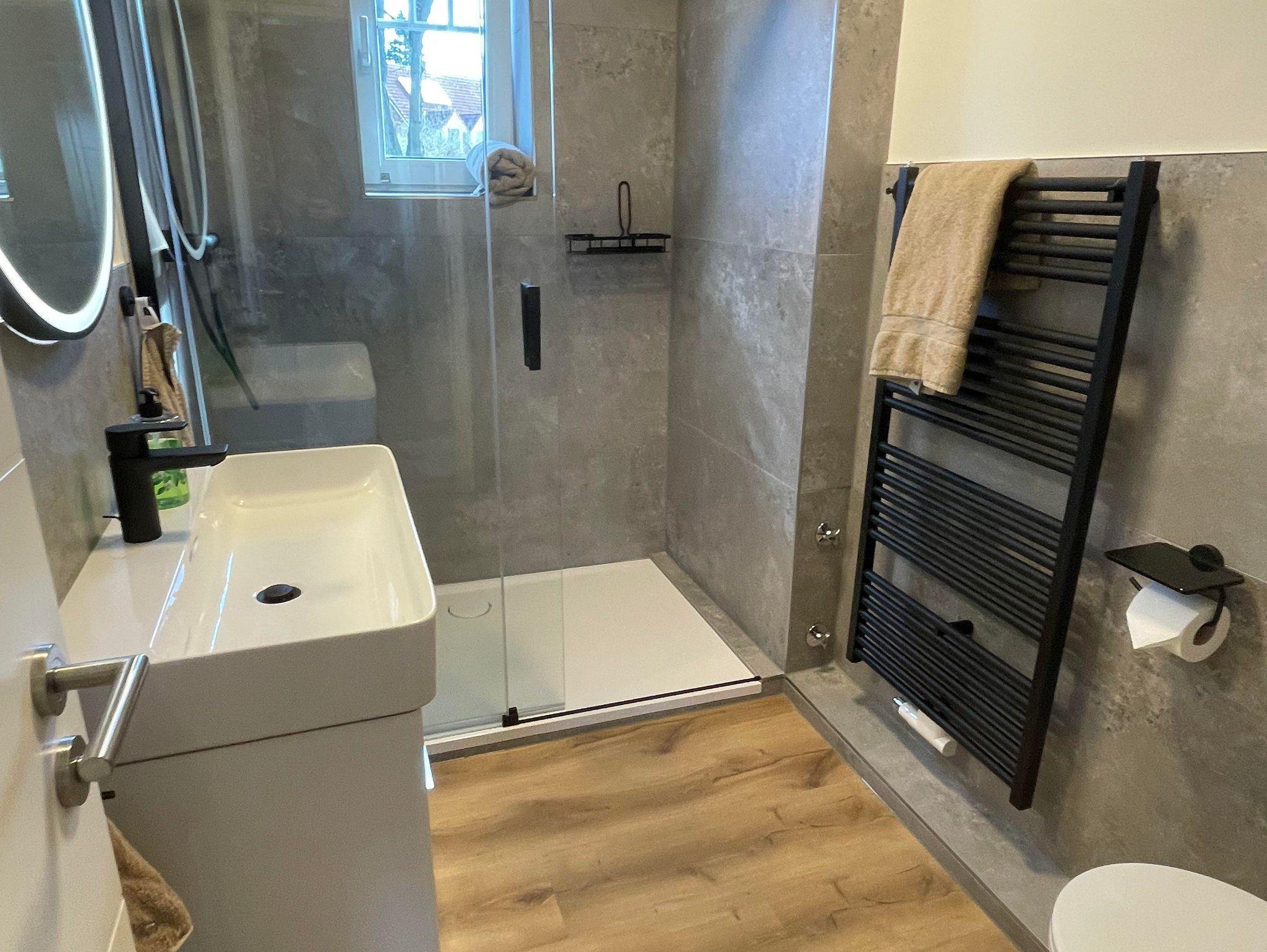 Das Bad verfügt über eine mit Dusche, ein WC, ein Handtuchheizkörper und ein Waschtisch mit Schubladen. Ein Fön ist vorhanden.