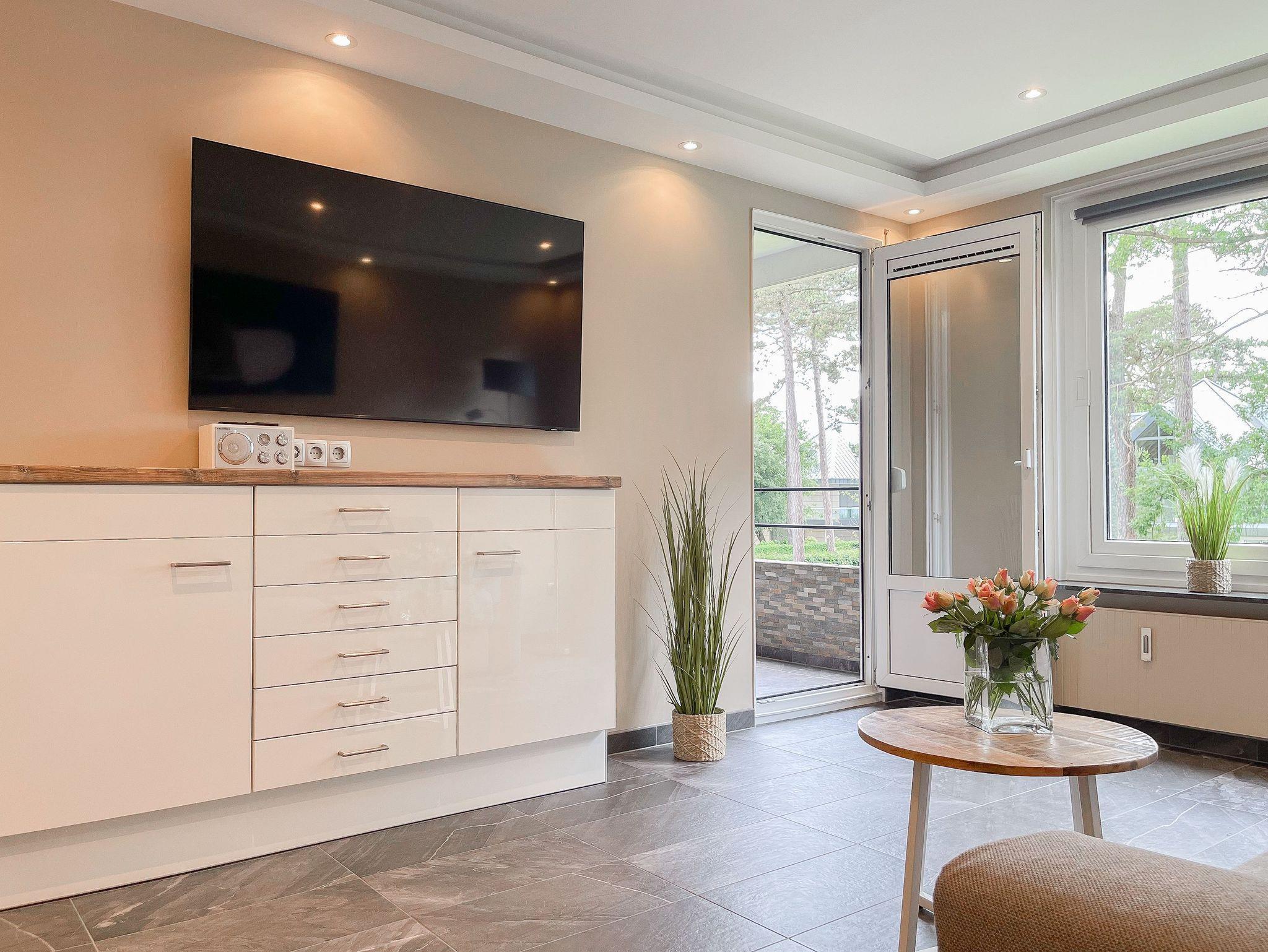 Die aufwendig renovierte und hochwertig eingerichtete Ferienwohnung befindet sich in der ersten Etage im Carpe Diem Haus 2, einer gepflegten Wohnanlage. Es erwartet Sie ein moderner Wohnbereich mit einem hochwertigen Schlafsofa, TV, Bluetooth Radio und WLAN. Die integrierte Einbauküche ist sehr gut ausgestattet und verfügt über einen Esstresen mit ausreichend Platz für 4 Personen. Der vorgelagerte Balkon zur Meerseite bietet einen sehr schönen Ausblick. Je nach Jahreszeit kann man die Ostsee durch die Bäume blitzen sehen. Meeresrauschen und die frische Seeluft sind garantiert. Das separate Schlafzimmer ist mit einem Doppelbett (160x200), einem Kleiderschrank und einem zusätzlichen TV ausgestattet. Zur Wohnung gehört ein fester Außenstellplatz.