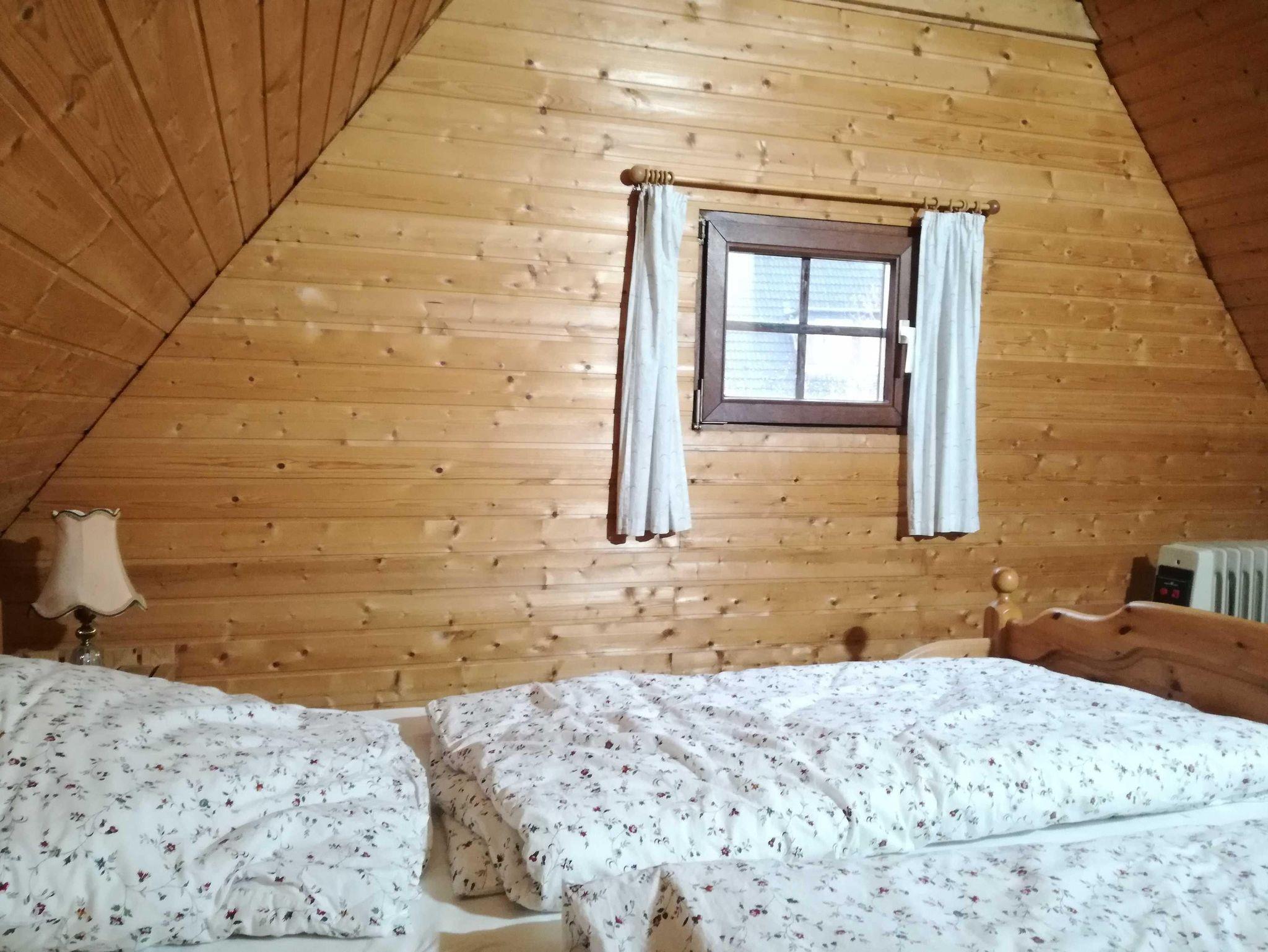 Eine steile Treppe führt zu den zwei Schlafräumen: kleiner Schlafraum mit 2 getrennt stehenden 0,90 x 1,95 m Betten, größerer Schlafraum mit 1,80 x 2,00 m Bett. (Die Einrichtung des Hauses kann von den Fotos abweichen)