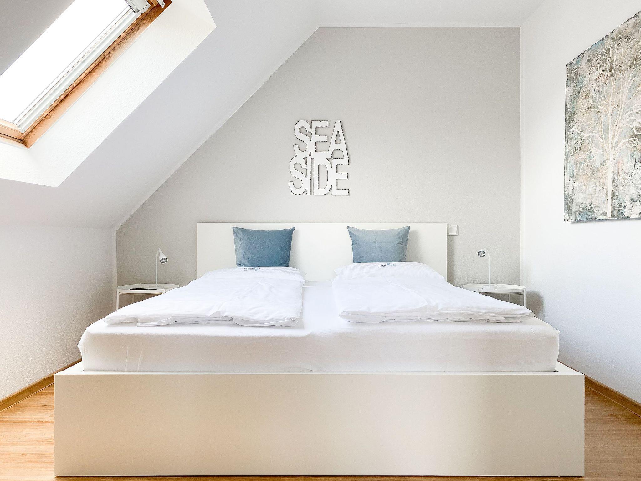 Die großzügige, liebevoll renovierte und geschmackvoll gestaltete Ferienwohnung im 2. Obergeschoss mit 2 Balkonen bietet auf ca. 83 qm ausreichend Platz für 5 Personen. Sie verfügt über ein Schlafzimmer mit Doppelbett (180x200) und vorgelagertem Balkon, ein weiteres Schlafzimmer auf der 2. Ebene ebenfalls mit einem Doppelbett (180x200) und TV sowie einen zusätzlichen Schlafbereich im Durchgangszimmer, ausgestattet mit einem Einzelbett (90x200). Alle Schlafzimmer sind mit Verdunkelungsplissees ausgestattet. Mittelpunkt der Wohnung ist der helle, freundliche Wohnraum mit abgrenzendem Essbereich. Die moderne, offene Einbauküche ist bestens ausgestattet mit Geschirrspüler, Mikrowelle, Backofen, Cerankochfeld sowie einer Frühstückstheke mit Barhockern. Vom Wohnbereich gelangt man auf den sonnigen Süd Balkon. Der Nord-West Balkon ist sowohl vom Flur als auch vom Schlafzimmer zu betreten. Das helle Duschbad verfügt über einen Handtuchwärmer und dank eines Fensters über Tageslicht.