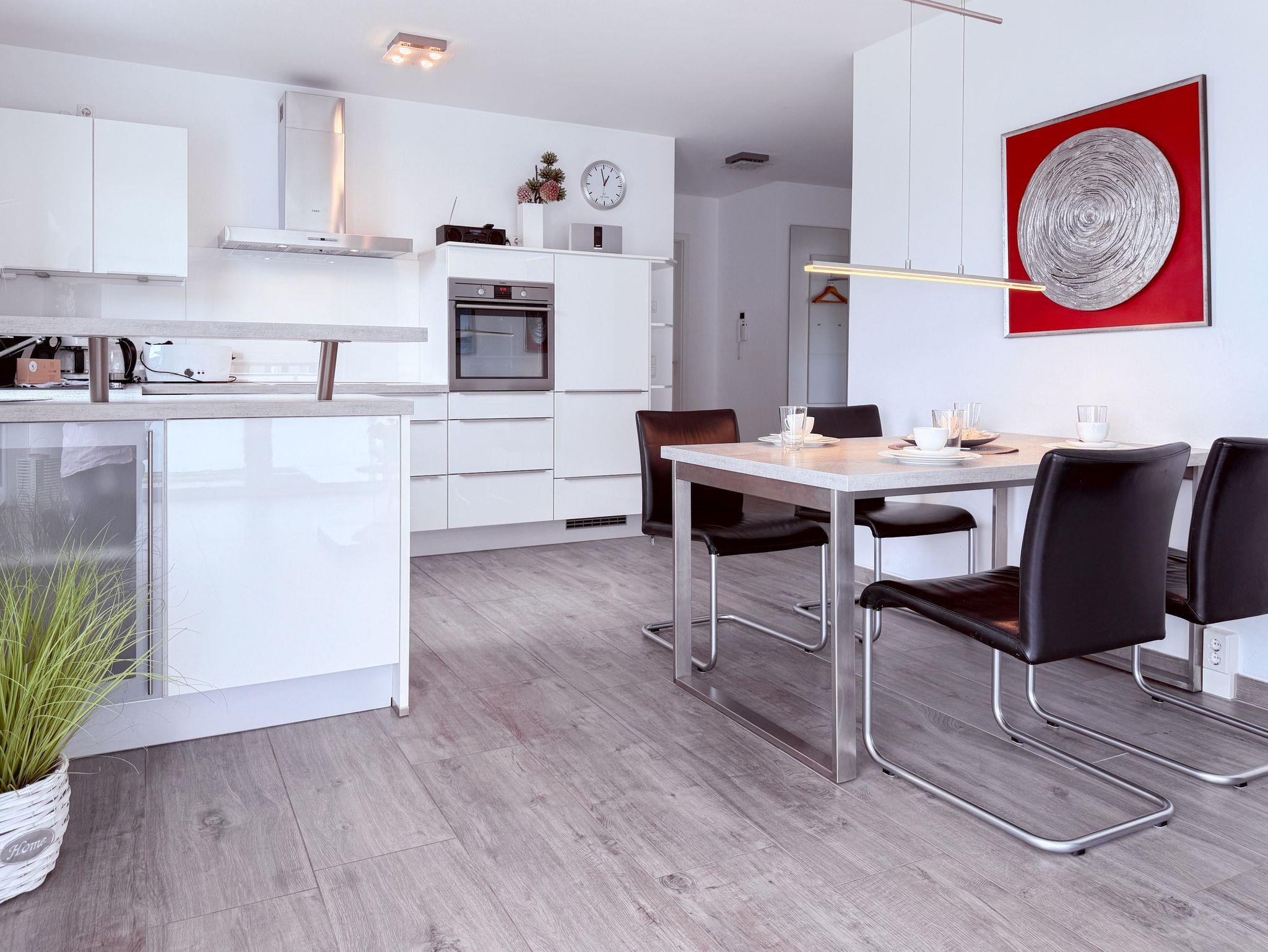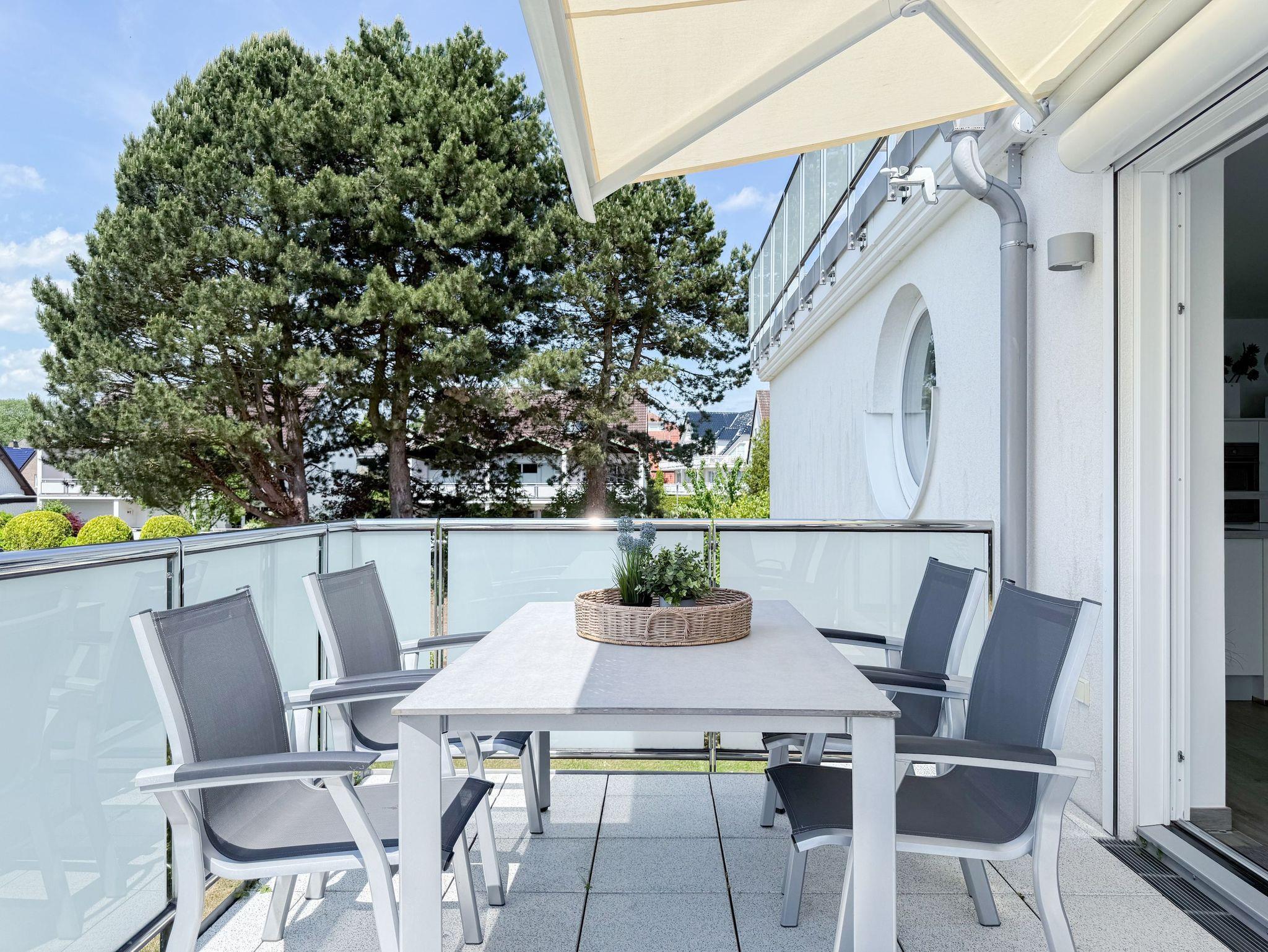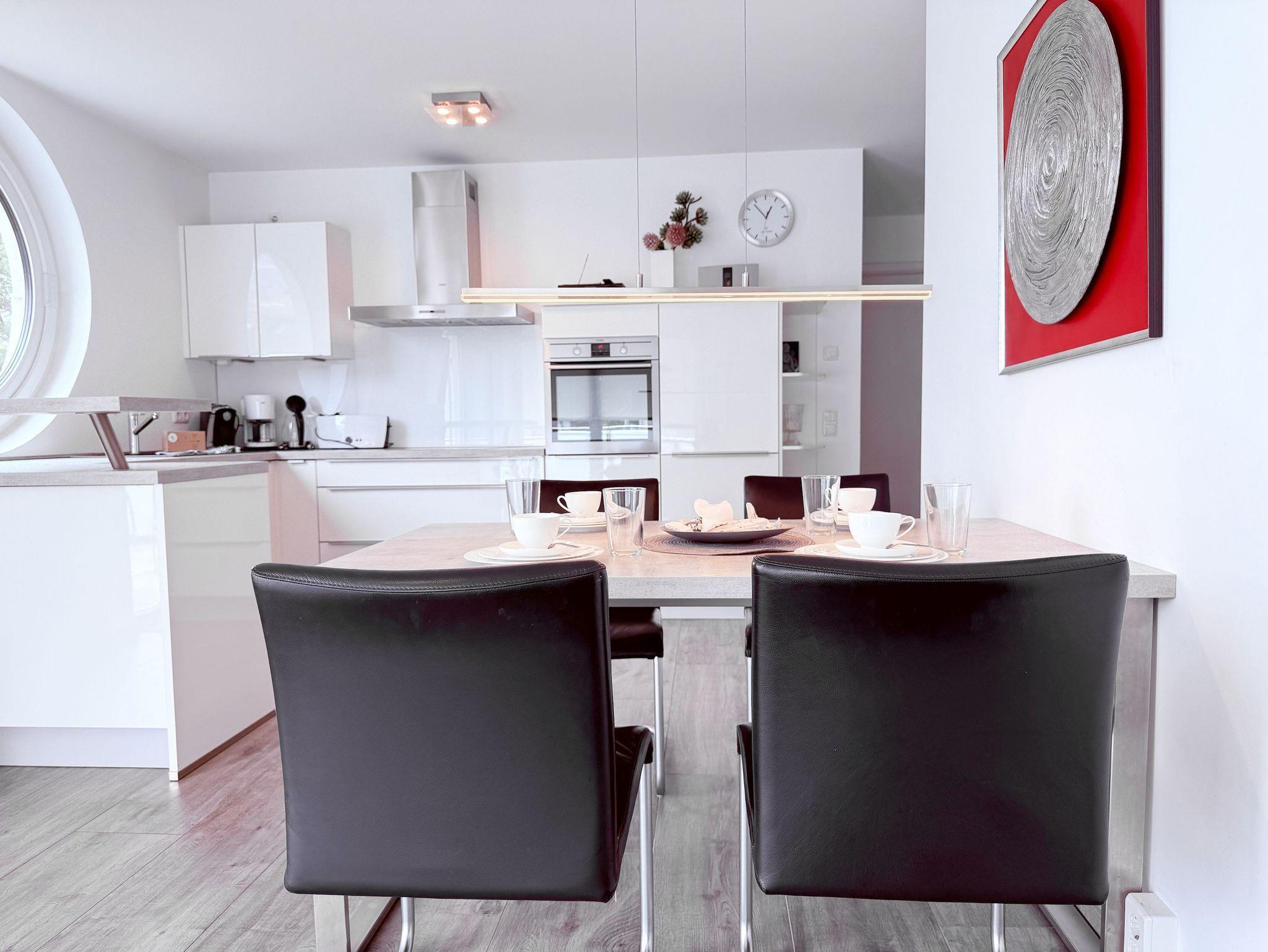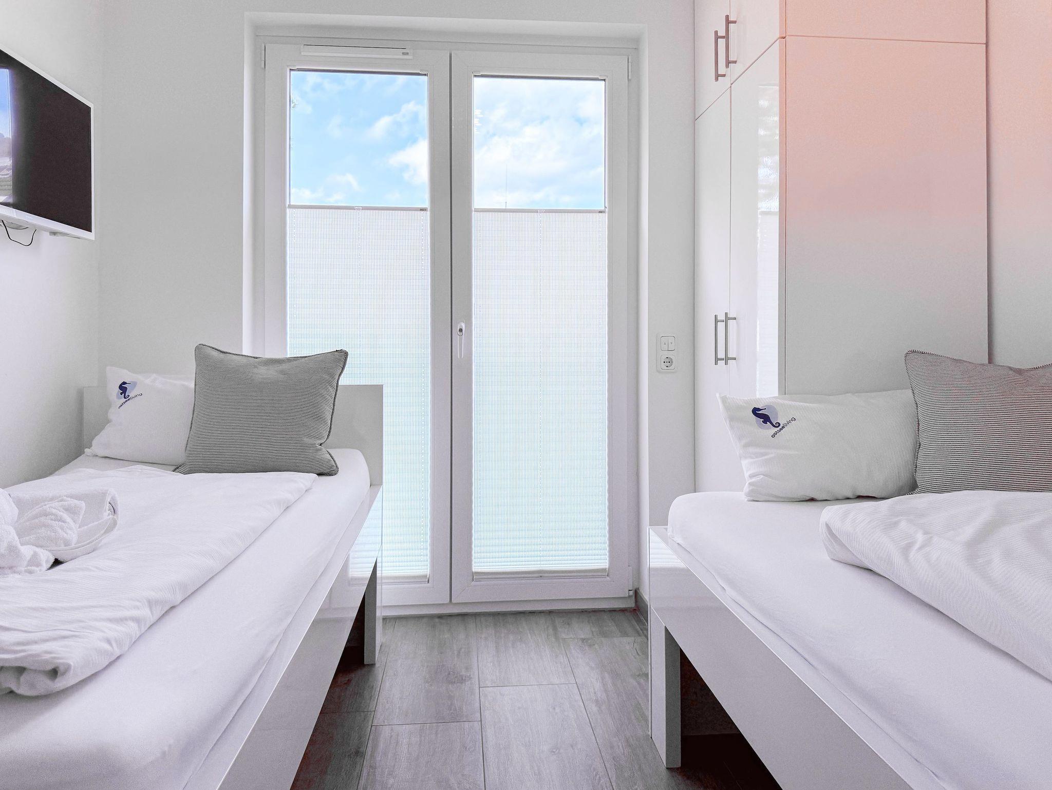 Die luxuriöse Ferienwohnung bietet mit 2 separaten Schlafzimmern ausreichend Platz für 4 Personen, um einen schönen Urlaub zu verleben. Es stehen ein Doppelbett (180x200) und zwei Einzelbetten (80x200) zur Verfügung. Beide Schlafzimmer sind mit einem TV ausgestattet. Bei der Einrichtung und Ausstattung der Immobilie wurde nicht gespart und sehr viel Wert auf hochwertige Materialien gelegt. 3 TV, Hifi-Anlage, Bose Bluetooth Anlage, kostenloser Internetzugang über WLAN, Fußbodenheizung, elektrische Außenjalousien, modernes Duschbad mit viel Tageslicht und integrierter Waschmaschine. Die hochwertige, moderne Einbauküche mit angrenzendem Essbereich ist bestens mit allen technischen Geräten ausgestattet und genügt höchsten Ansprüchen. Sehr charmant ist der Blick ins Grüne durch das große Bullauge. Übergroße Fensterelemente sorgen für einen lichtdurchfluteten Wohnbereich mit Blick zur ruhigen Gartenseite und auf den großzügig angelegten Südwestbalkon mit Dachterrassen Charakter, selbstverständlich komfortabel möbliert mit Sitzgruppe, Sonnenliegen und elektrischer Außenmarkise.