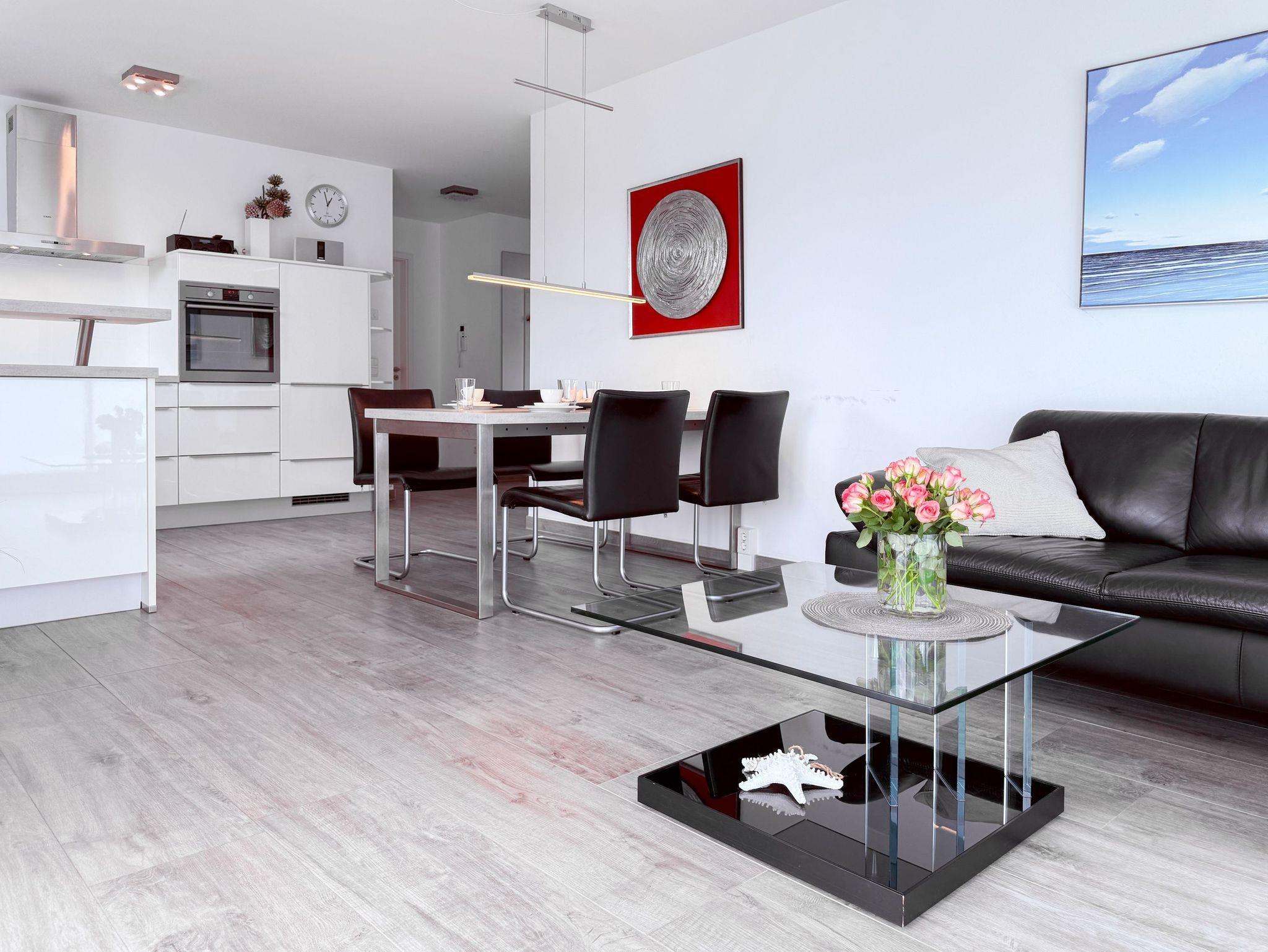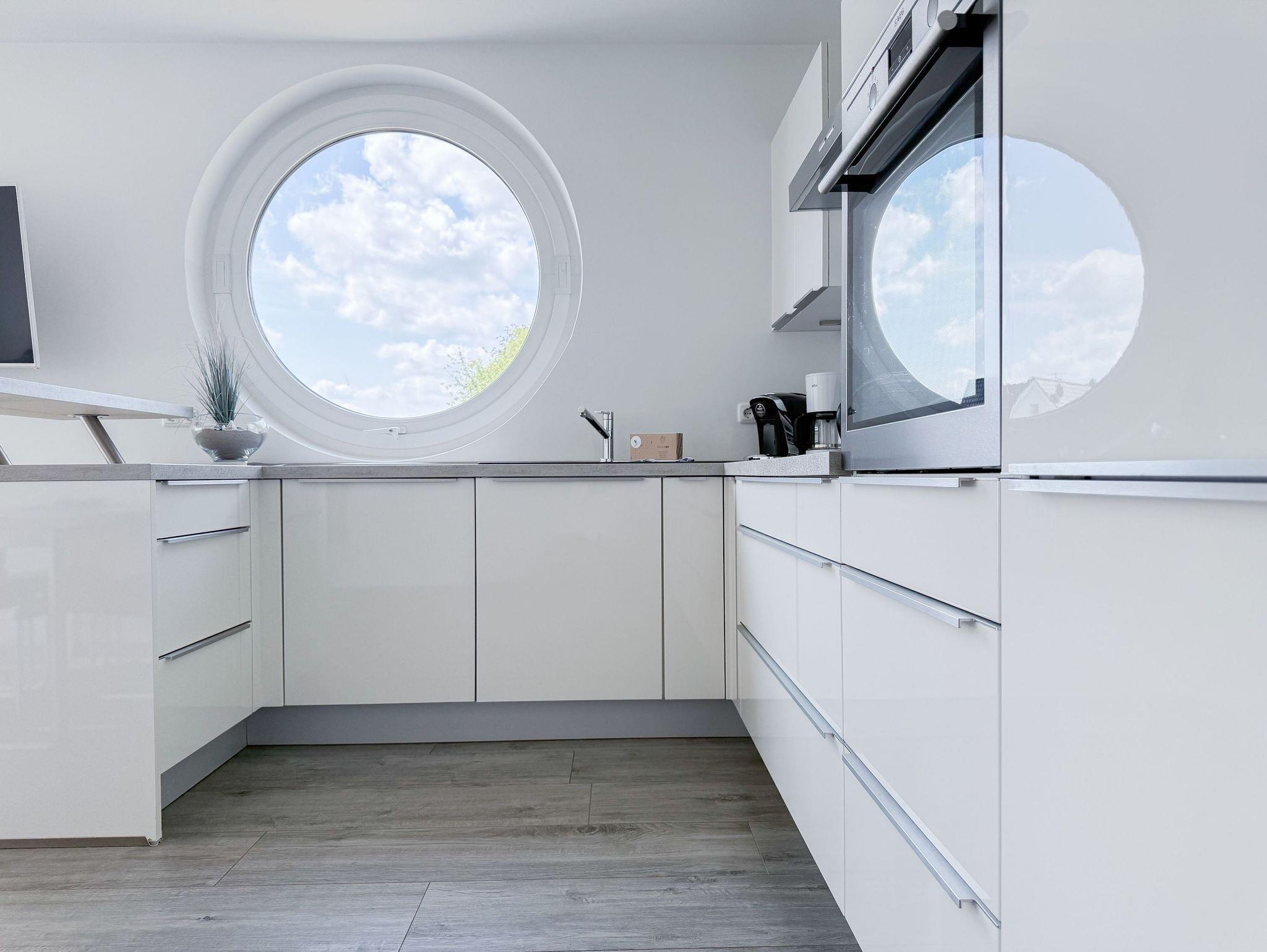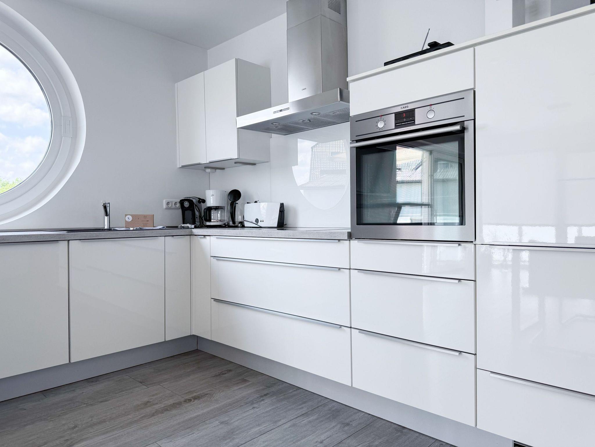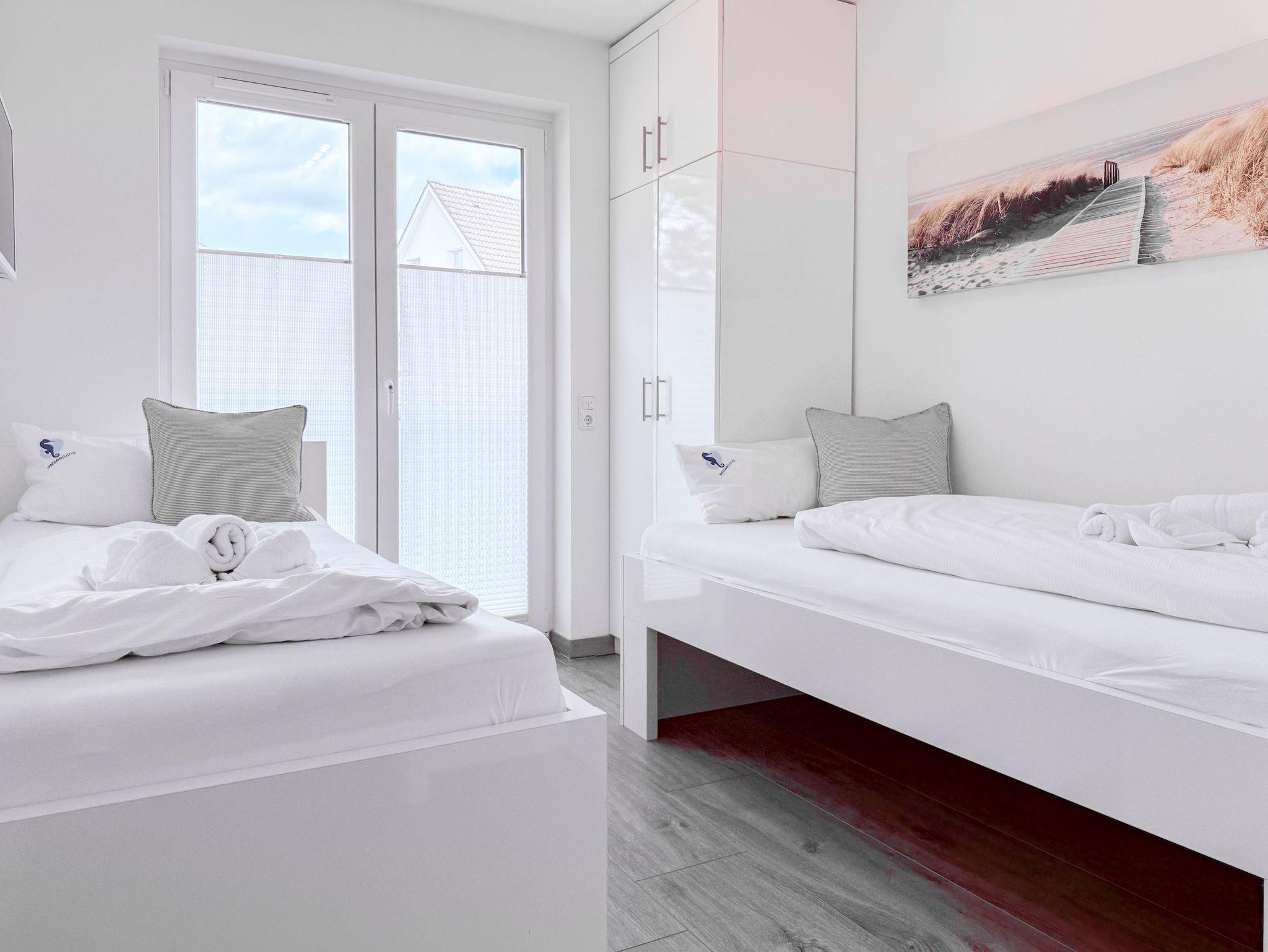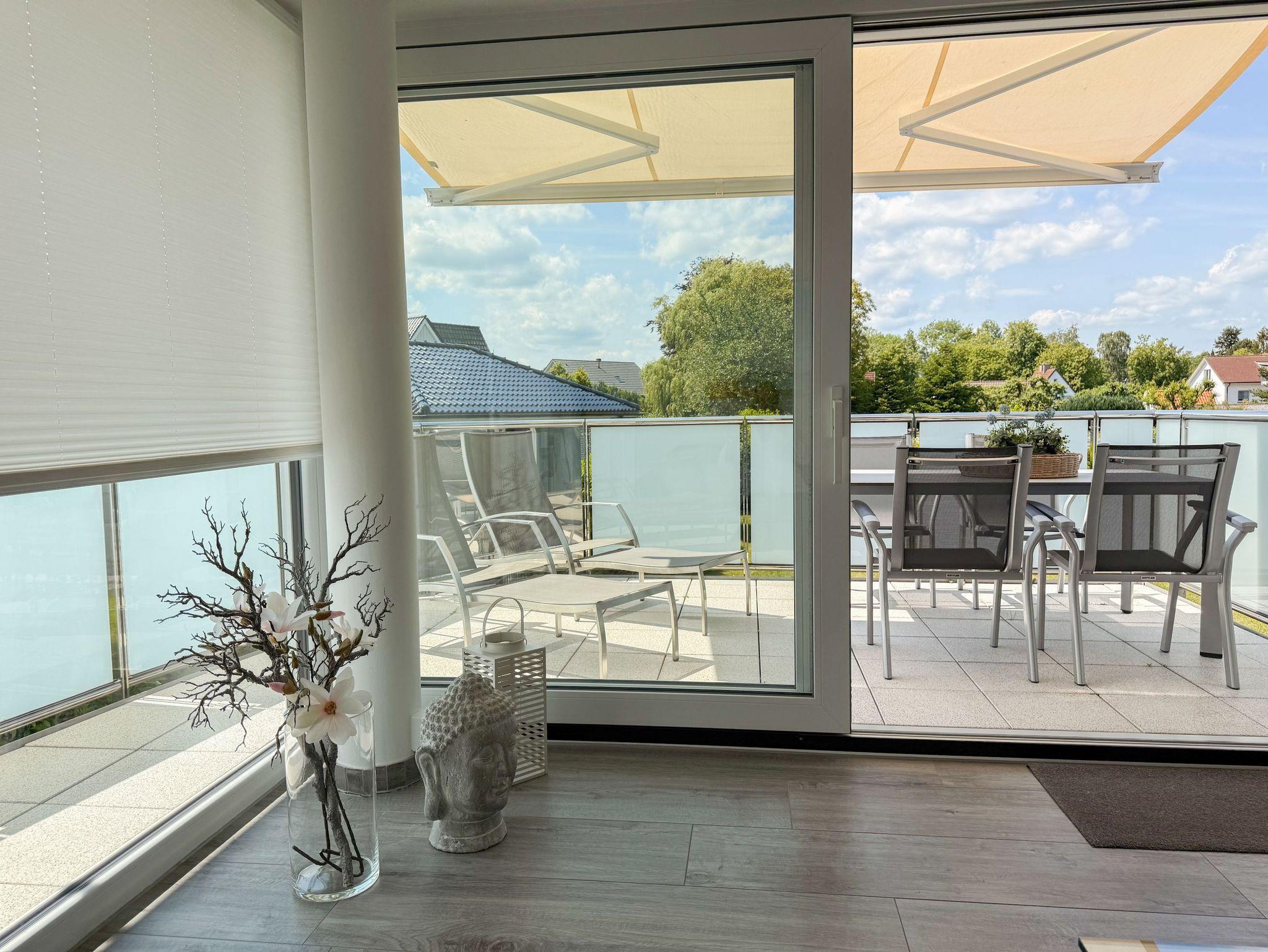 Die luxuriöse Ferienwohnung bietet mit 2 separaten Schlafzimmern ausreichend Platz für 4 Personen, um einen schönen Urlaub zu verleben. Es stehen ein Doppelbett (180x200) und zwei Einzelbetten (80x200) zur Verfügung. Beide Schlafzimmer sind mit einem TV ausgestattet. Bei der Einrichtung und Ausstattung der Immobilie wurde nicht gespart und sehr viel Wert auf hochwertige Materialien gelegt. 3 TV, Hifi-Anlage, Bose Bluetooth Anlage, kostenloser Internetzugang über WLAN, Fußbodenheizung, elektrische Außenjalousien, modernes Duschbad mit viel Tageslicht und integrierter Waschmaschine. Die hochwertige, moderne Einbauküche mit angrenzendem Essbereich ist bestens mit allen technischen Geräten ausgestattet und genügt höchsten Ansprüchen. Sehr charmant ist der Blick ins Grüne durch das große Bullauge. Übergroße Fensterelemente sorgen für einen lichtdurchfluteten Wohnbereich mit Blick zur ruhigen Gartenseite und auf den großzügig angelegten Südwestbalkon mit Dachterrassen Charakter, selbstverständlich komfortabel möbliert mit Sitzgruppe, Sonnenliegen und elektrischer Außenmarkise.