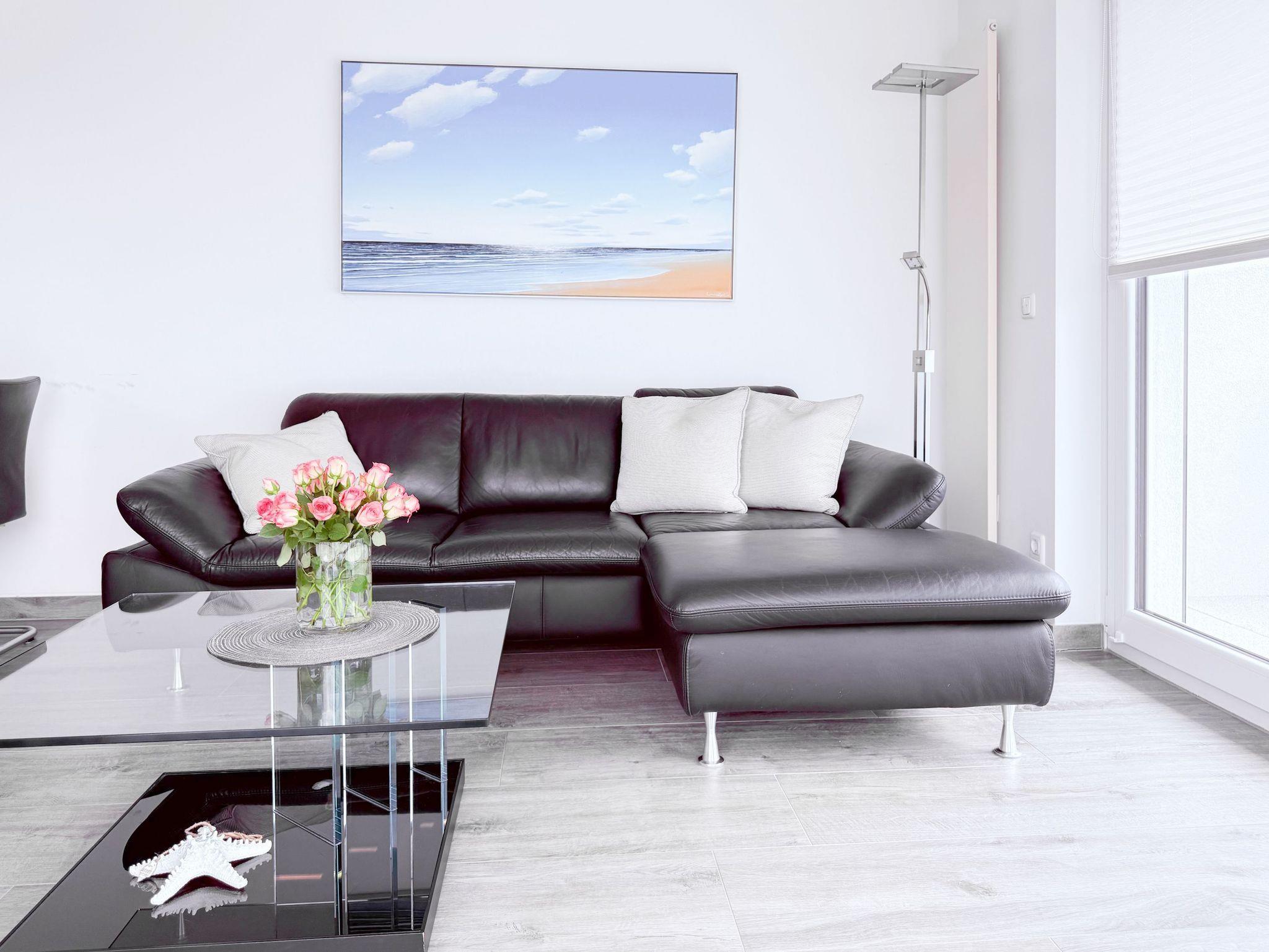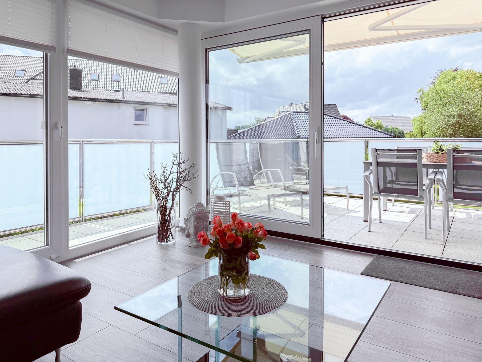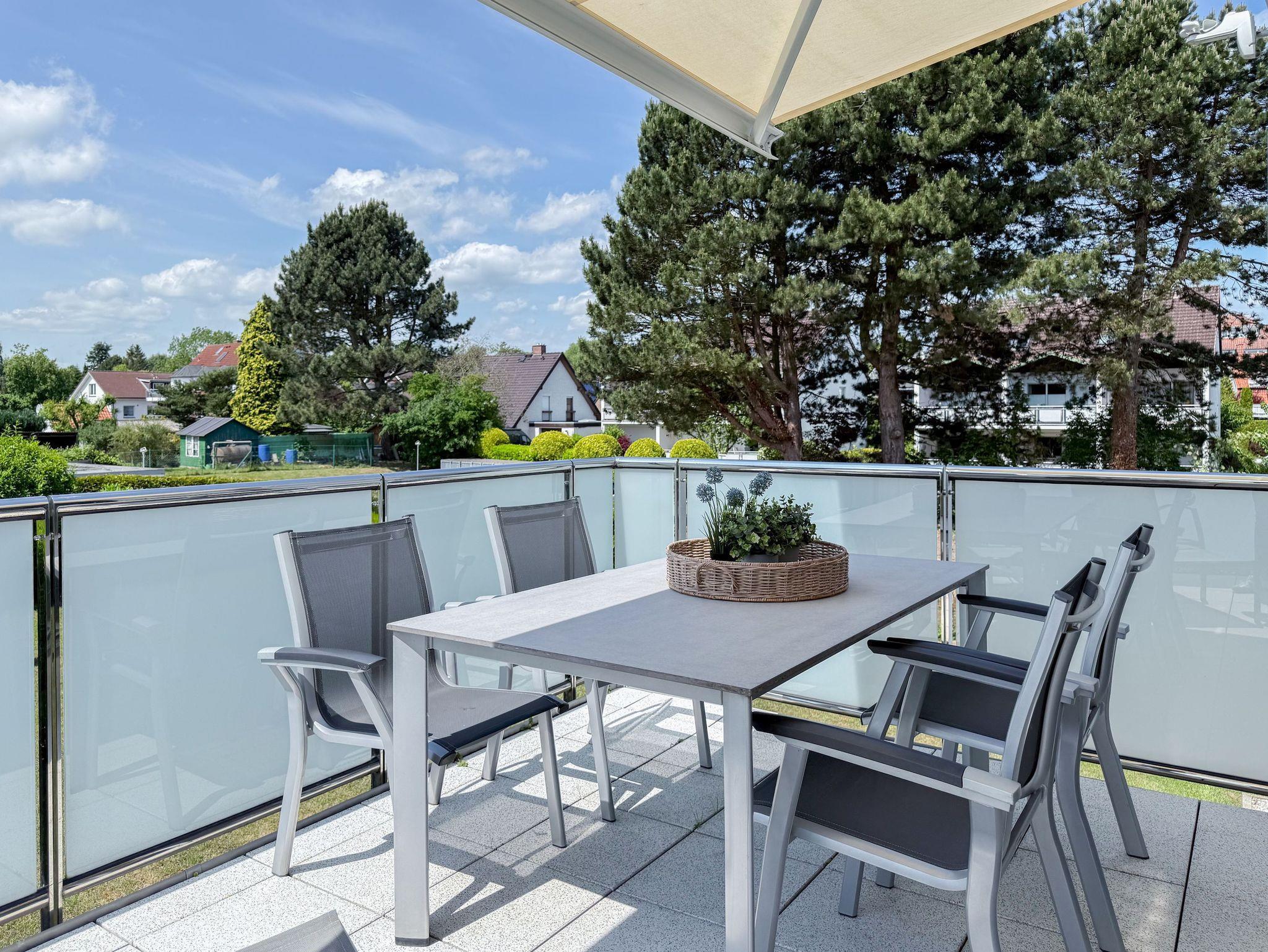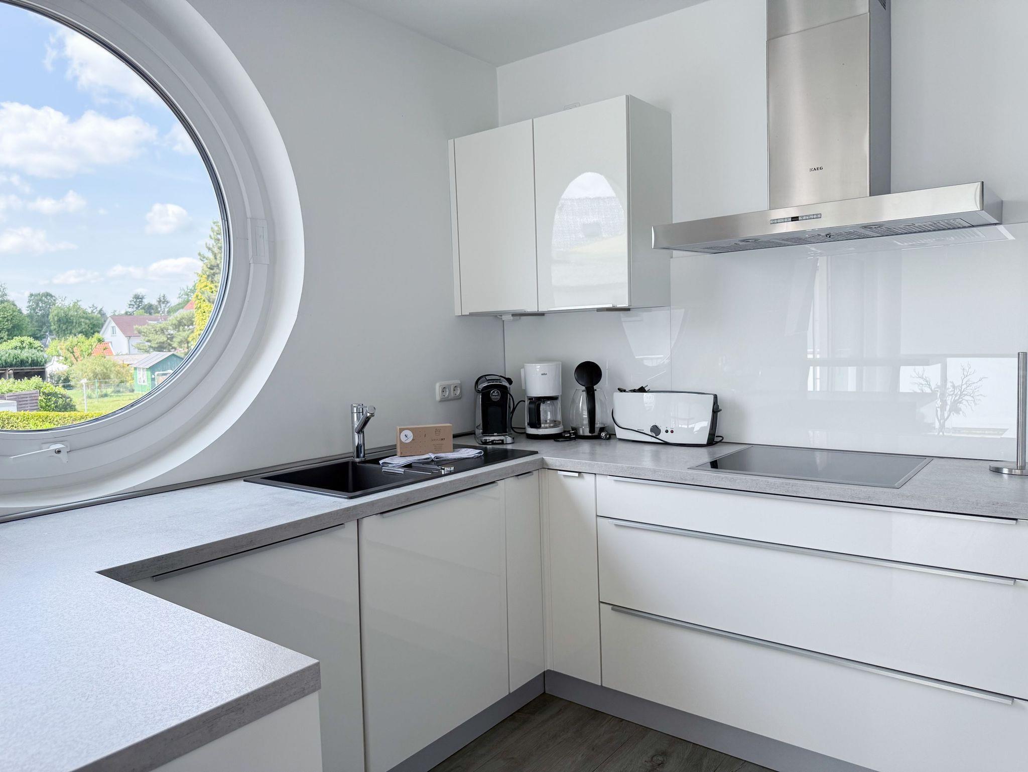 Die luxuriöse Ferienwohnung bietet mit 2 separaten Schlafzimmern ausreichend Platz für 4 Personen, um einen schönen Urlaub zu verleben. Es stehen ein Doppelbett (180x200) und zwei Einzelbetten (80x200) zur Verfügung. Beide Schlafzimmer sind mit einem TV ausgestattet. Bei der Einrichtung und Ausstattung der Immobilie wurde nicht gespart und sehr viel Wert auf hochwertige Materialien gelegt. 3 TV, Hifi-Anlage, Bose Bluetooth Anlage, kostenloser Internetzugang über WLAN, Fußbodenheizung, elektrische Außenjalousien, modernes Duschbad mit viel Tageslicht und integrierter Waschmaschine. Die hochwertige, moderne Einbauküche mit angrenzendem Essbereich ist bestens mit allen technischen Geräten ausgestattet und genügt höchsten Ansprüchen. Sehr charmant ist der Blick ins Grüne durch das große Bullauge. Übergroße Fensterelemente sorgen für einen lichtdurchfluteten Wohnbereich mit Blick zur ruhigen Gartenseite und auf den großzügig angelegten Südwestbalkon mit Dachterrassen Charakter, selbstverständlich komfortabel möbliert mit Sitzgruppe, Sonnenliegen und elektrischer Außenmarkise.
