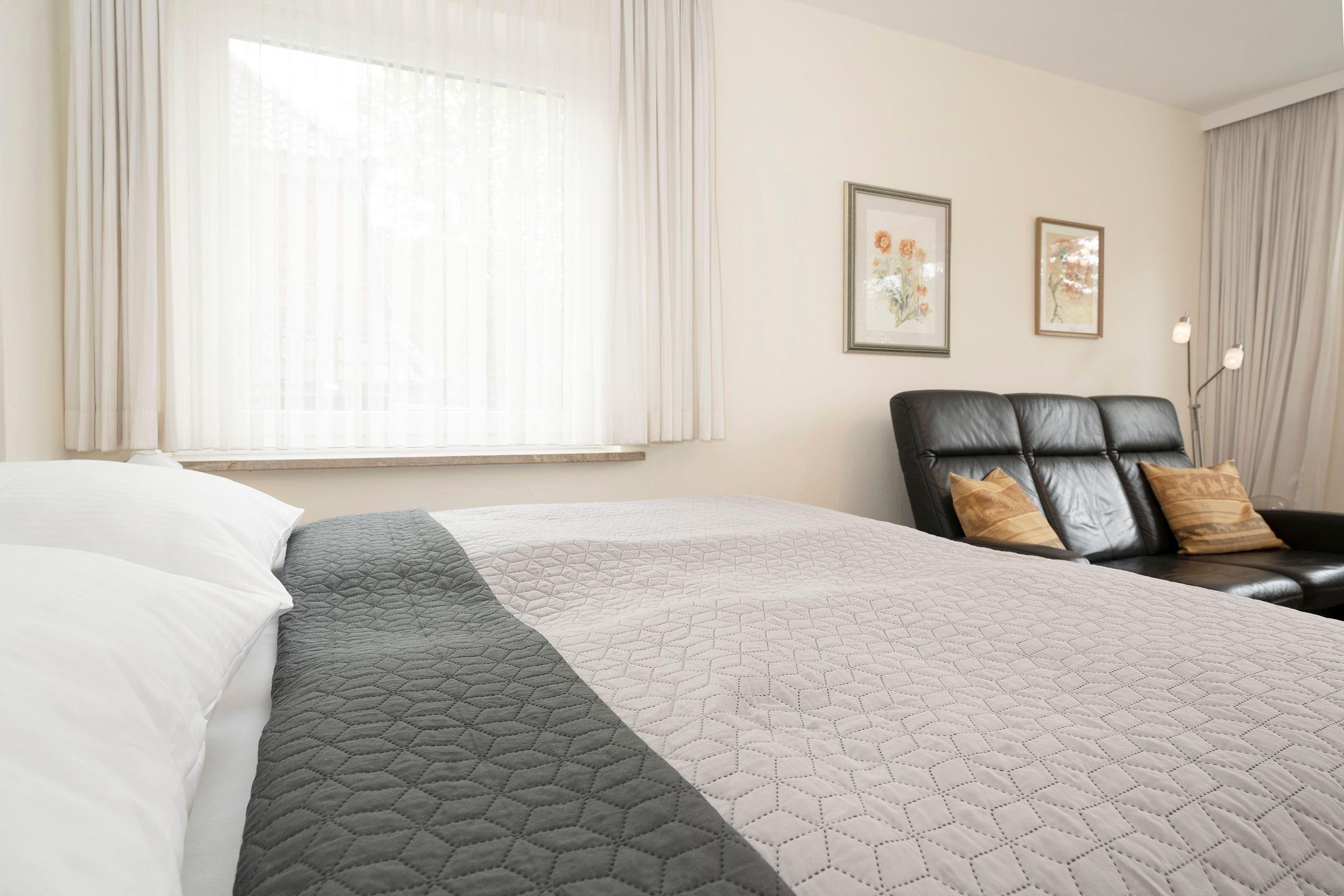 Schlafzimmer: Boxspringbett (180x200 cm), Kleiderschrank, Platz für Kinderreisebett vorhanden, Sichtschutz (Gardinen)