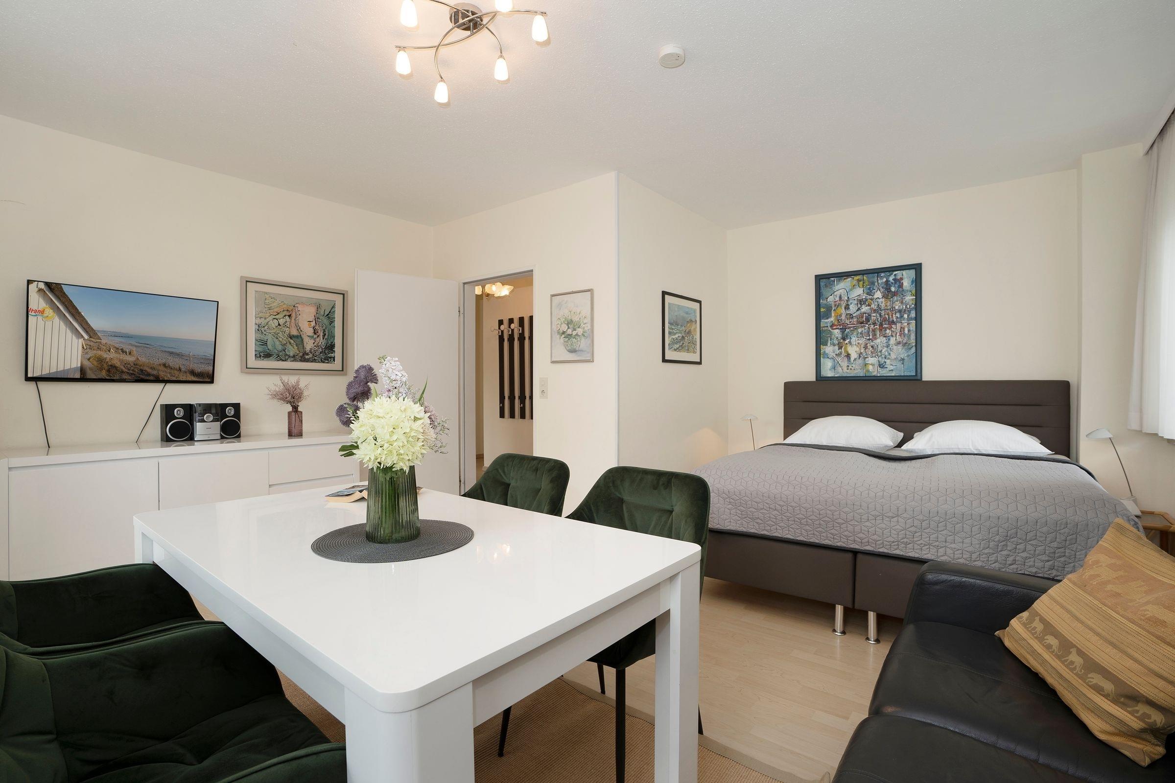 Wer träumt nicht davon, der Ostsee im Urlaub ganz nah zu sein? Die großzügige Ferienwohnung in der Wohnanlage Haus Seepferdchen am Meer ist nur rund 10 Meter vom Ostseestrand entfernt. Hier können Sie Ihre Strandmomente so oft und so lang Sie mögen genießen. Hereinspaziert – der Wohn-/Schlafbereich lädt mit der bequemen Couch sowie der netten Ess-Ecke und dem TV-Gerät zum gemütlichen Verweilen ein. Hier können Sie auch den großzügigen Balkon mit 2 gemütlichen Sitz-Ecken betreten. Wenn Sie nicht gerade Ihre Zeit am Strand verbringen, wird dies sicher Ihr neuer Lieblingsplatz. Zurück im Wohn-/Schlafbereich: In einer gemütlichen Nische verspricht ein Boxspringbett (180x200 cm) angenehme Nachtruhe. Auch das separate Schlafzimmer ist mit einem bequemen Boxspringbett (180x200 cm) ausgestattet. Hier stehen Ihnen ein weiteres TV-Gerät sowie ein großer Kleiderschrank zur Verfügung. Zudem ist hier genügend Platz, um ein Kinderreisebett aufzustellen. Das Besondere: Auch hier haben Sie Zutritt auf den großzügigen Balkon. In der kleinen, separaten Küche mit Spülmaschine finden Sie alle Annehmlichkeiten, die Sie zum Zubereiten Ihrer Urlaubsmenüs brauchen. Einen angenehmen Start in den neuen Tag bietet das moderne Duschbad mit Fenster und Handtuchwärmer.