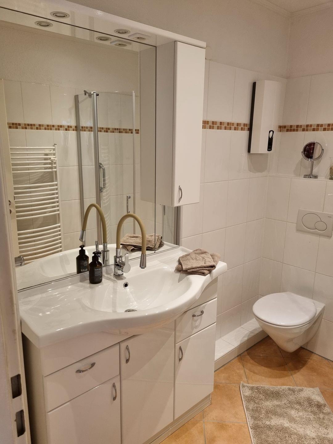 Das Badezimmer ist mit einer Dusche ausgestattet und verfügt über viel Stauraum. Ein Fön ist ebenfalls vorhanden.