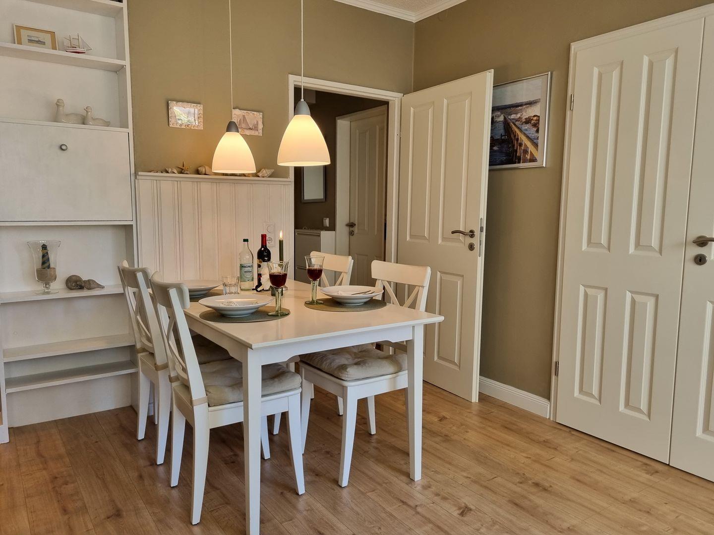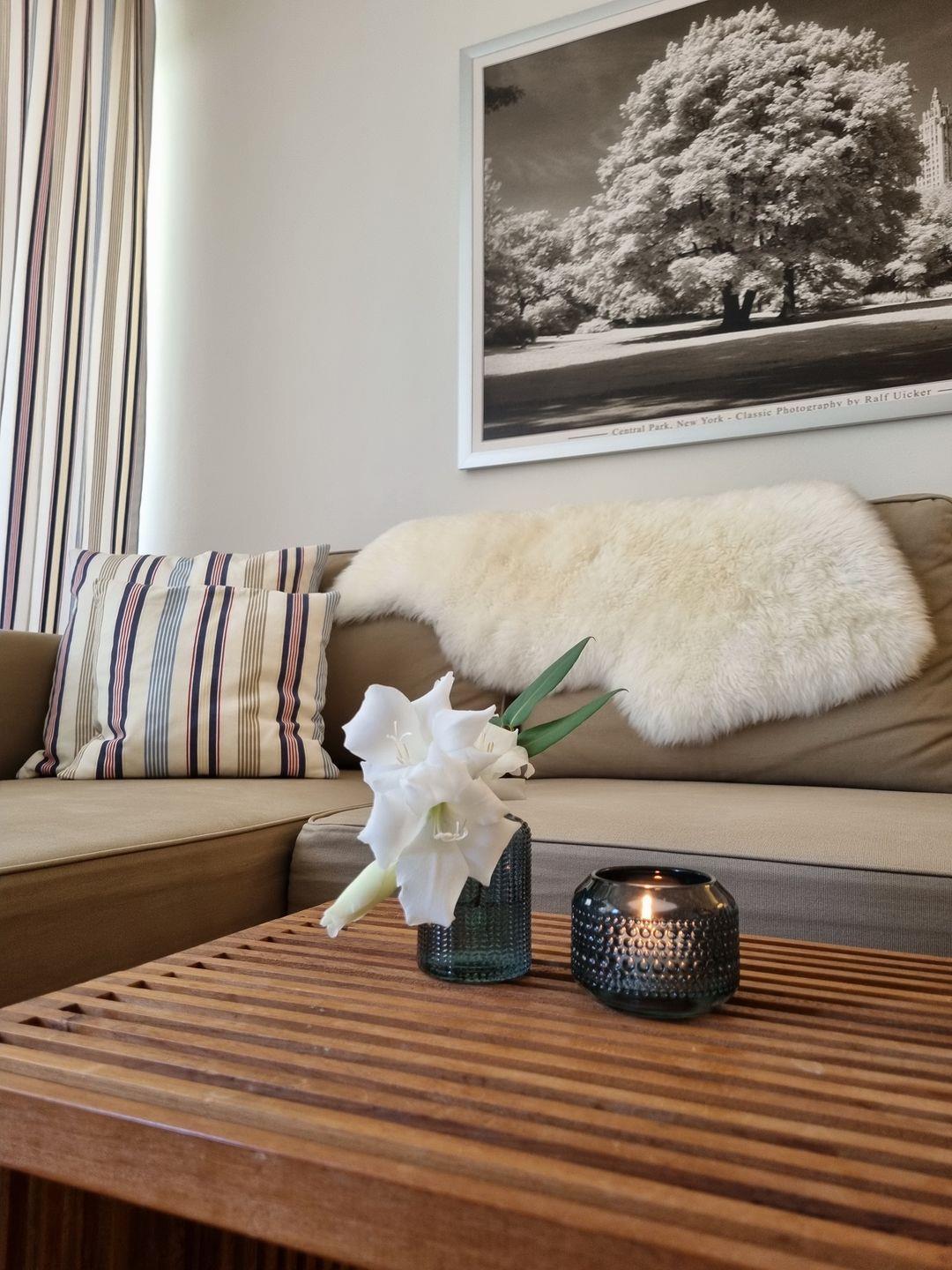 Das Apartment für 2 - 4 Personen ist geschmackvoll eingerichtet und verfügt über einen offenen Wohnbereich mit einer voll ausgestatteten Küche, einem gemütlichen Essbereich und einem Wohnbereich mit (Schlaf)Sofa und einem bequemen Sessel.