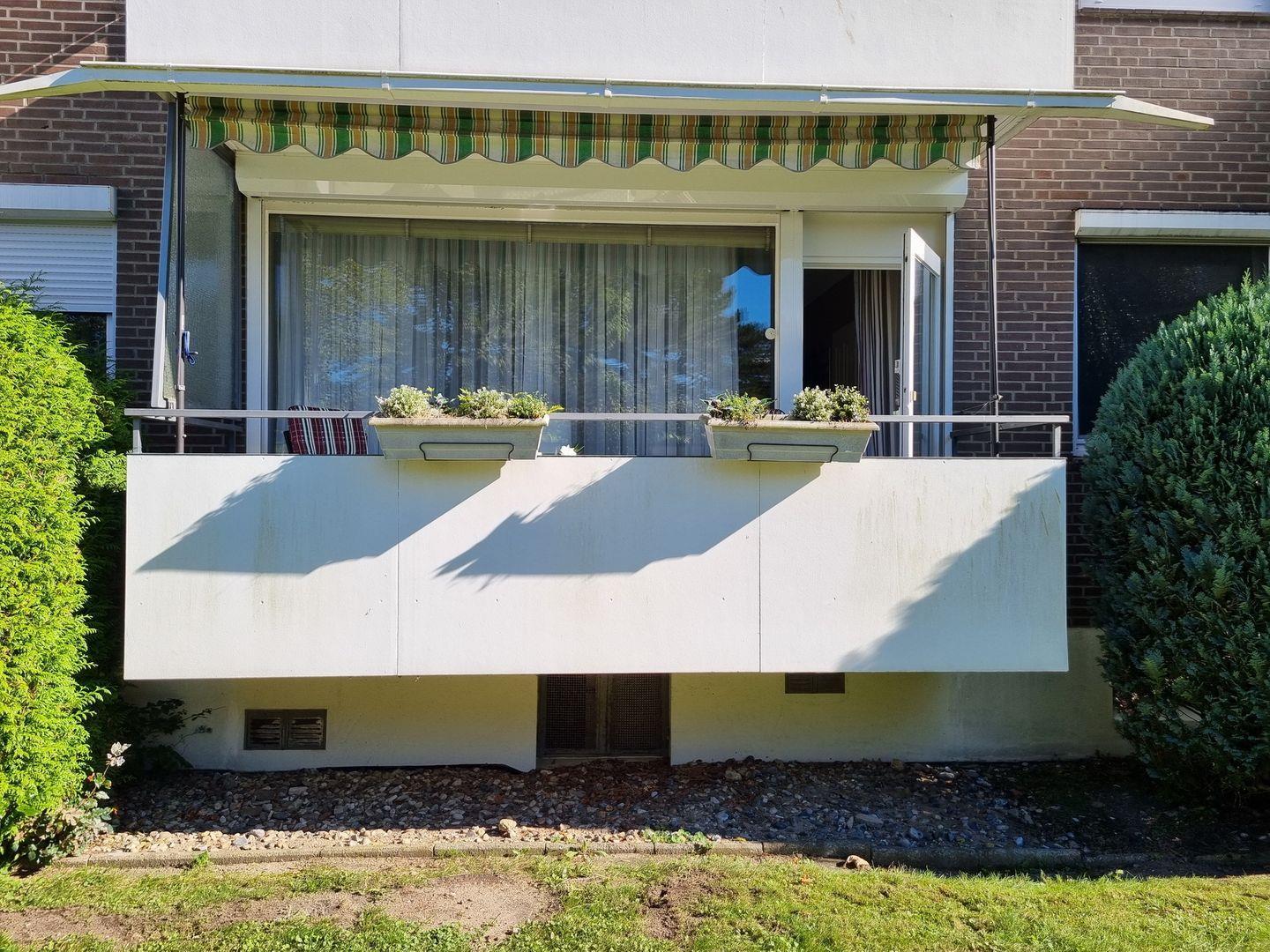 Der Balkon mit Blick in den Garten schließt mit großen Fenstern direkt an den Wohnbereich an.