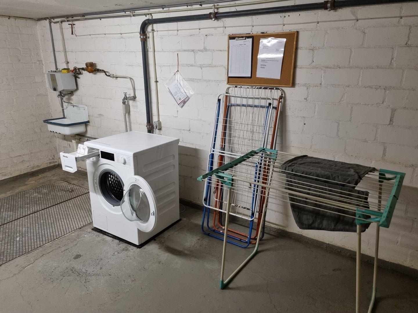 Eine Waschmaschine und ein Wäscheständer stehen zur Verfügung.