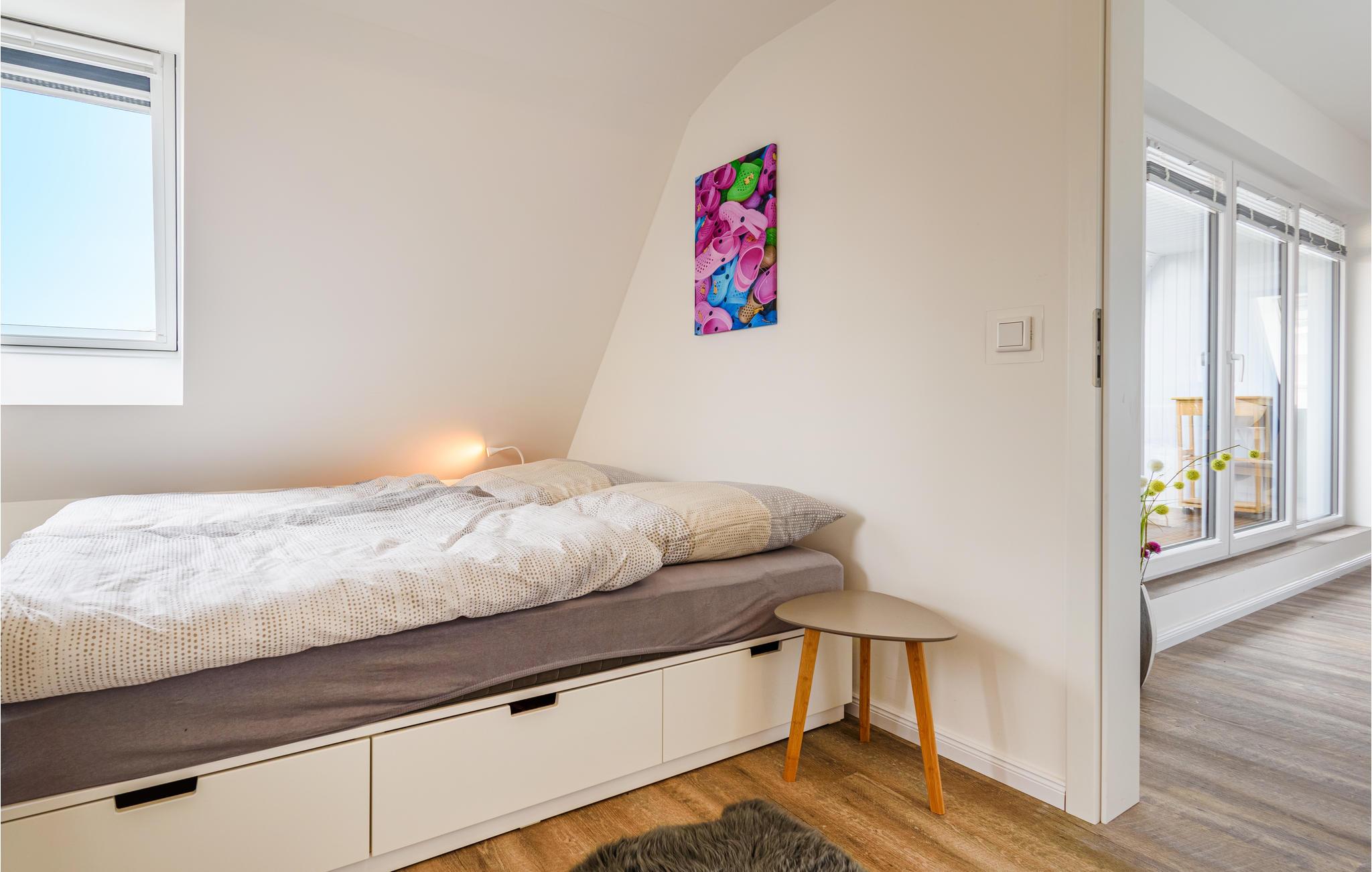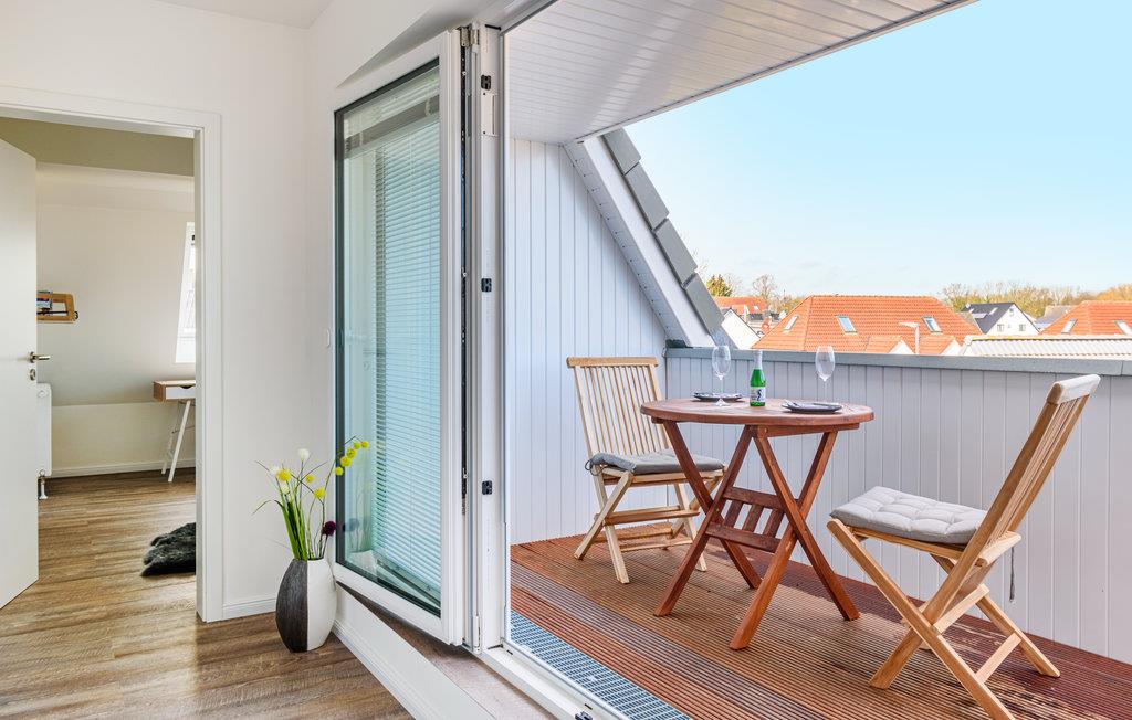 Das Ferienapartment ist durch die großzügige Balkontür besonders hell und freundlich. Der offene Wohnbereich und die Küche sind mit allem ausgestattet, was man für einen angenehmen Aufenthalt braucht. In der Küche befindet sich eine Pad- sowie eine Filterkaffeemaschine. Der große Balkon verfügt über einen Grill und ausreichend Sitzgelegenheiten. Hier können Sie mit einem wunderbaren Ausblick auf den Ort frühstücken oder abends angenehm grillen. Zur Ferienwohnung gehört eine Tiefgarage, die Sie von außen per Lastaufzug erreichen. Auch ein großes Fahrzeug findet hier Platz. Zusätzlich gibt es einen Fahrradkeller, in dem Sie Fahrräder oder Sportgeräte sicher aufbewahren können. In die Wohnung gelangen Sie auch von dort aus bequem per Aufzug.