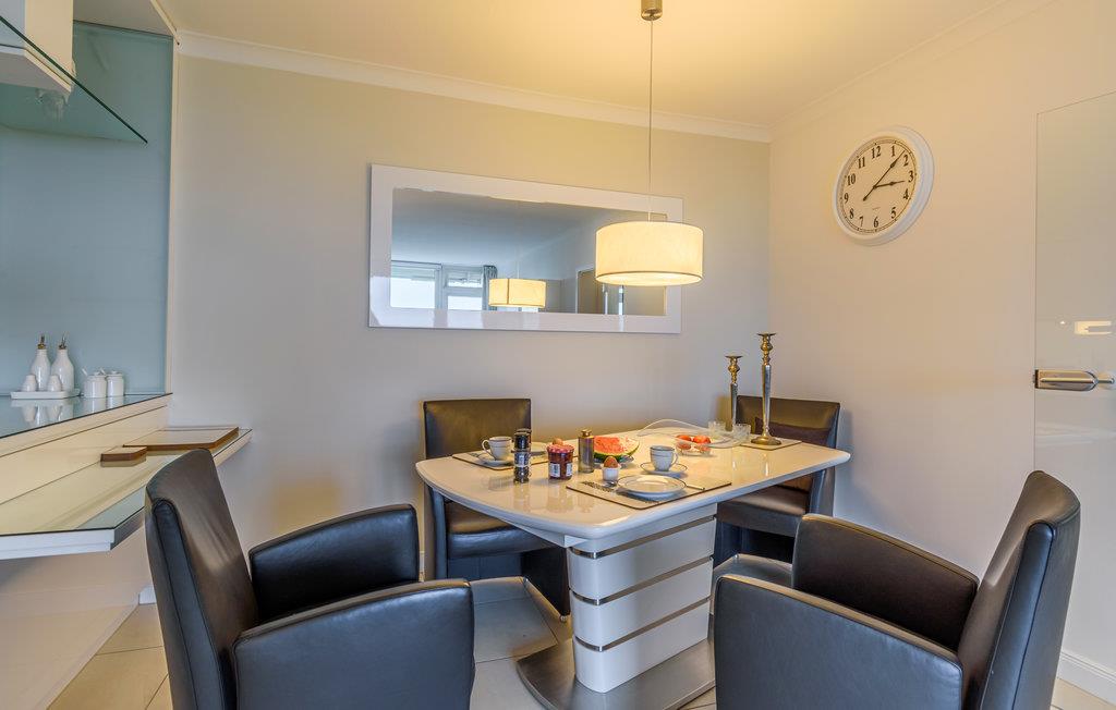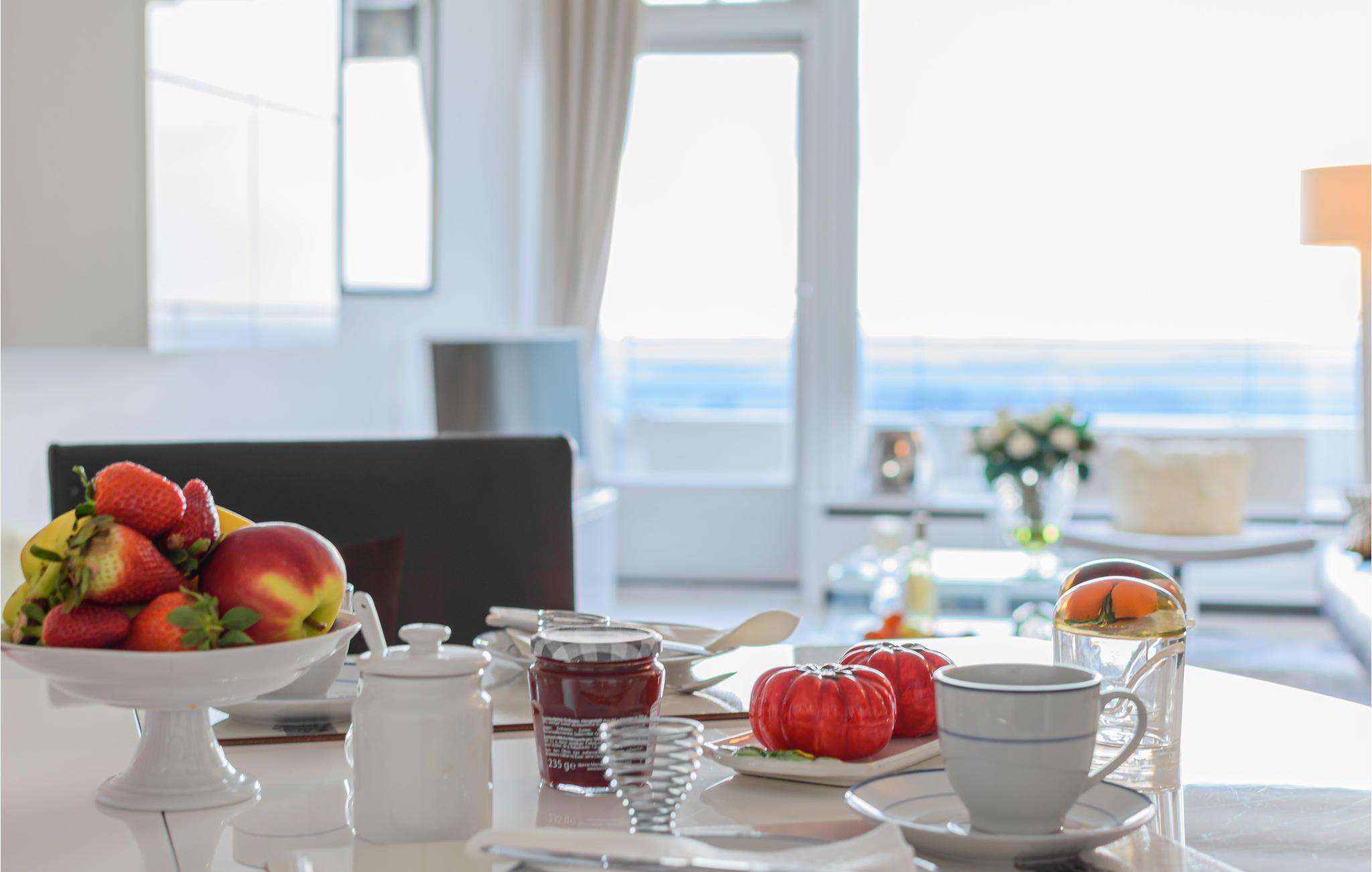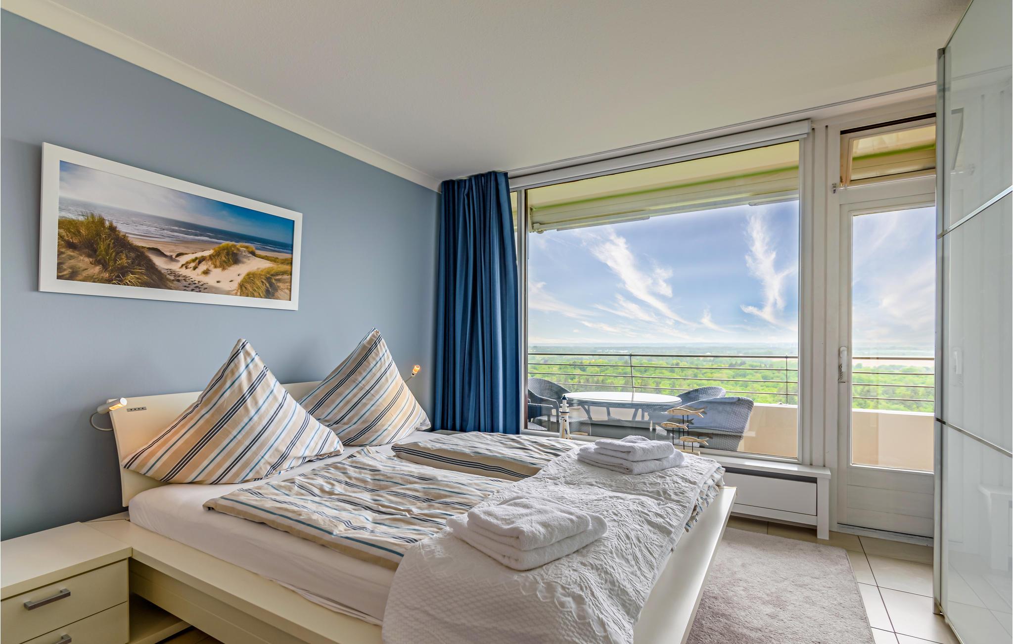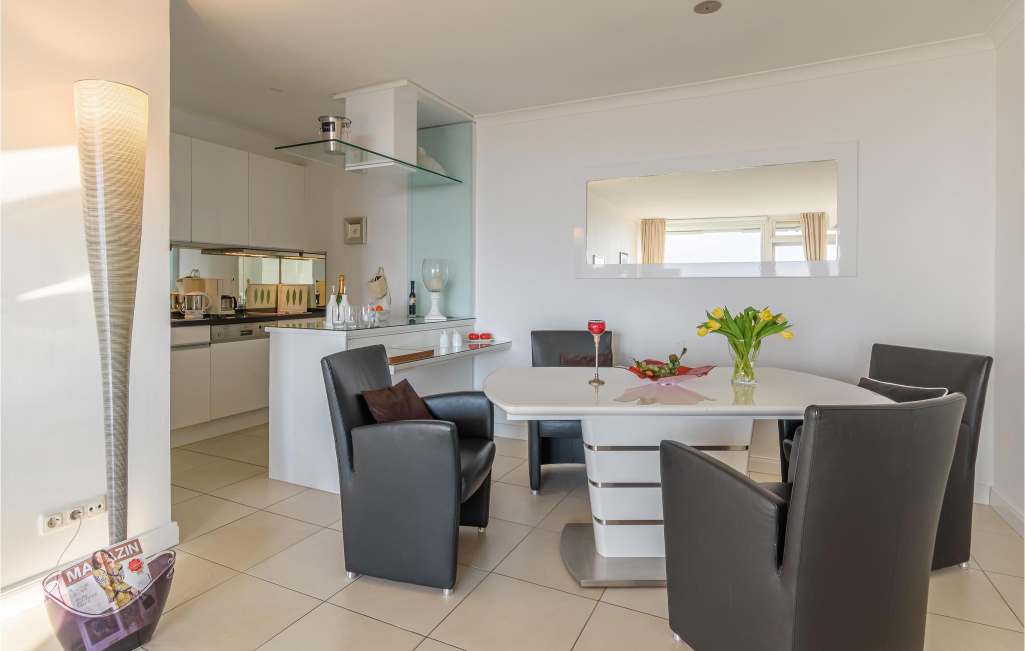 Das Apartment hat einen großen Wohn- und Essbereich mit einer kleinen aber voll ausgestatteten Küche. Das große Fenster und die Balkontür sorgen auch von hier aus für eine phantastische Aussicht. Auch aus dem großzügigen Schlafzimmer heraus haben Sie Zugang zu Ihrem großen Balkon auf dem ein Tisch und zwei Sonnenliegen für entspannte Stunden auf Sie warten. Das moderne Duschbad lässt keine Wünsche offen, Haarföhn, Bügeleisen und -brett sind vorhanden.