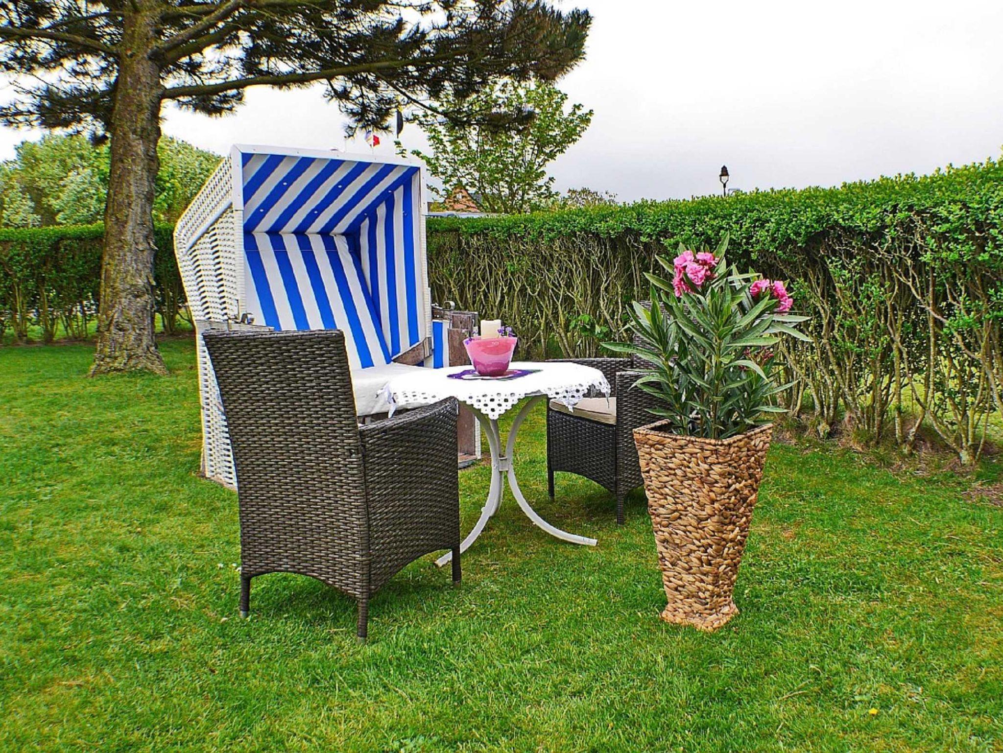 Sitzecke im Garten zur Mitbenutzung, Sylter-Strandkorb, Fahrradständer, Parkplatz vor dem Haus.