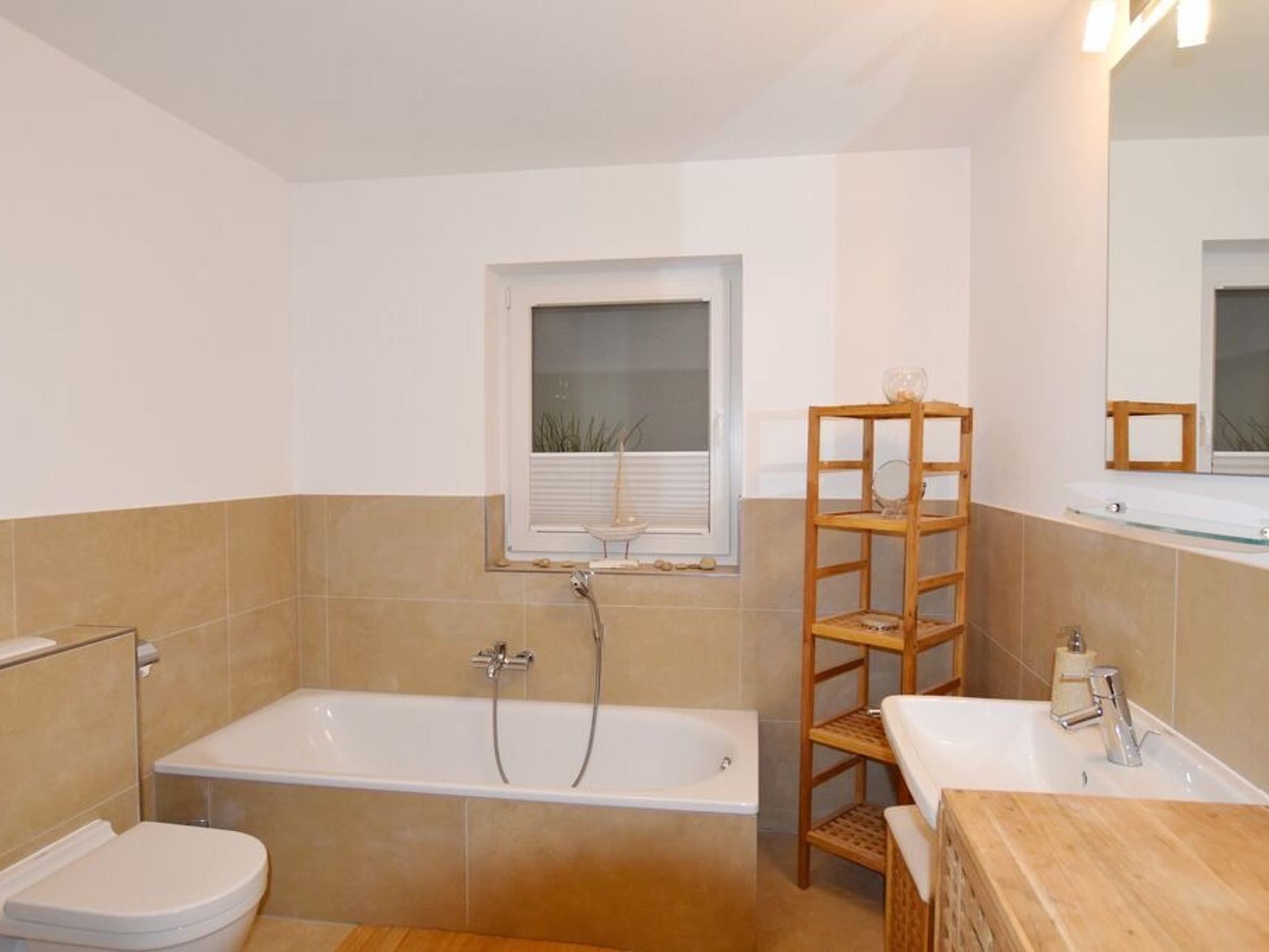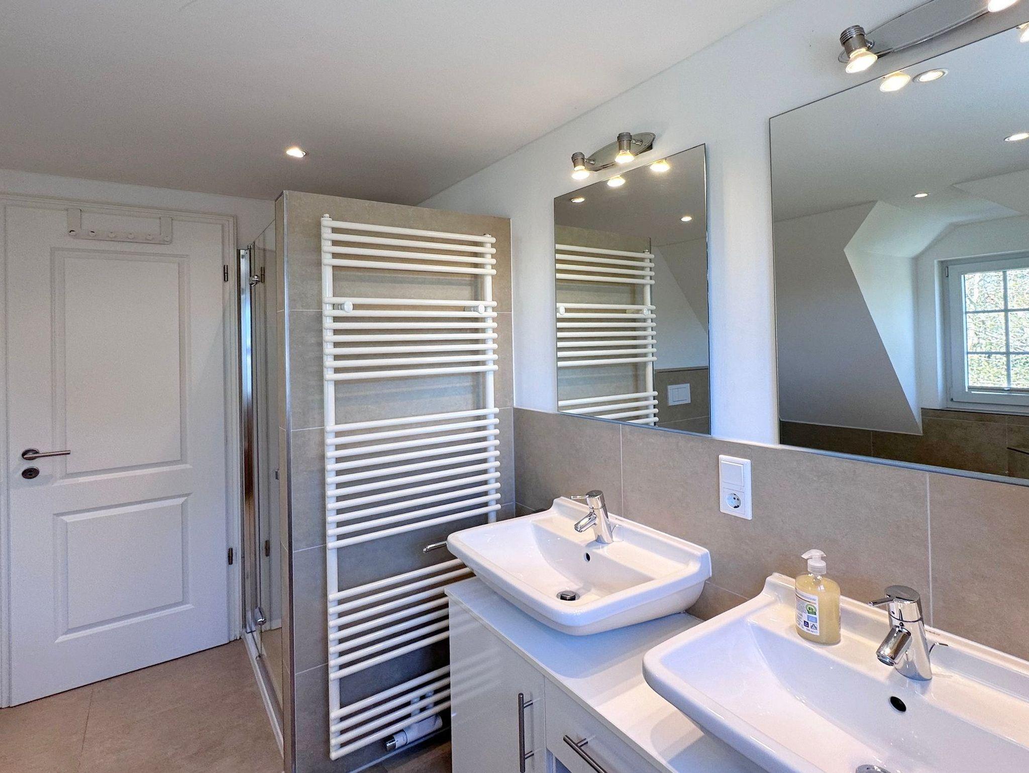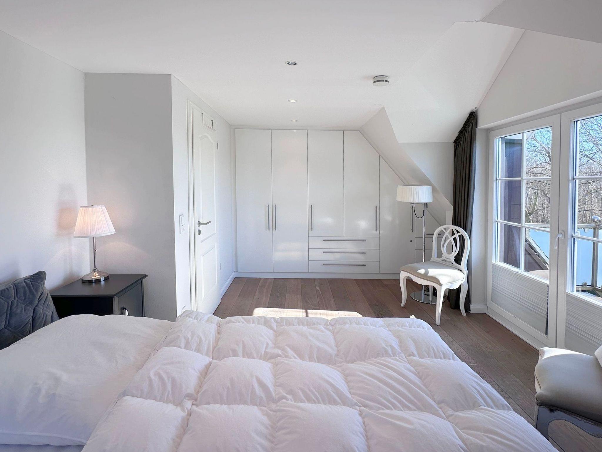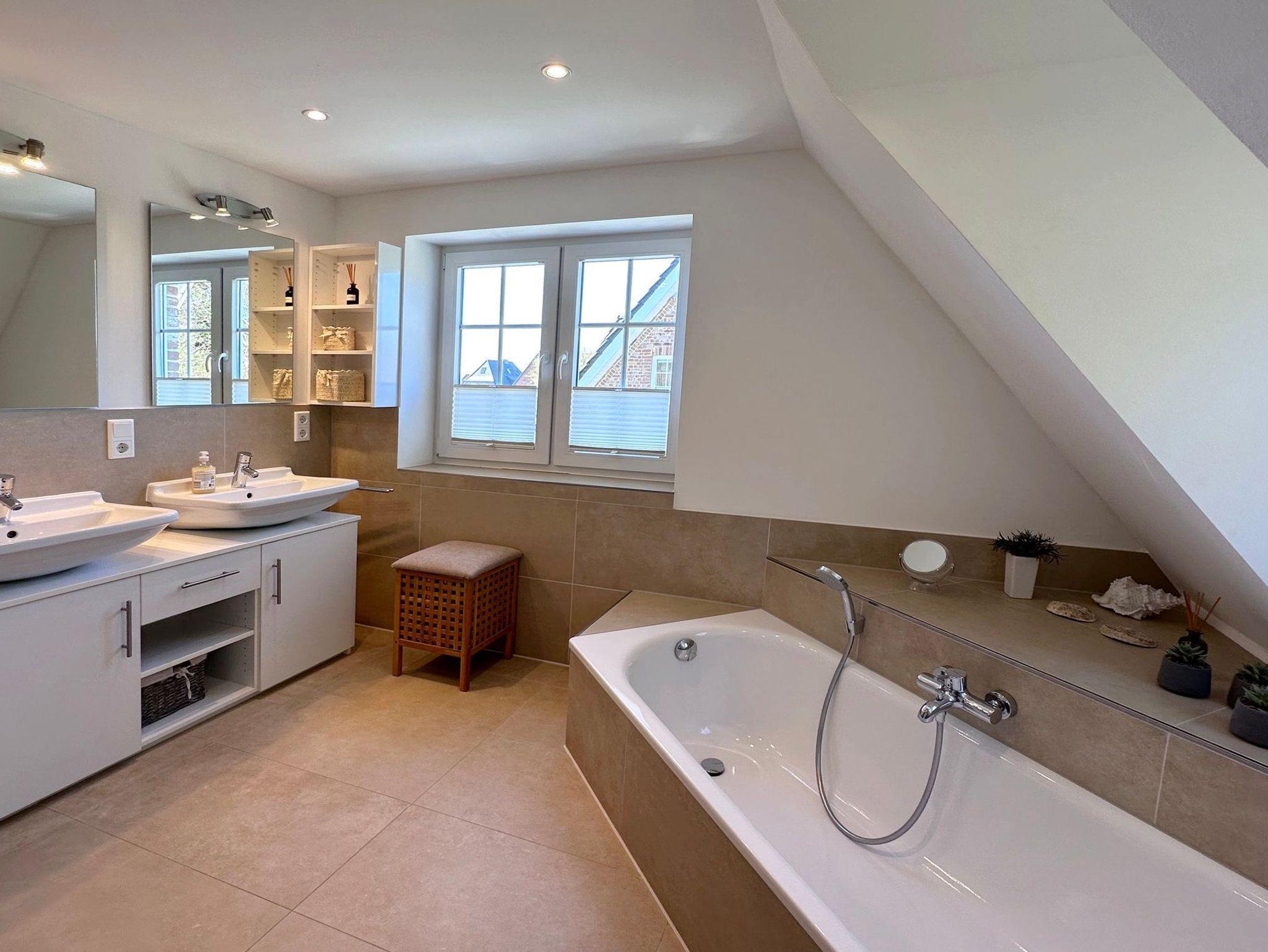 OG: grosses Schlafzimmer mit Doppelbett, Einbauschränken und zusätzlichem TV, kleines Schlafzimmer mit Einzelbett, grosses modernes Badezimmer mit Doppelwaschbecken, Wanne und Dusche,