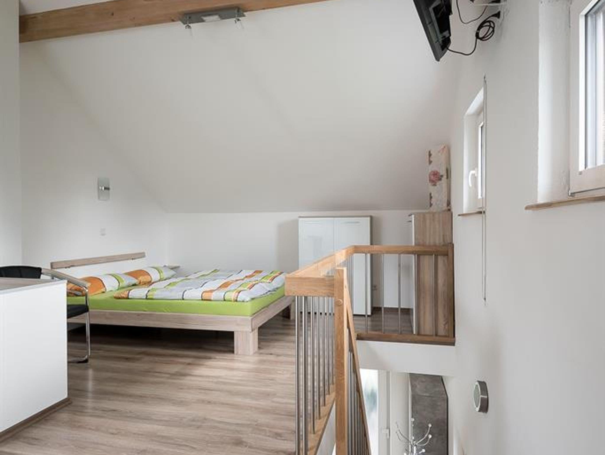 Studio, Küche, Bad -Dusche, Schlaf-Wohnraum, zweite Etage, französiches Bett, Beistellbett möglich, grosse Wiese mit Baumbestand, Terrasse mit Gartenmöbel, Grillmöglichkeit