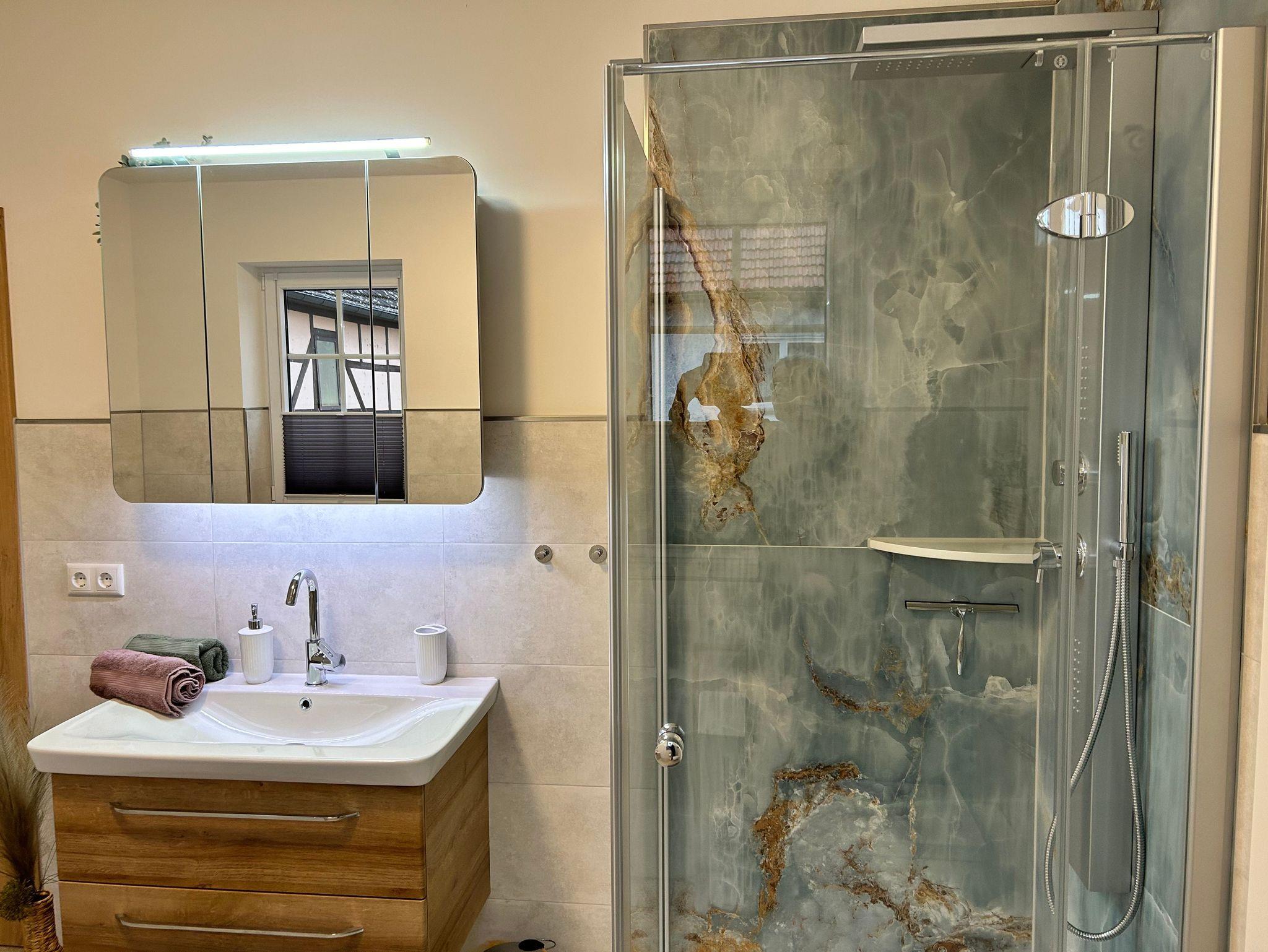 • 1 Badezimmer mit ebenerdiger Dusche, Badewanne, Toilette, Waschmaschine, Haartrockner, Handtücher