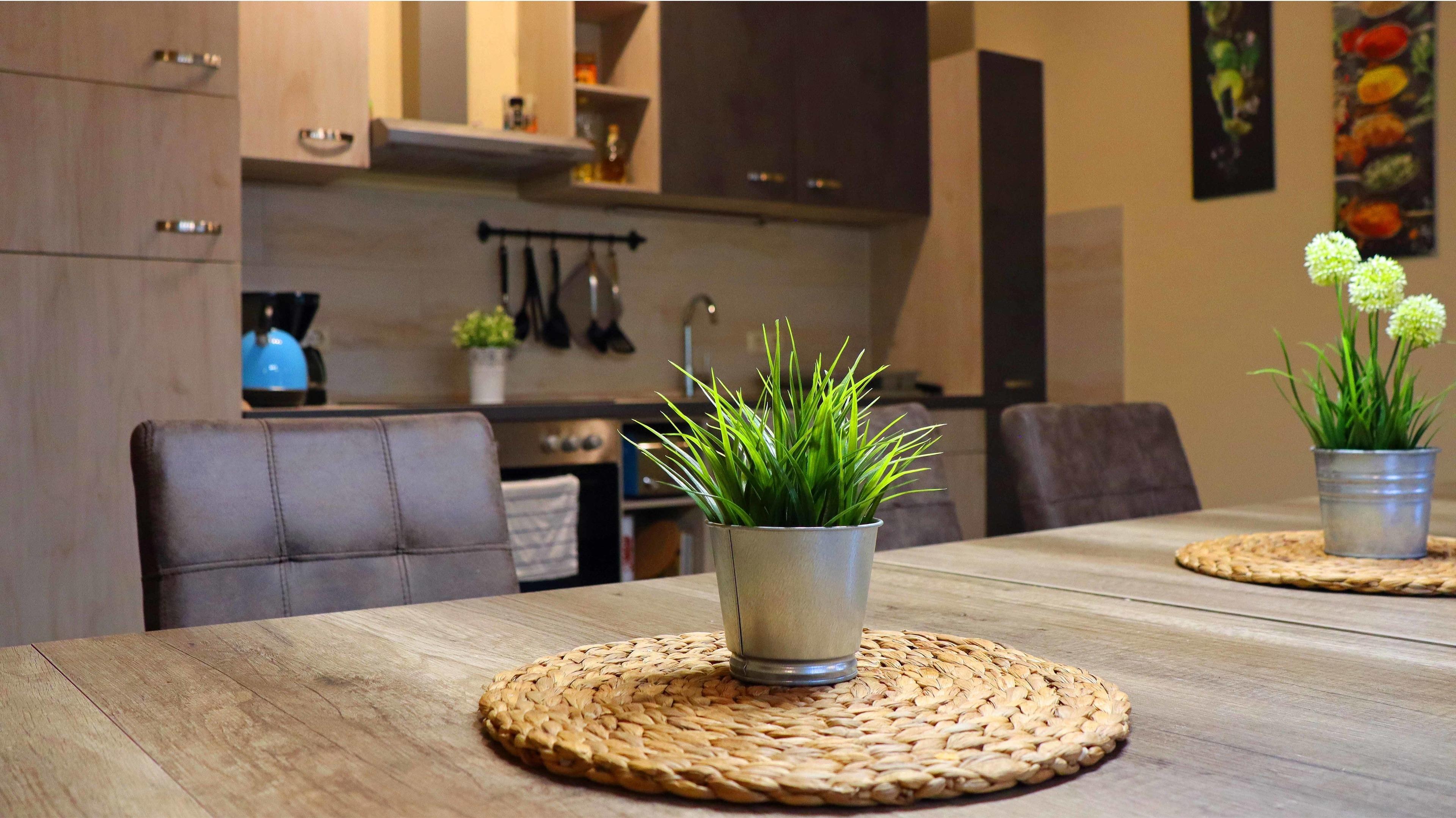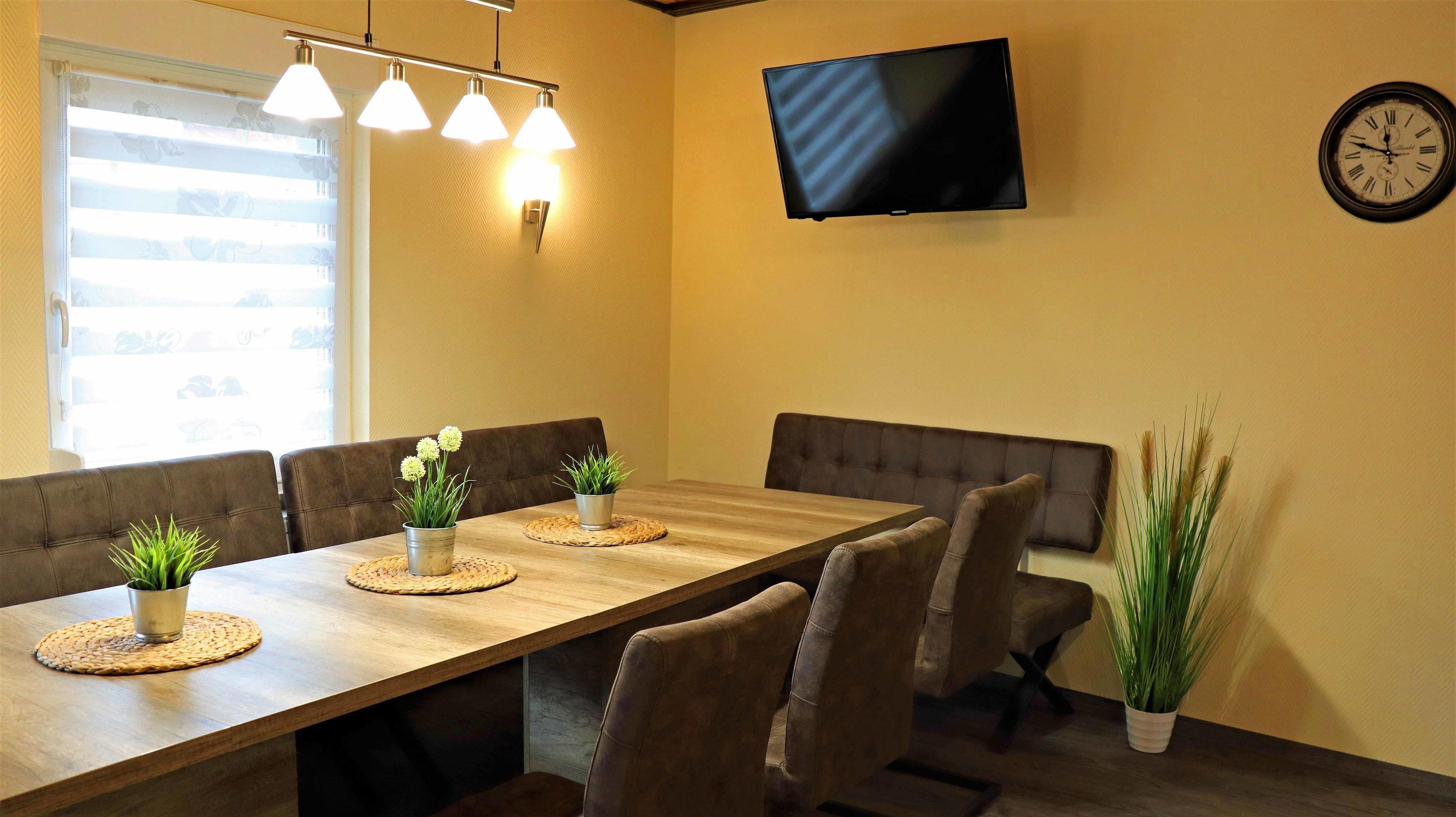 Die gut ausgestattete Wohnküche bildet den Mittelpunkt der Ferienwohnung: am Esstisch befinden sich bequeme Lederstühle und -bänke für 11 Personen sowie ein großer Flat-TV. Lassen Sie sich hier zum Essen oder gemeinsamen Plauschen nieder - so beginnt der Urlaubstag schon beim Frühstücken relaxed. Zum Zubereiten und Kochen jeglicher Gerichte finden Sie alles in der offenen Wohnküche: Kühlschrank mit Gefriermöglichkeit, Herd, Backofen, Mikrowelle, Wasserkocher, Toaster, Kaffeemaschine oder Geschirrspüler erleichtern die Arbeit. Sie brauchen auch im Urlaub einen Internetanschluss? Kein Problem. In der Wohnung steht Ihnen WLAN kostenfrei zur Verfügung. Für Ihren PKW gibt es mehrere Stellplätze auf dem Grundstück.
