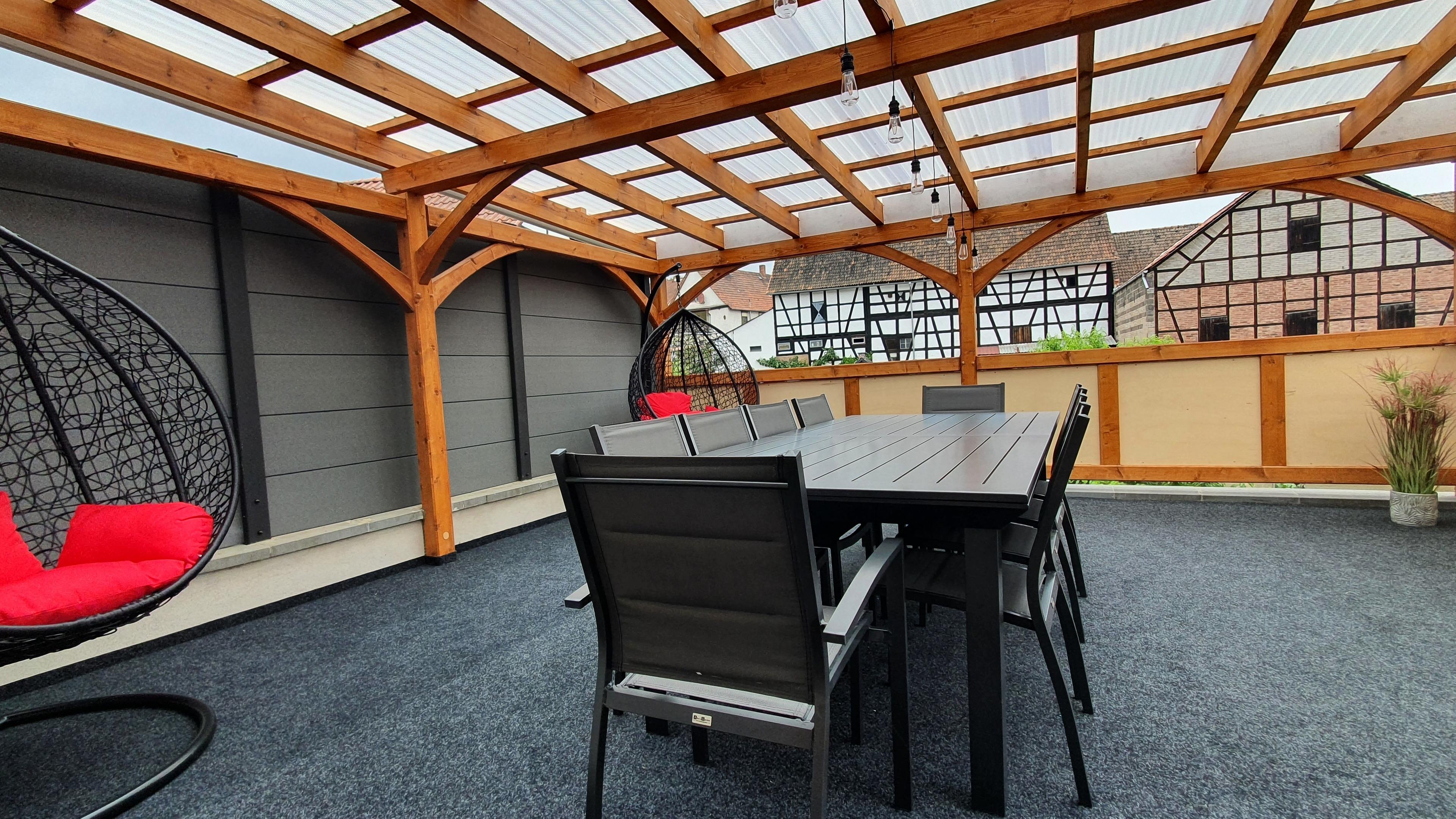 Doch nun zum eigentlichen Highlight: Im Innenhof lädt eine rustikale Pergola mit Sitzmöglichkeit zum Essen und einer Lounge zum Entspannen ein. Auch ein Grill und eine Feuerschale stehen zur Verfügung. Selbstverständlich darf der Pool des Landhotel mit genutzt werden.