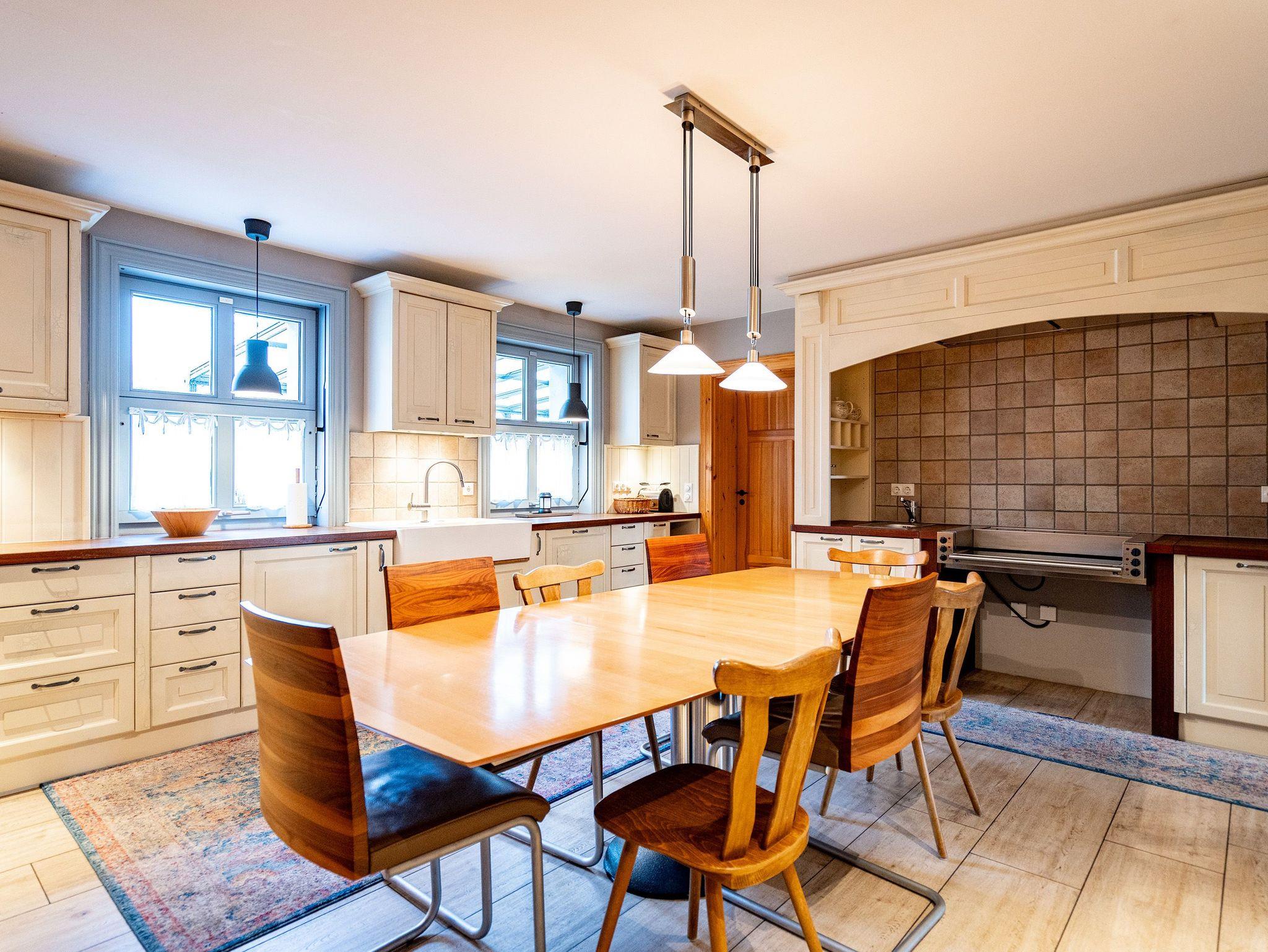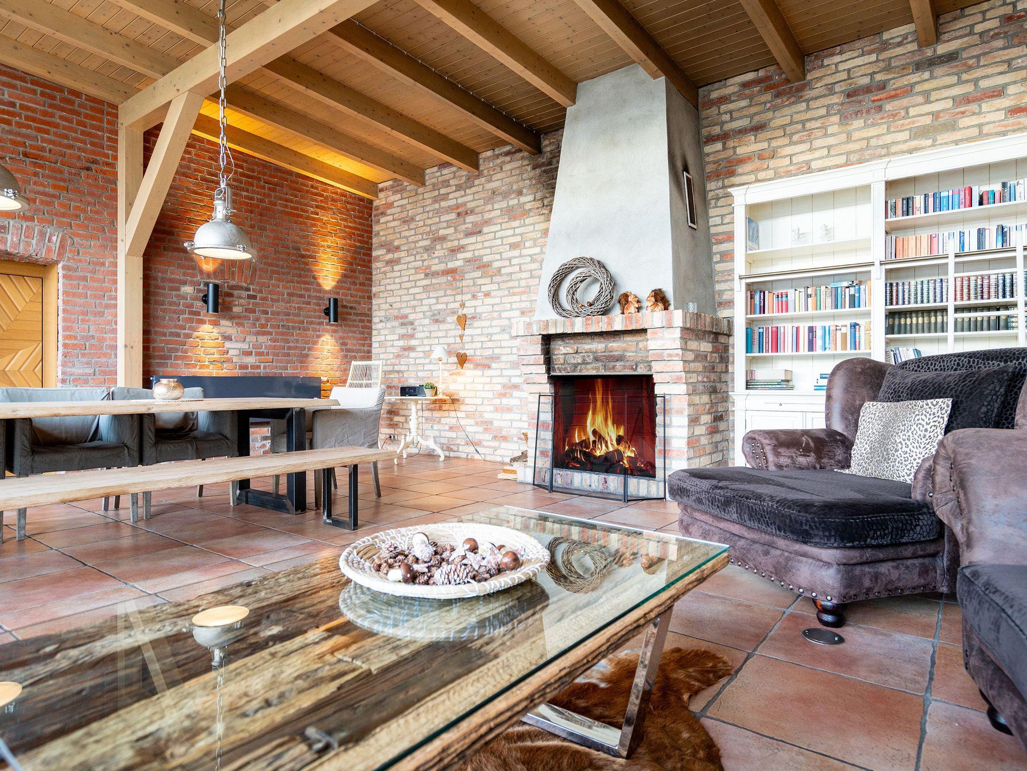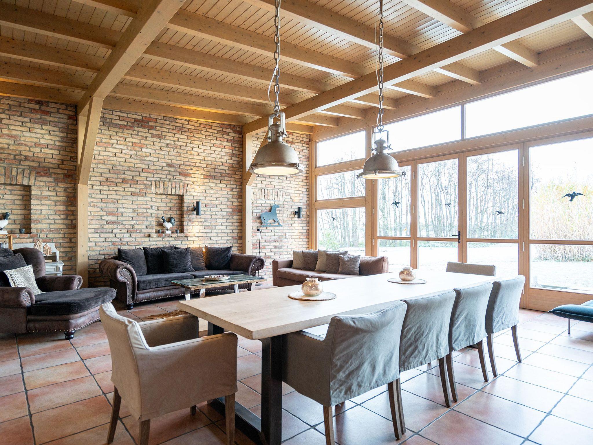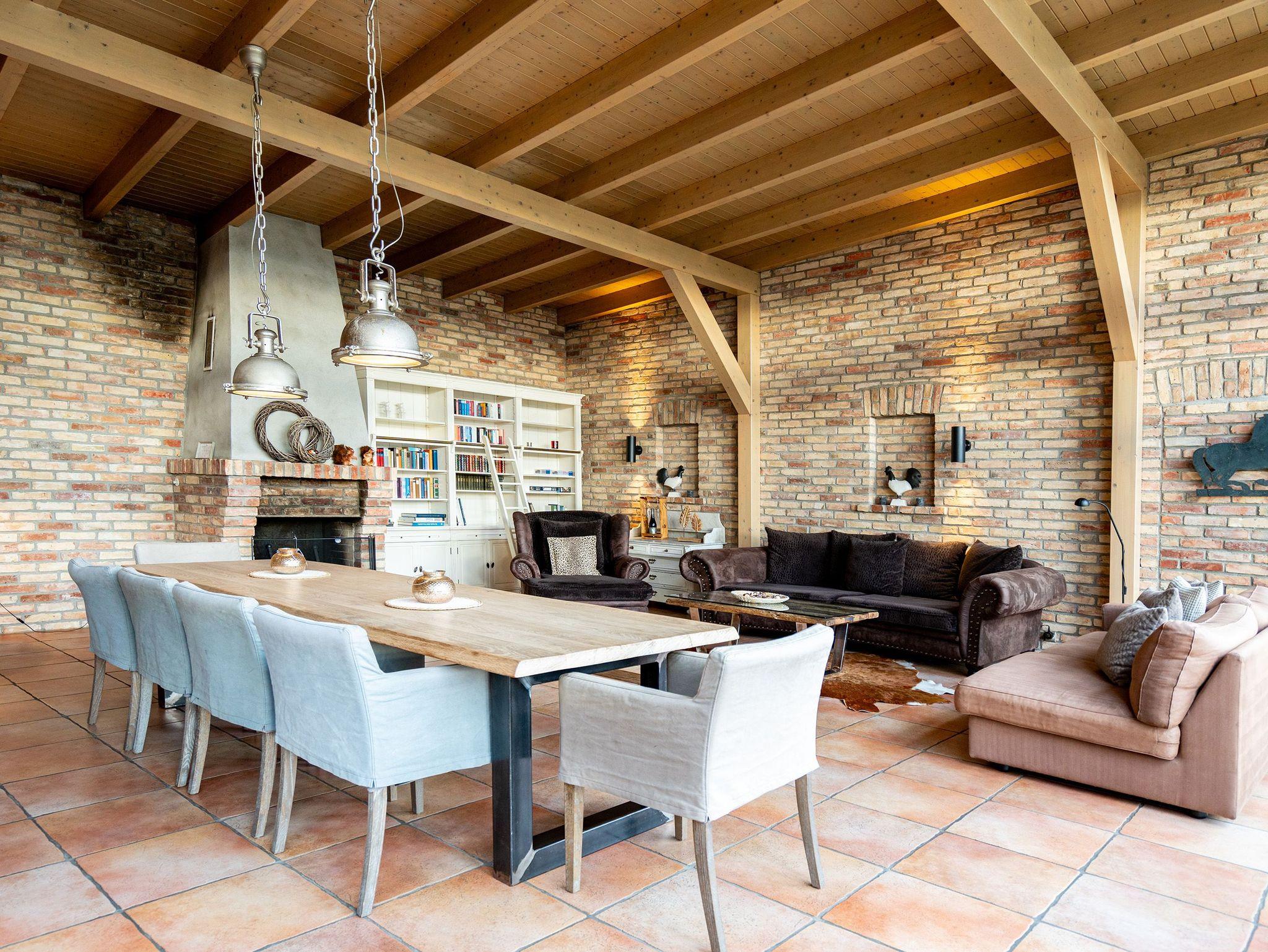 Im Inneren verschmelzen Industriedesign-Möbel mit rustikalen Echtholzmöbeln zu einem modernen und stilvollen Landhausstil. Großzügige Räume im Erdgeschoss ermöglichen gemeinsame Aktivitäten. Vom großzügigen Wohnraum mit offenem Kamin und Flachbildfernseher über urige Steinwände bis zu gemütlichen Sofalandschaften (mit Schlaffunktion) gelangt man zur Hauptküche. Der zentrale Essbereich bietet viel Platz zum Arbeiten und Kochen, sogar auf Induktionsplatten. Alle Geräte wie Spülmaschine, Kühl- und Gefrierschrank, Kaffeemaschine und Backofen stammen von hochwertigen Markenherstellern.