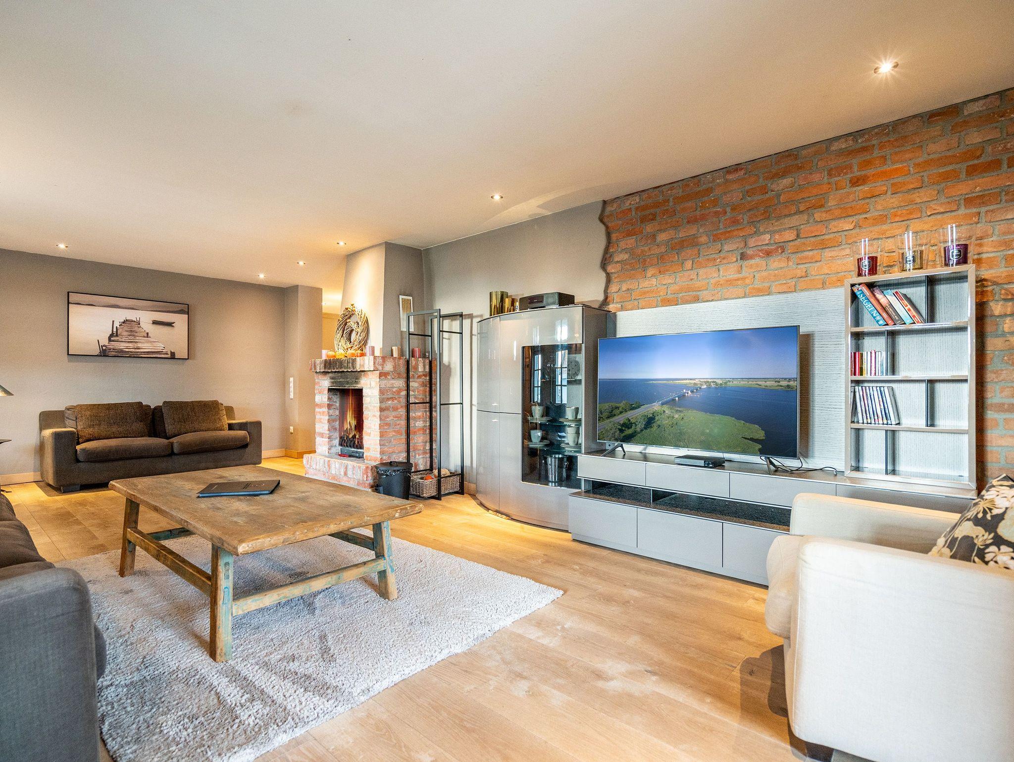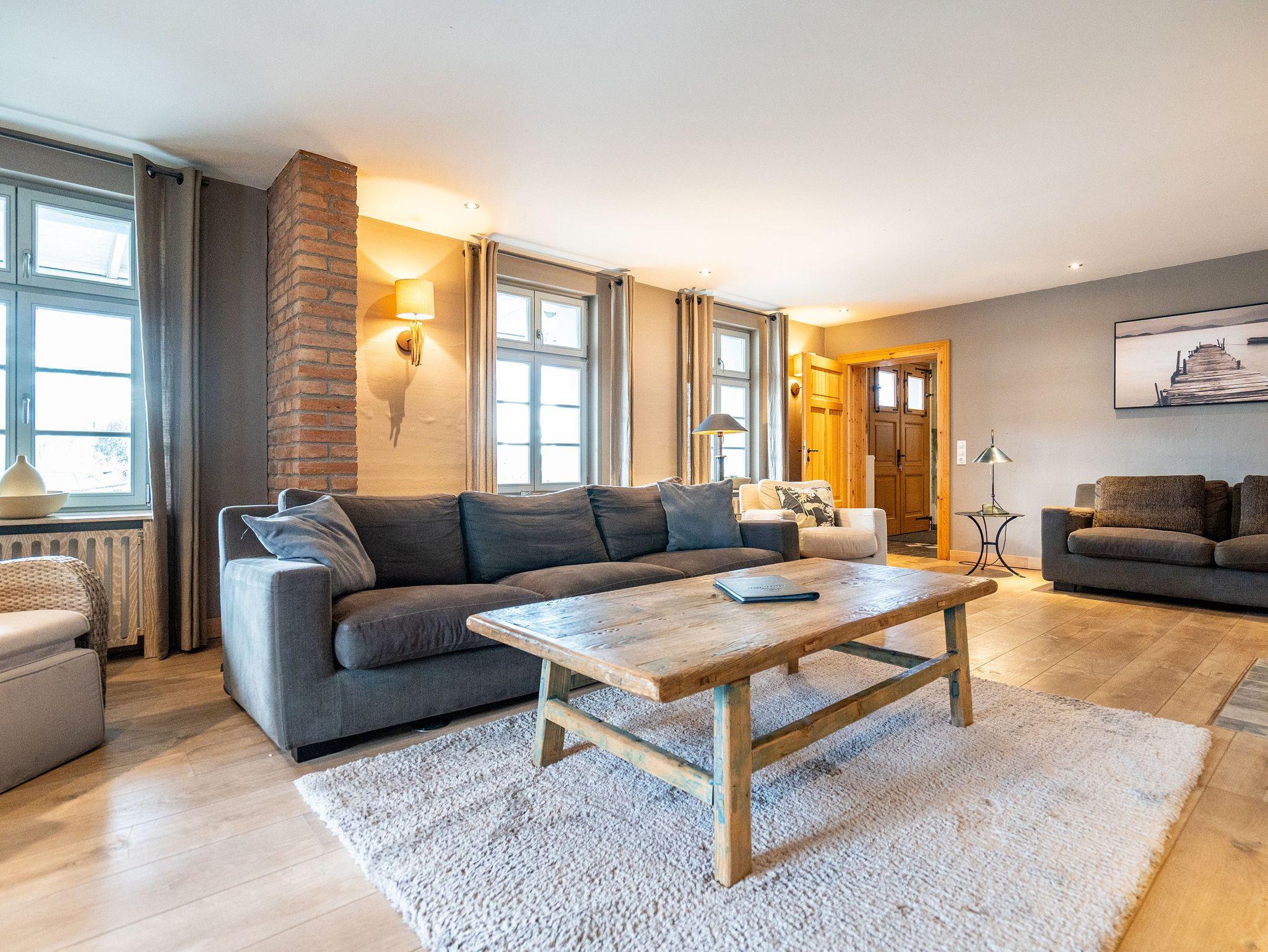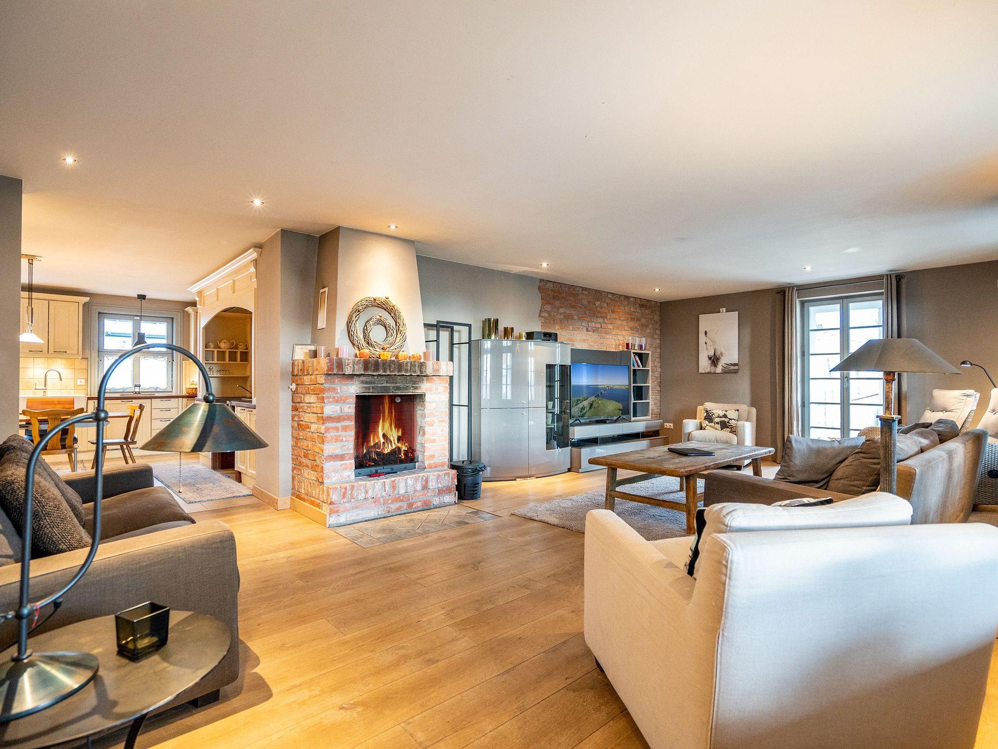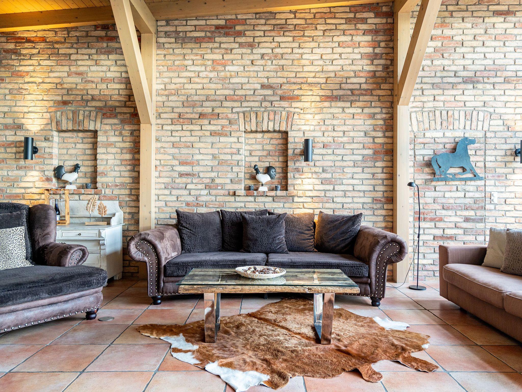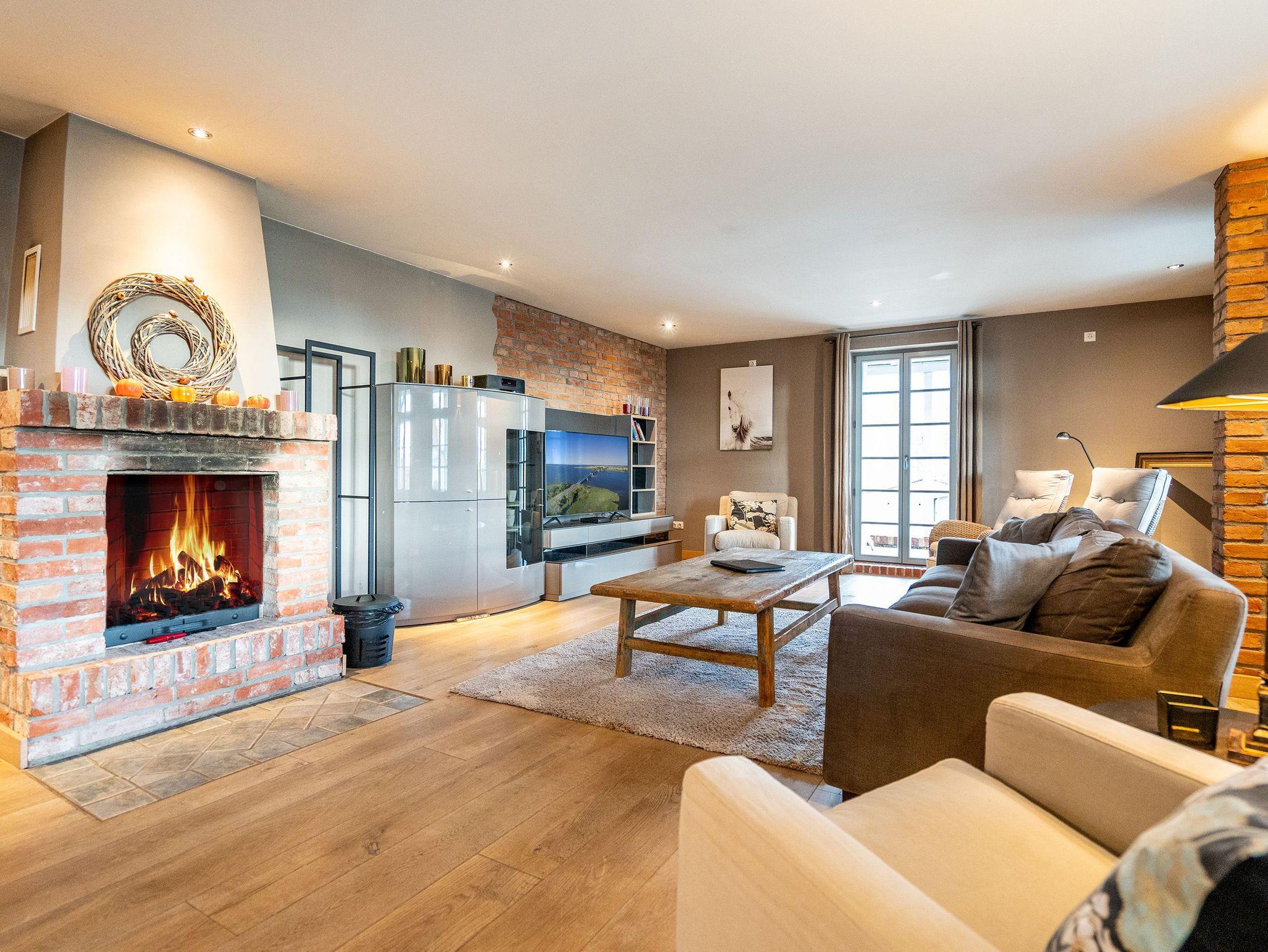 Im Inneren verschmelzen Industriedesign-Möbel mit rustikalen Echtholzmöbeln zu einem modernen und stilvollen Landhausstil. Großzügige Räume im Erdgeschoss ermöglichen gemeinsame Aktivitäten. Vom großzügigen Wohnraum mit offenem Kamin und Flachbildfernseher über urige Steinwände bis zu gemütlichen Sofalandschaften (mit Schlaffunktion) gelangt man zur Hauptküche. Der zentrale Essbereich bietet viel Platz zum Arbeiten und Kochen, sogar auf Induktionsplatten. Alle Geräte wie Spülmaschine, Kühl- und Gefrierschrank, Kaffeemaschine und Backofen stammen von hochwertigen Markenherstellern.