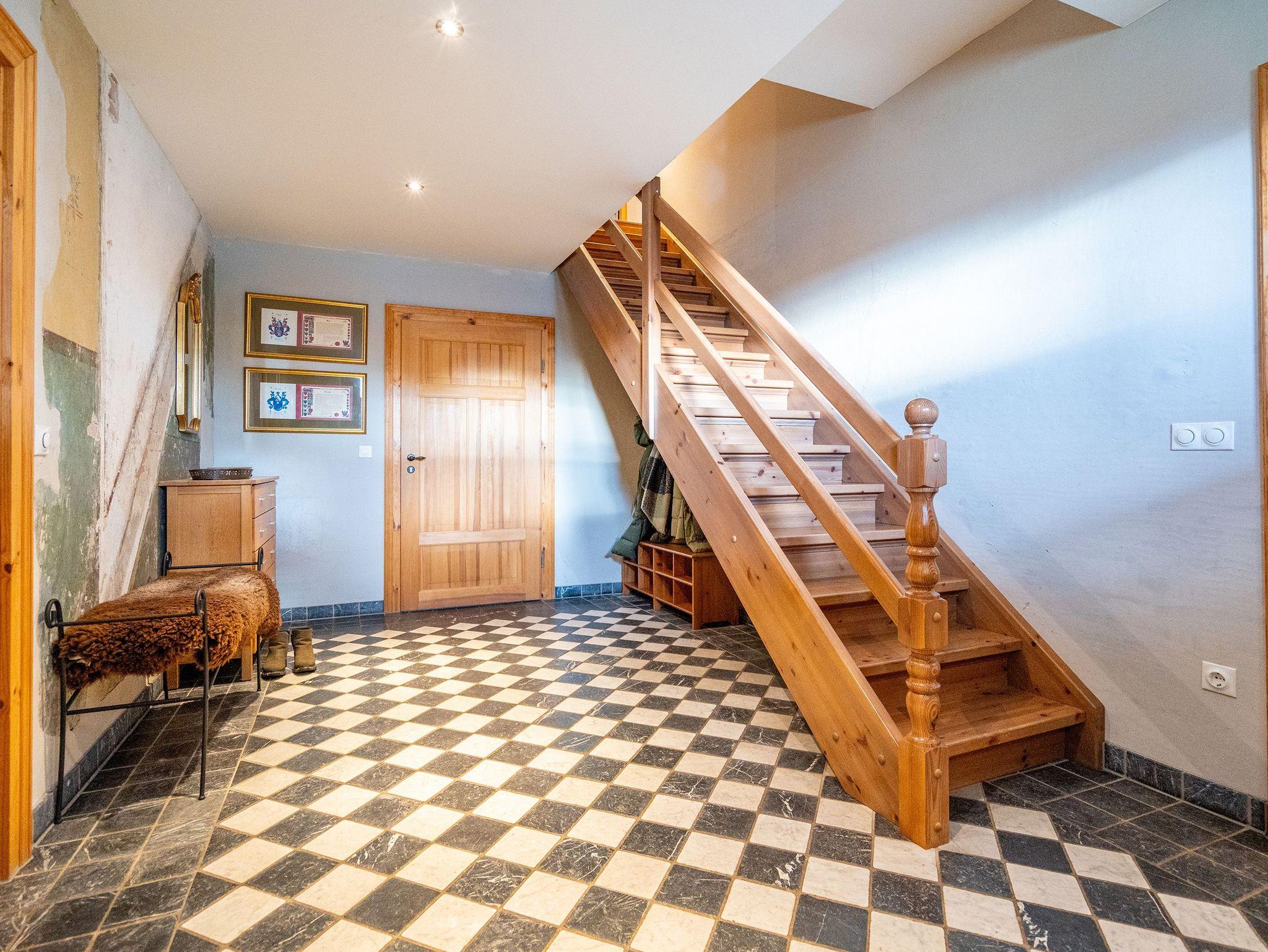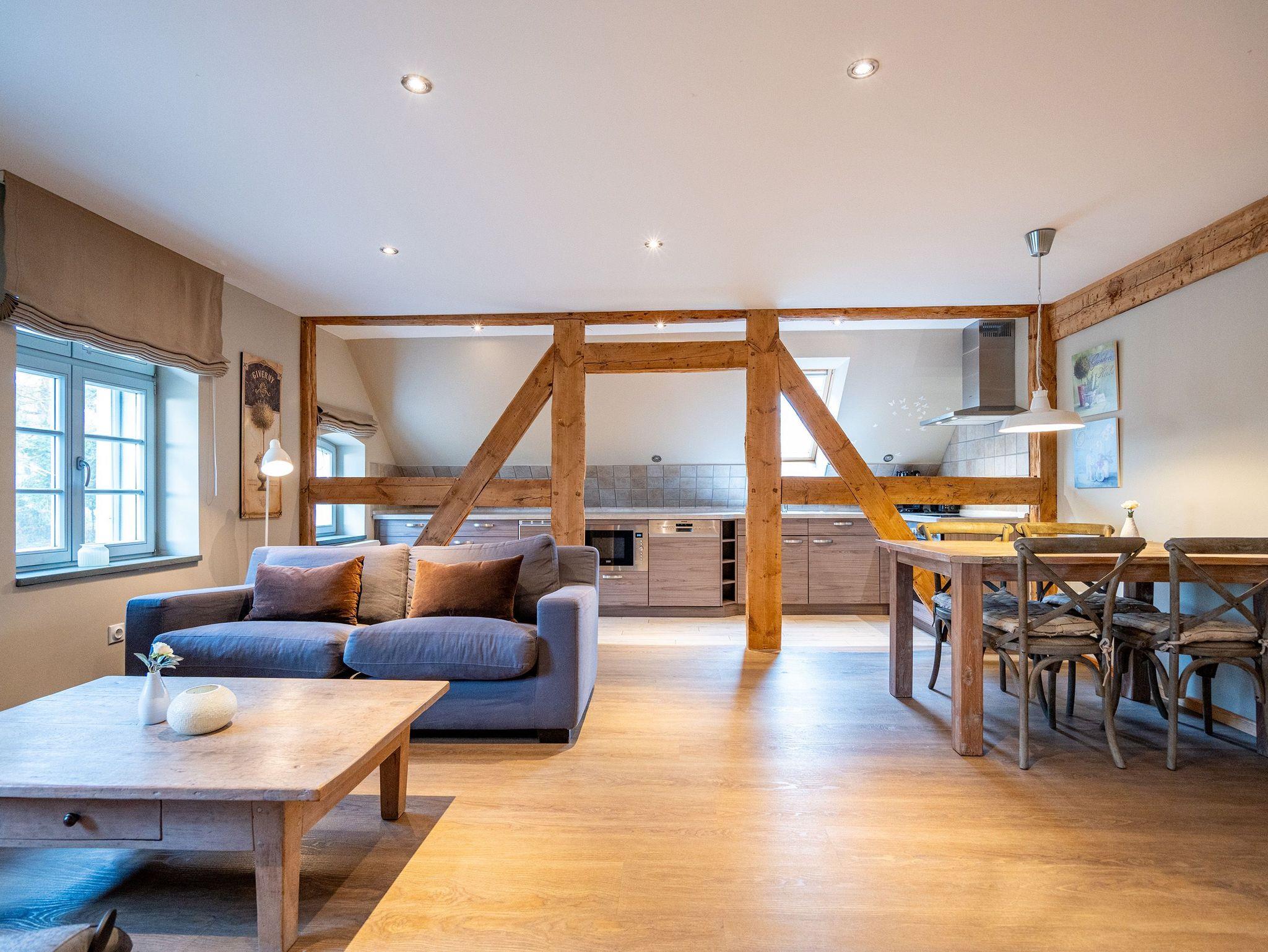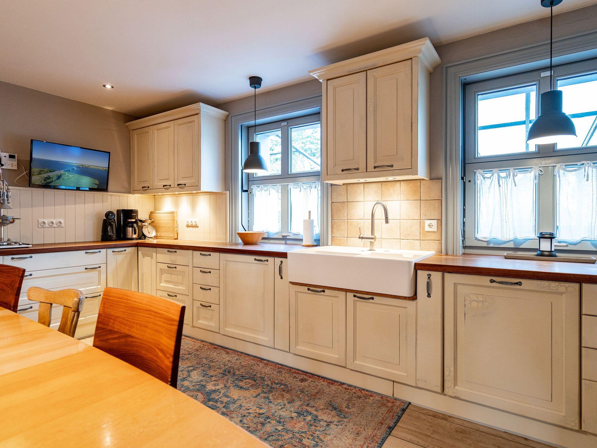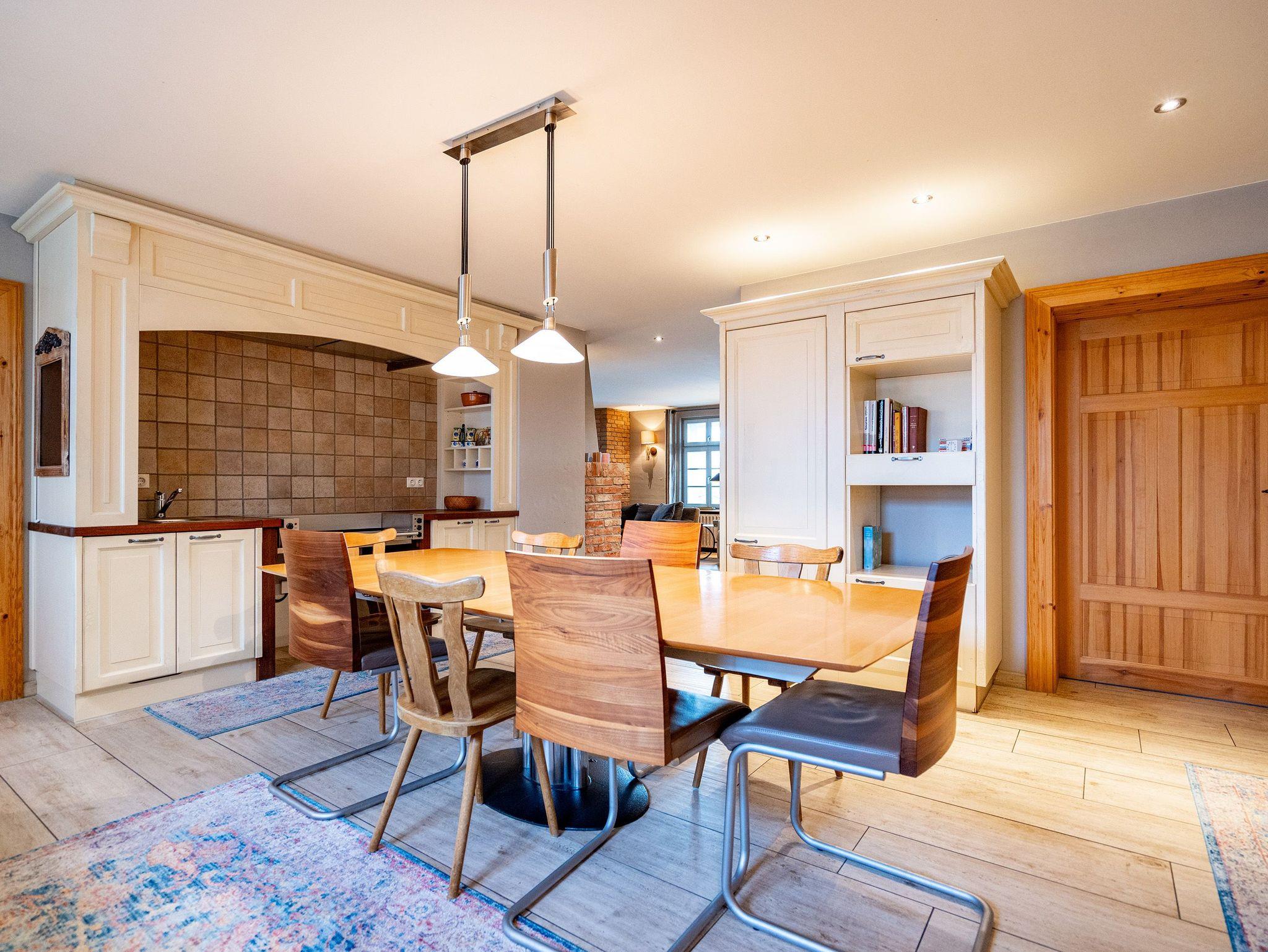 Im Inneren verschmelzen Industriedesign-Möbel mit rustikalen Echtholzmöbeln zu einem modernen und stilvollen Landhausstil. Großzügige Räume im Erdgeschoss ermöglichen gemeinsame Aktivitäten. Vom großzügigen Wohnraum mit offenem Kamin und Flachbildfernseher über urige Steinwände bis zu gemütlichen Sofalandschaften (mit Schlaffunktion) gelangt man zur Hauptküche. Der zentrale Essbereich bietet viel Platz zum Arbeiten und Kochen, sogar auf Induktionsplatten. Alle Geräte wie Spülmaschine, Kühl- und Gefrierschrank, Kaffeemaschine und Backofen stammen von hochwertigen Markenherstellern.