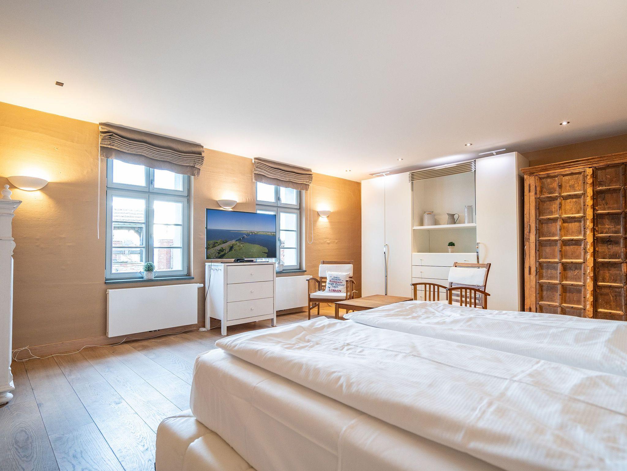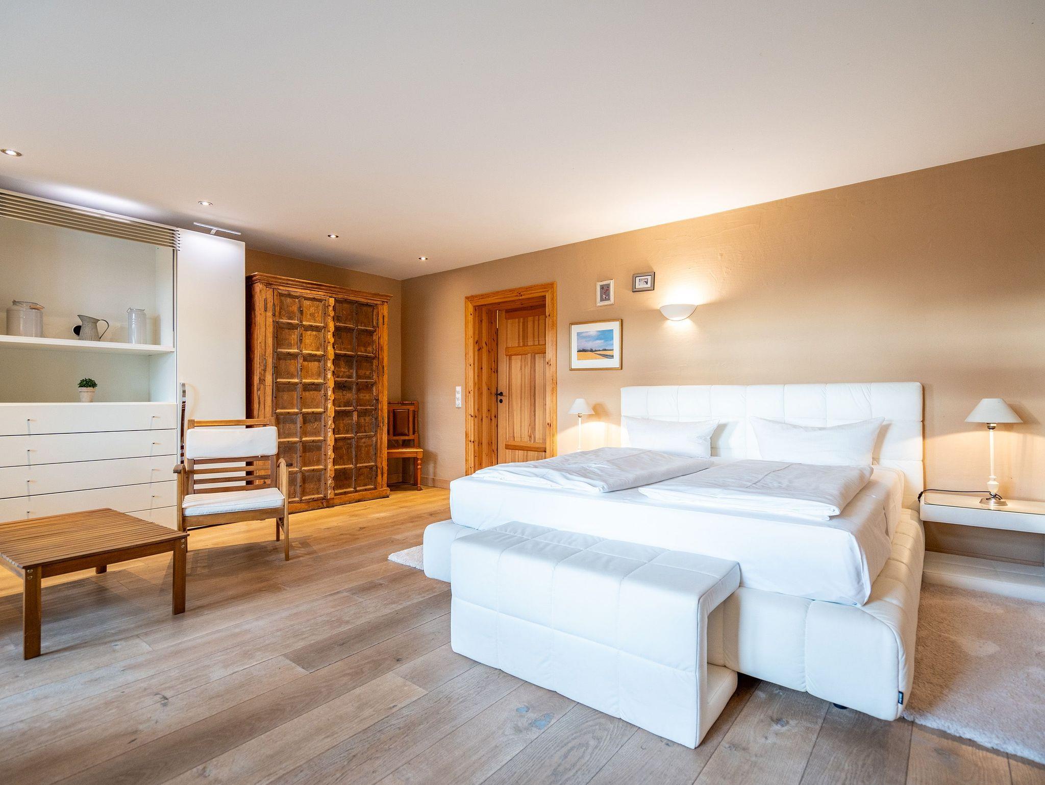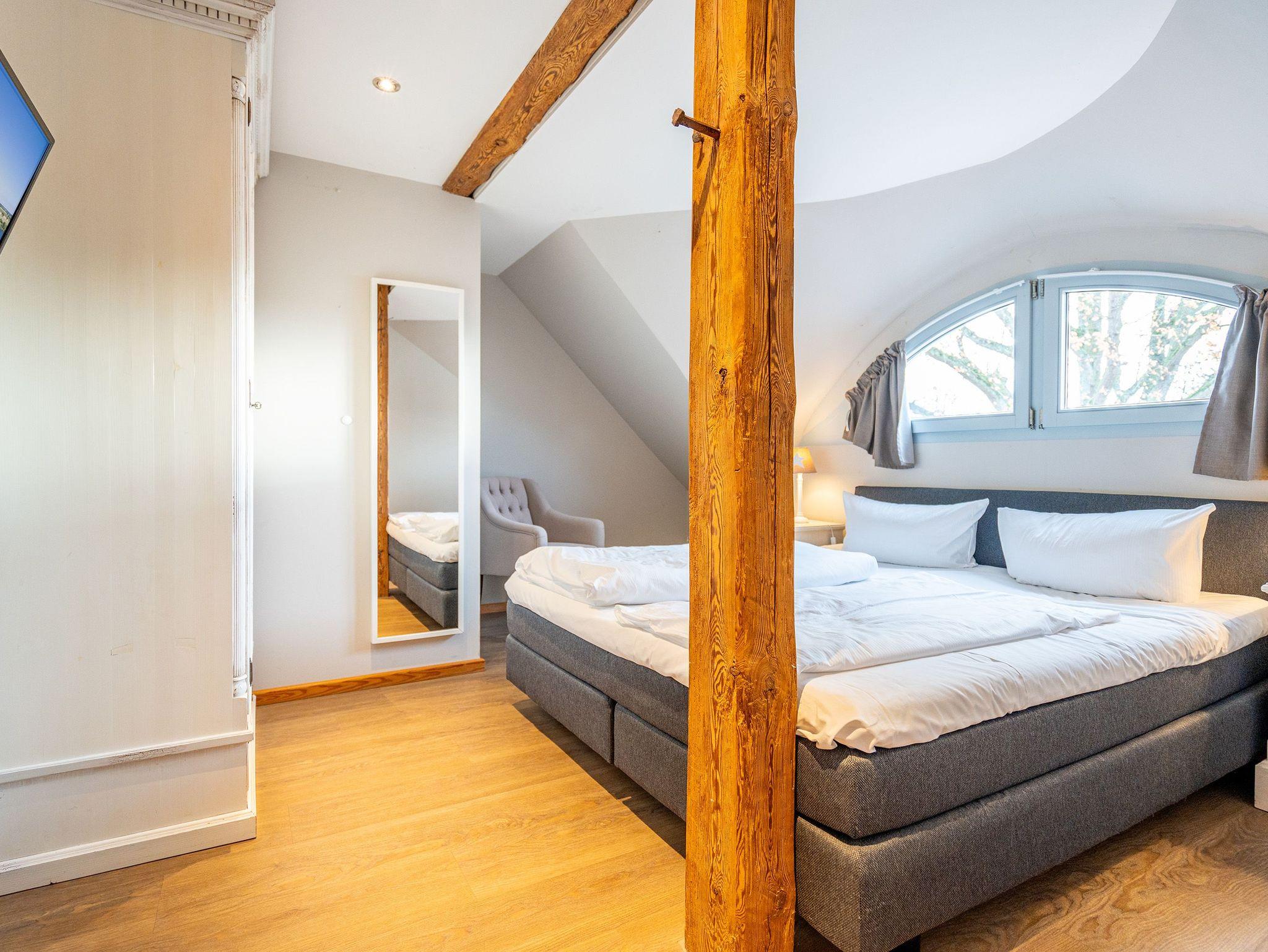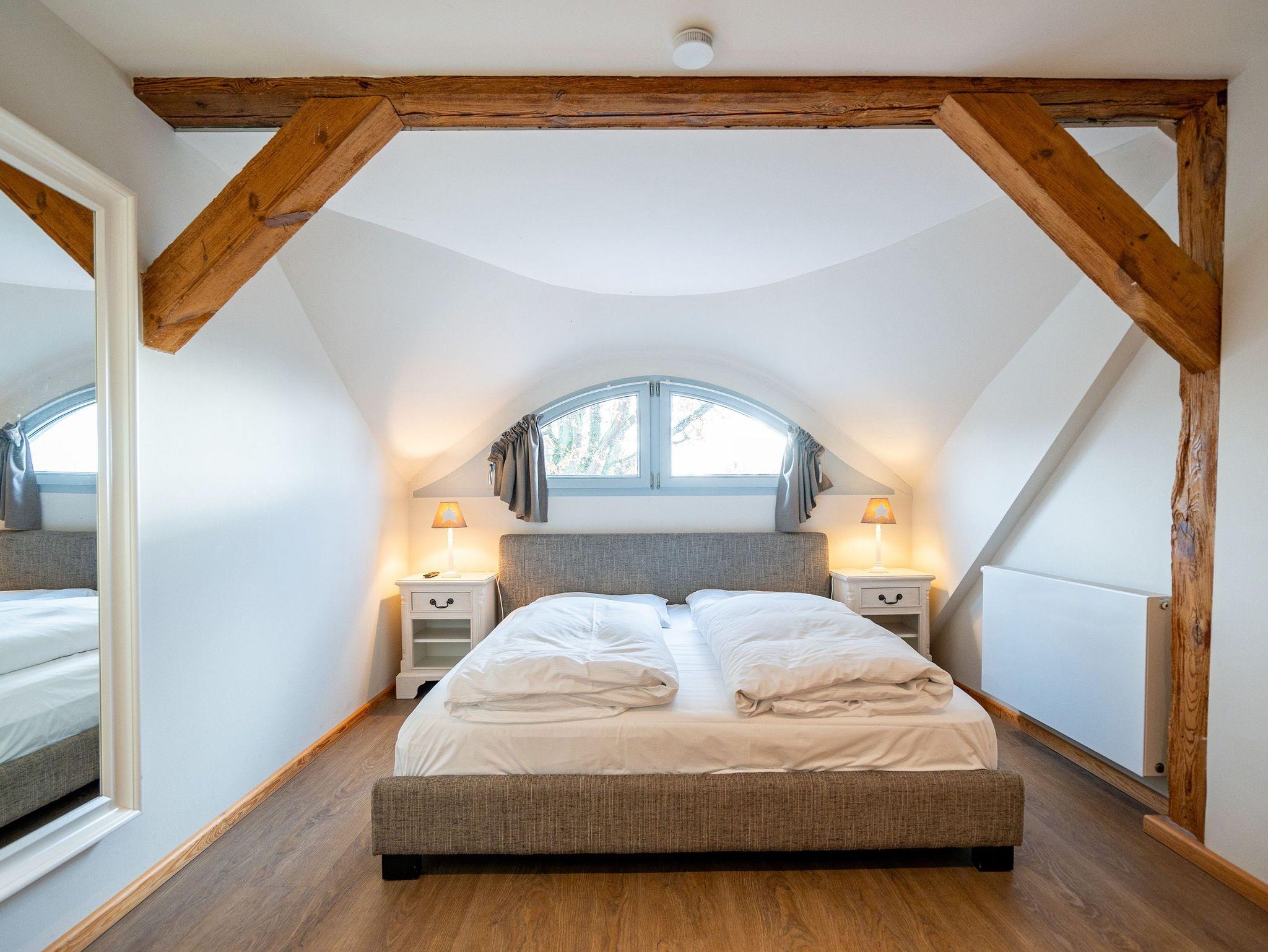 Im Erdgeschoss befinden sich auch zwei Schlafzimmer, eines mit einem großen Doppelboxspringbett (1,80 m x 2,00 m) und einem geräumigen Kleiderschrank, das andere ebenfalls mit einem Doppelboxspringbett (1,80 m x 2,00 m) und einem Zugang zum eigenen Bad mit Dusche und Badewanne, Waschtisch und WC. Ein weiteres Bad mit Dusche und WC befindet sich neben der Küche. Im ausgebauten Dachgeschoss gibt es zur linken Seite zwei Schlafzimmer, eines mit komfortablen Doppelbett (1,80 m x 2,00 m) und ein weiteres als Séparée vom Wohnzimmer aus mit zwei Einzelbetten (je 0,80 m x 2,20 m). Im Wohnbereich befindet sich ein Sofa, ein Essplatz sowie eine offene voll ausgestattete Küchenzeile (mit Backofen, Mikrowelle und Spülmaschine). Das Bad beinhaltet eine Duschbadewanne, Waschtisch und WC. Hier oben zur rechten Seite befinden sich außerdem drei weitere Schlafzimmer mit Doppelbetten sowie zwei Bäder - eines mit Badewanne und das andere mit Dusche, Waschbecken und WC.