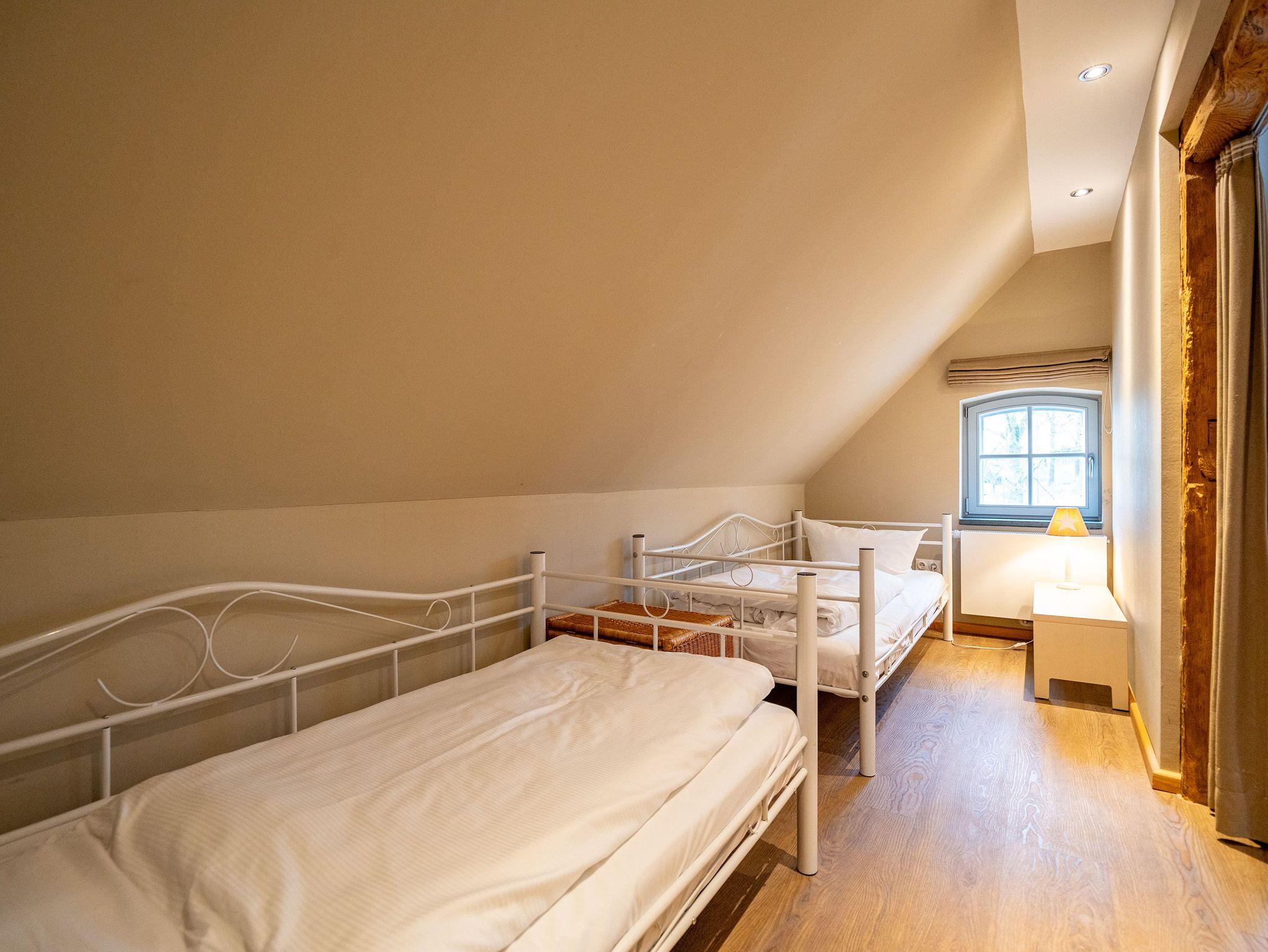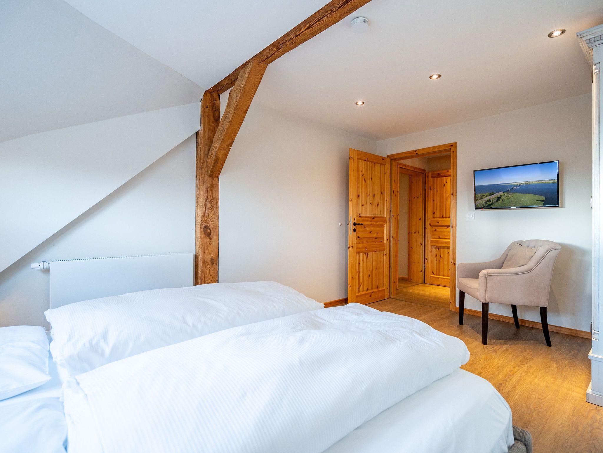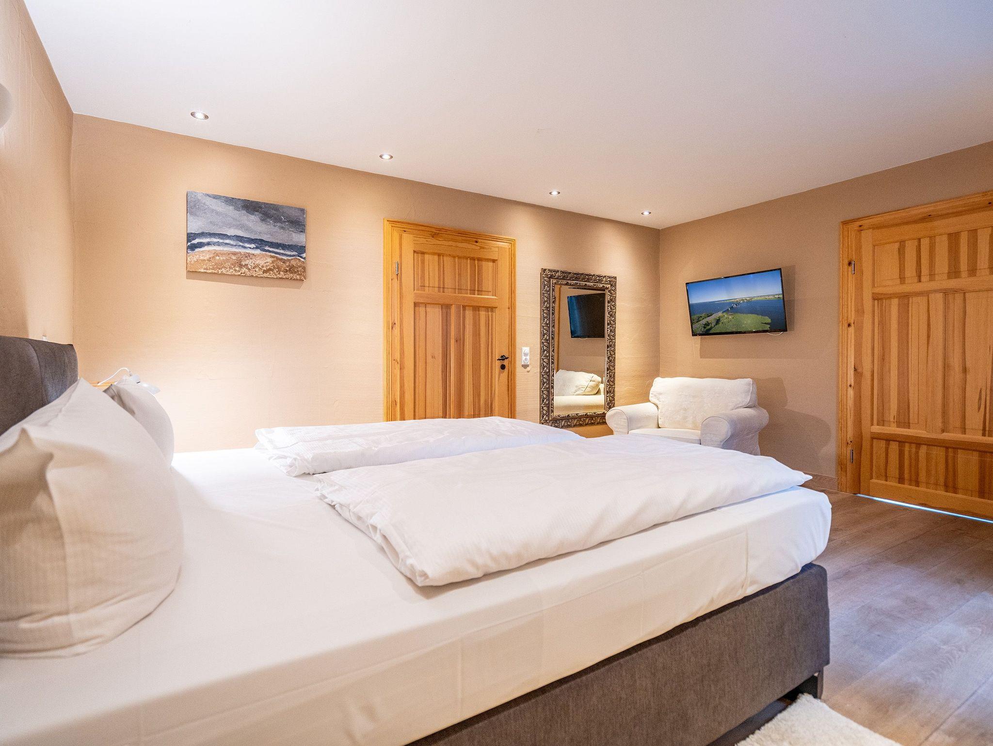 Im Erdgeschoss befinden sich auch zwei Schlafzimmer, eines mit einem großen Doppelboxspringbett (1,80 m x 2,00 m) und einem geräumigen Kleiderschrank, das andere ebenfalls mit einem Doppelboxspringbett (1,80 m x 2,00 m) und einem Zugang zum eigenen Bad mit Dusche und Badewanne, Waschtisch und WC. Ein weiteres Bad mit Dusche und WC befindet sich neben der Küche. Im ausgebauten Dachgeschoss gibt es zur linken Seite zwei Schlafzimmer, eines mit komfortablen Doppelbett (1,80 m x 2,00 m) und ein weiteres als Séparée vom Wohnzimmer aus mit zwei Einzelbetten (je 0,80 m x 2,20 m). Im Wohnbereich befindet sich ein Sofa, ein Essplatz sowie eine offene voll ausgestattete Küchenzeile (mit Backofen, Mikrowelle und Spülmaschine). Das Bad beinhaltet eine Duschbadewanne, Waschtisch und WC. Hier oben zur rechten Seite befinden sich außerdem drei weitere Schlafzimmer mit Doppelbetten sowie zwei Bäder - eines mit Badewanne und das andere mit Dusche, Waschbecken und WC.