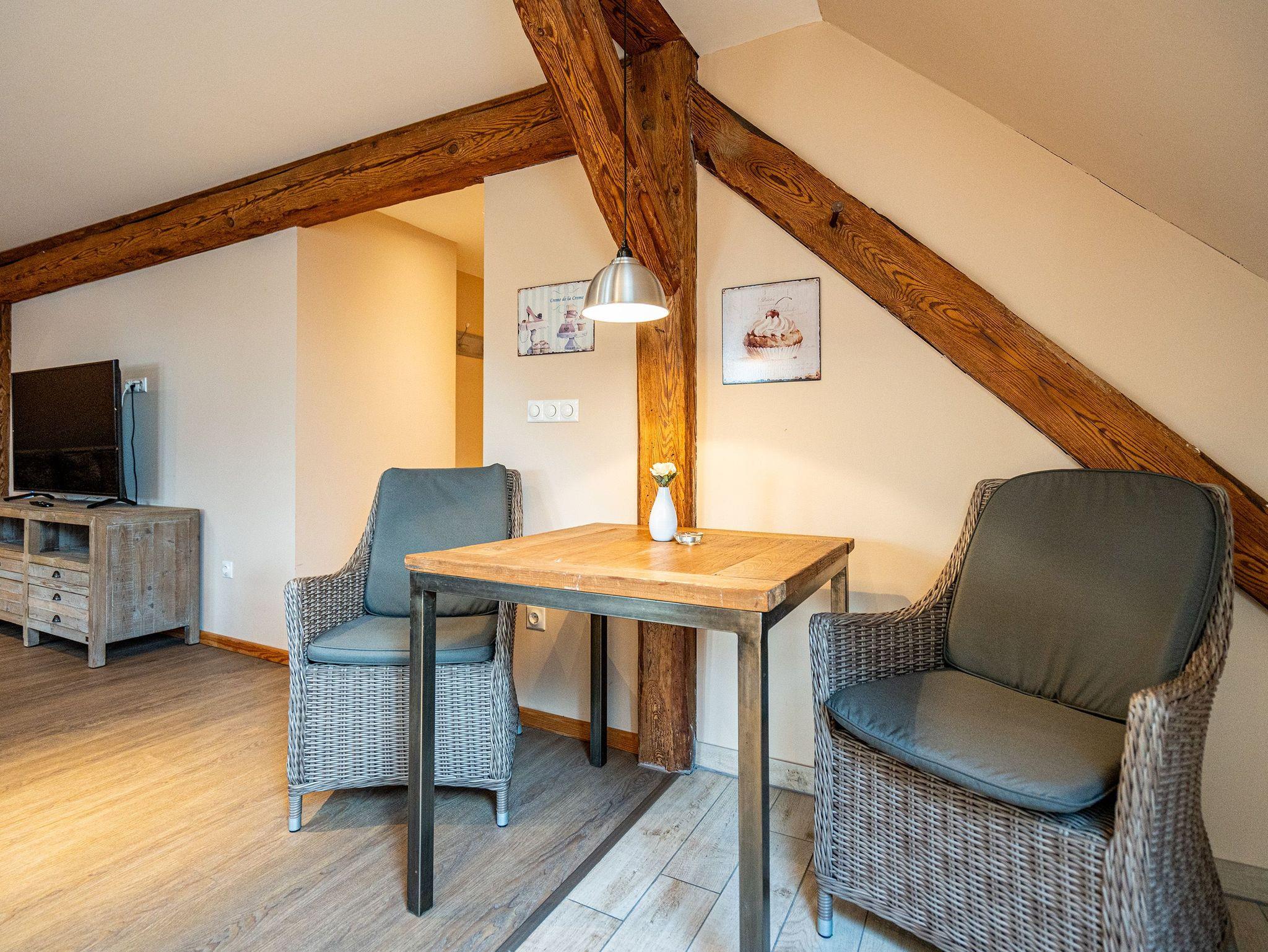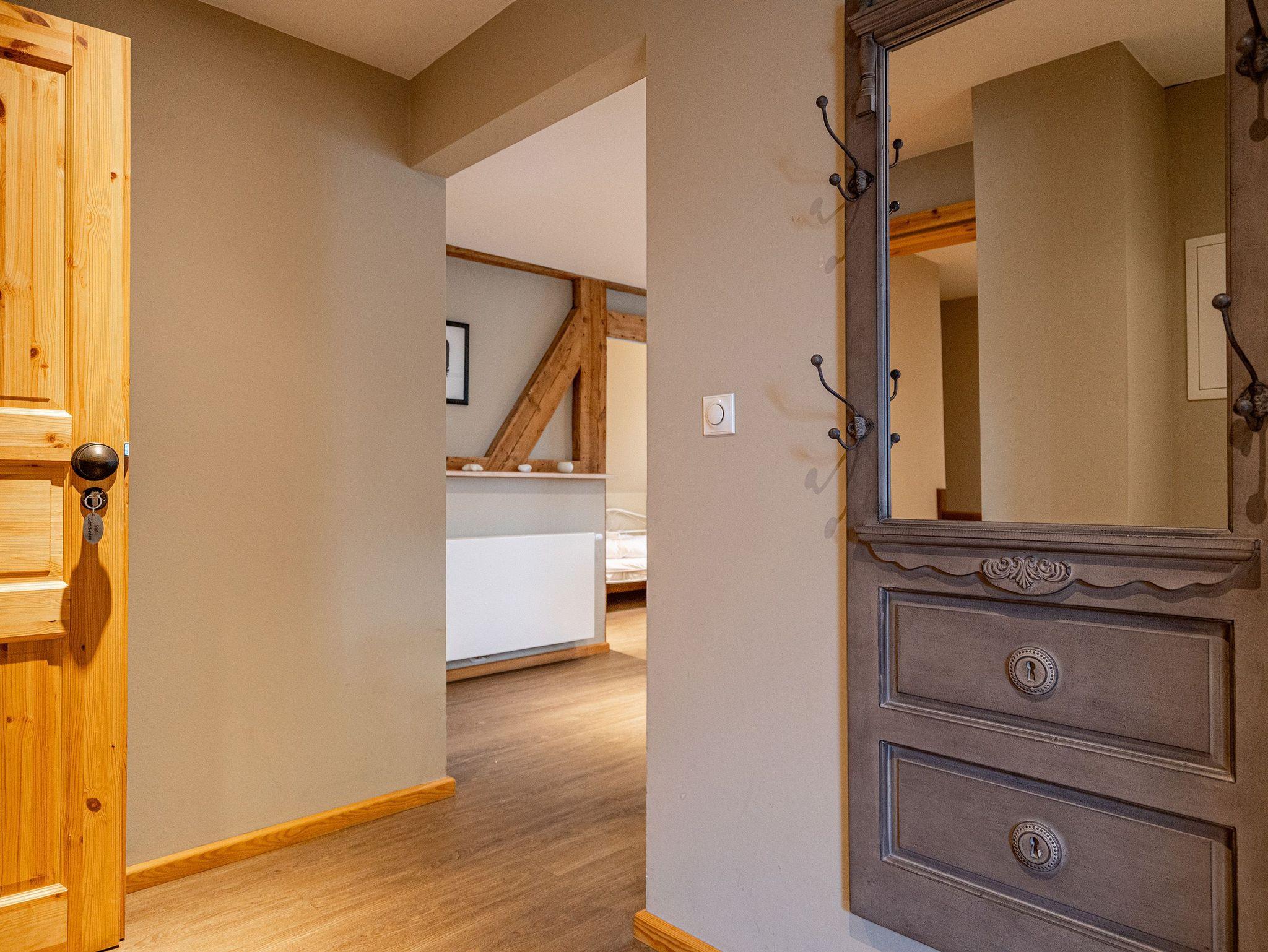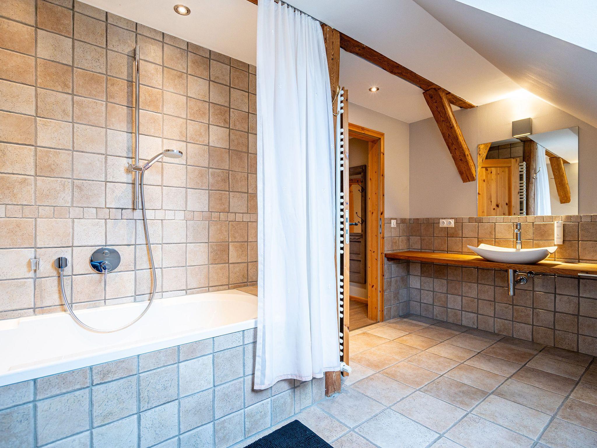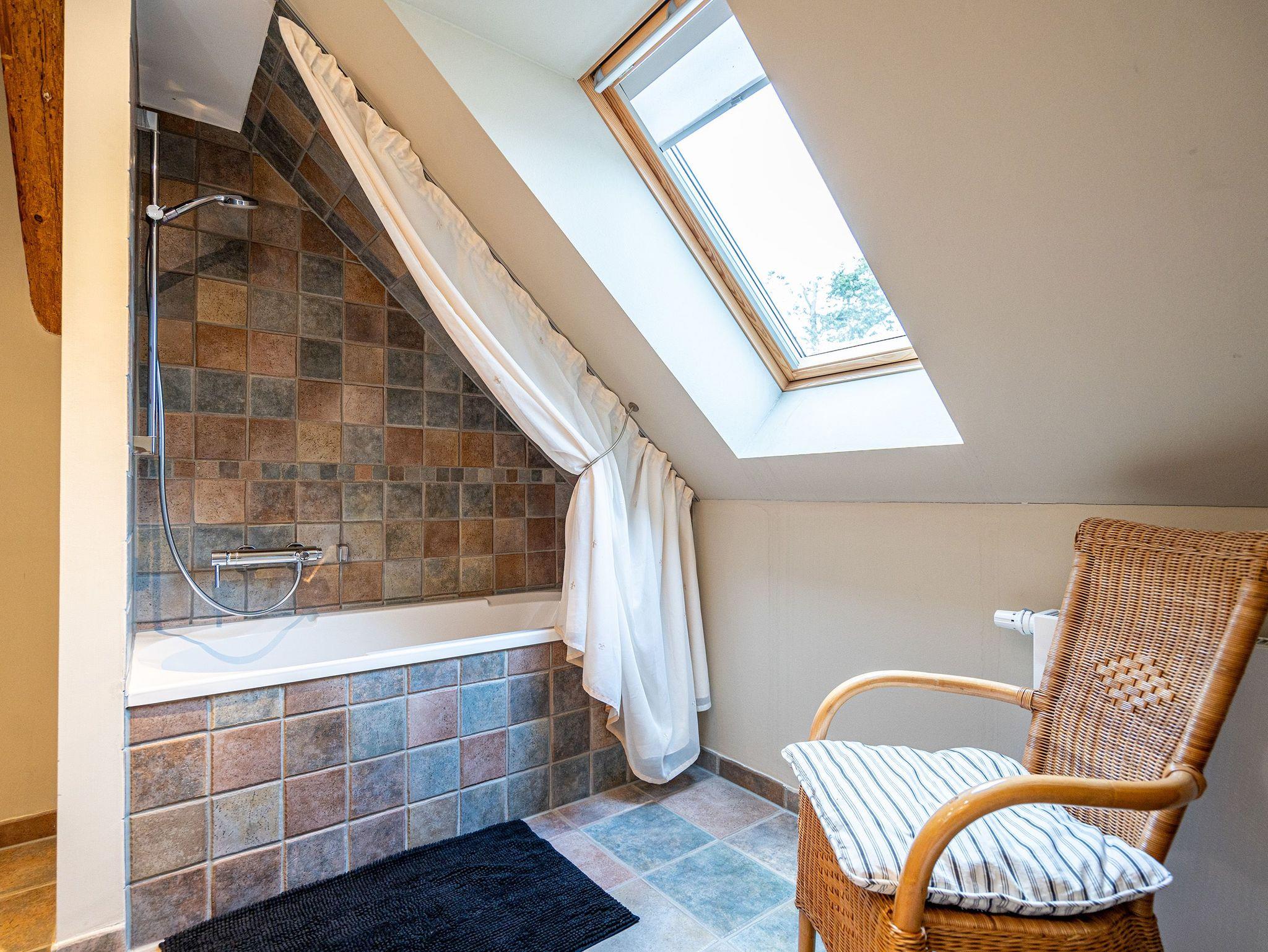 Im Erdgeschoss befinden sich auch zwei Schlafzimmer, eines mit einem großen Doppelboxspringbett (1,80 m x 2,00 m) und einem geräumigen Kleiderschrank, das andere ebenfalls mit einem Doppelboxspringbett (1,80 m x 2,00 m) und einem Zugang zum eigenen Bad mit Dusche und Badewanne, Waschtisch und WC. Ein weiteres Bad mit Dusche und WC befindet sich neben der Küche. Im ausgebauten Dachgeschoss gibt es zur linken Seite zwei Schlafzimmer, eines mit komfortablen Doppelbett (1,80 m x 2,00 m) und ein weiteres als Séparée vom Wohnzimmer aus mit zwei Einzelbetten (je 0,80 m x 2,20 m). Im Wohnbereich befindet sich ein Sofa, ein Essplatz sowie eine offene voll ausgestattete Küchenzeile (mit Backofen, Mikrowelle und Spülmaschine). Das Bad beinhaltet eine Duschbadewanne, Waschtisch und WC. Hier oben zur rechten Seite befinden sich außerdem drei weitere Schlafzimmer mit Doppelbetten sowie zwei Bäder - eines mit Badewanne und das andere mit Dusche, Waschbecken und WC.