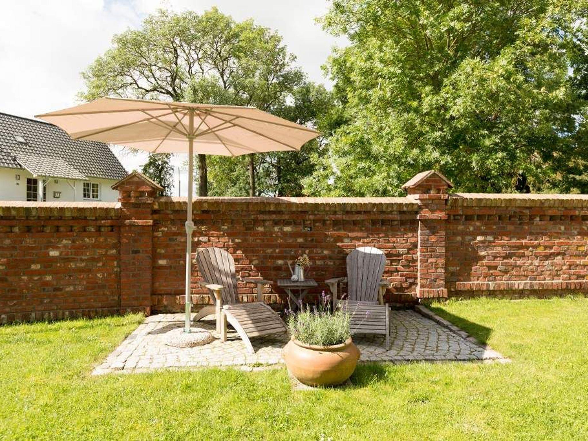 Hinter dem Haus erwartet Sie eine 45 Quadratmeter große Sonnenterrasse mit einem riesigen Sonnenschirm für Sonnenanbeter. Im gesamten Garten gibt es bequeme Liegen, um die nötige Portion Sonnenlicht zu tanken. Grillfreunde können ihren Appetit am Außengrill stillen.